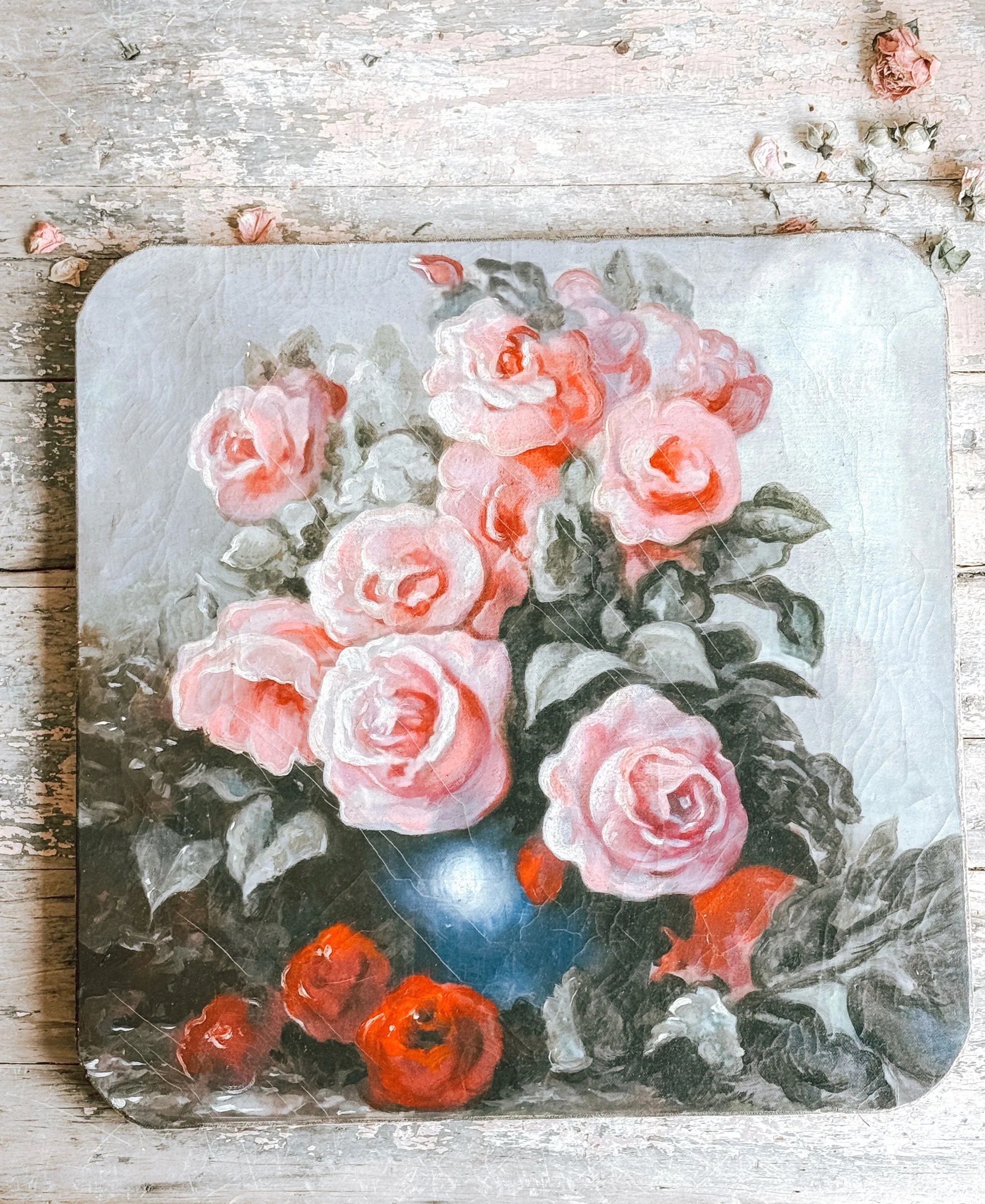 Softly romantic in palette, the composition blends blush, cream, and deep rose tones against a muted blue background—creating a piece that feels both timeless and quietly dramatic.