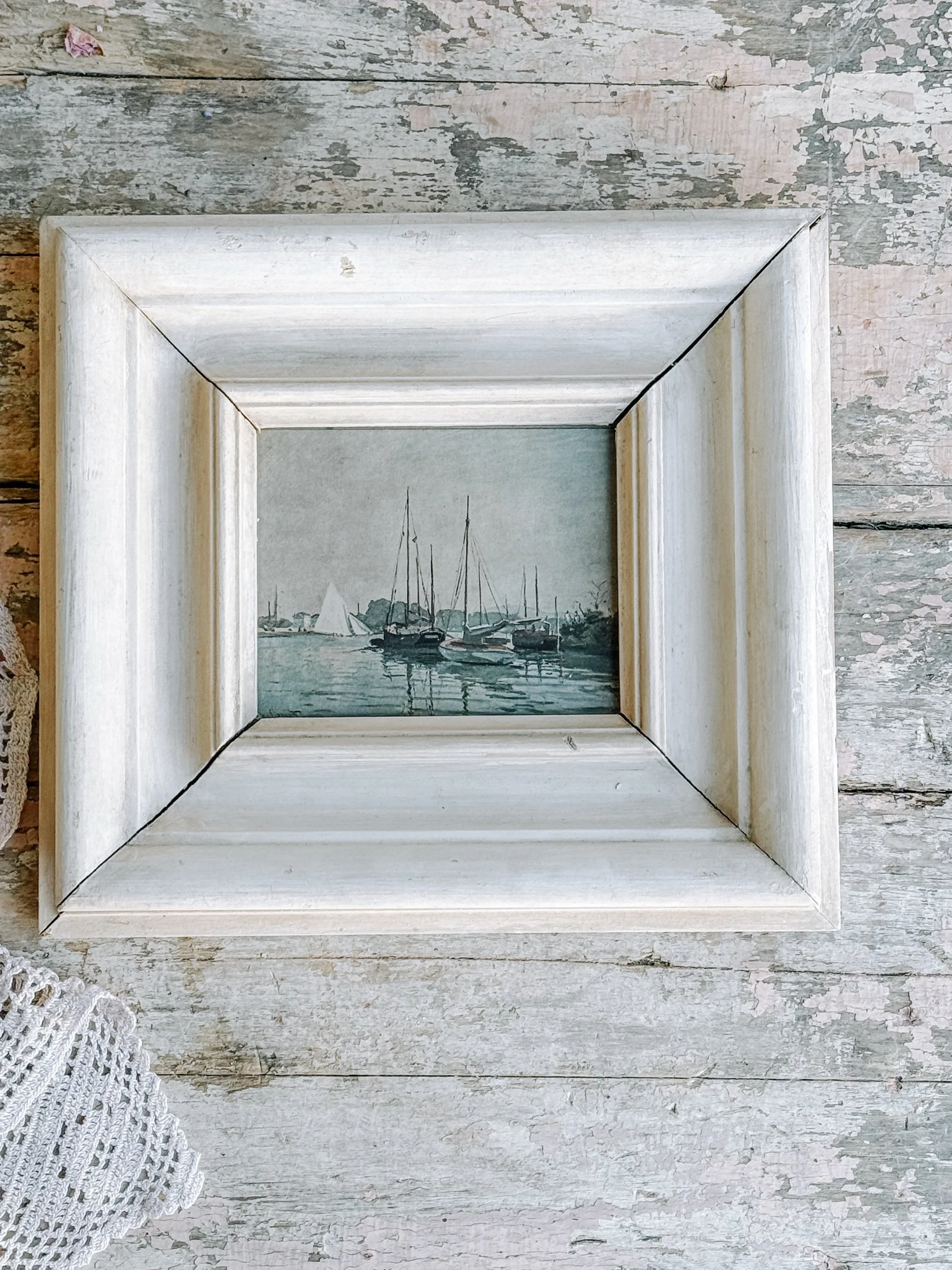 A softly toned vintage coastal print featuring a quiet harbor scene with sailboats resting along still water. The palette is muted and calming—washed greys and soft blue-greens that bring a sense of stillness and ease.