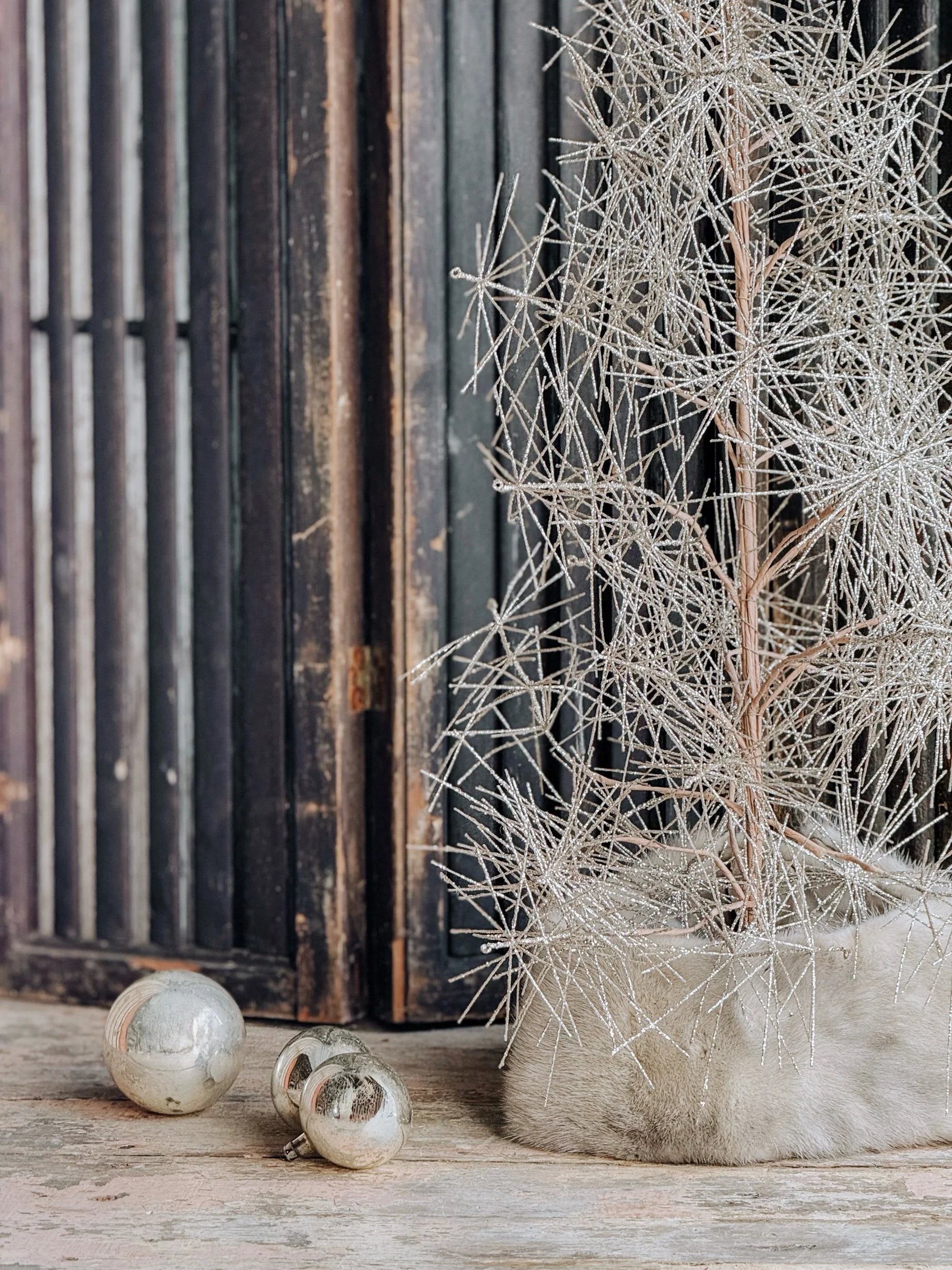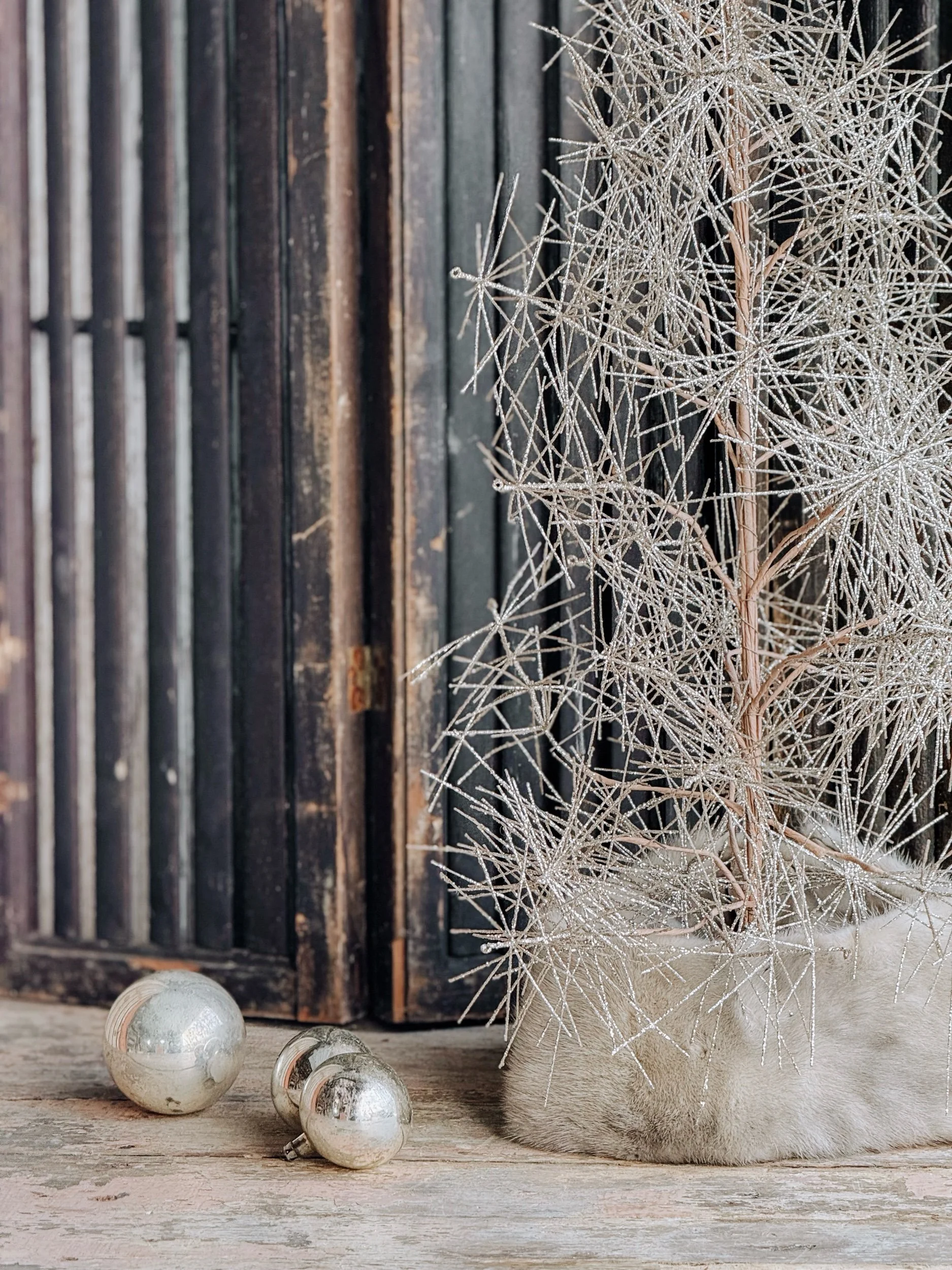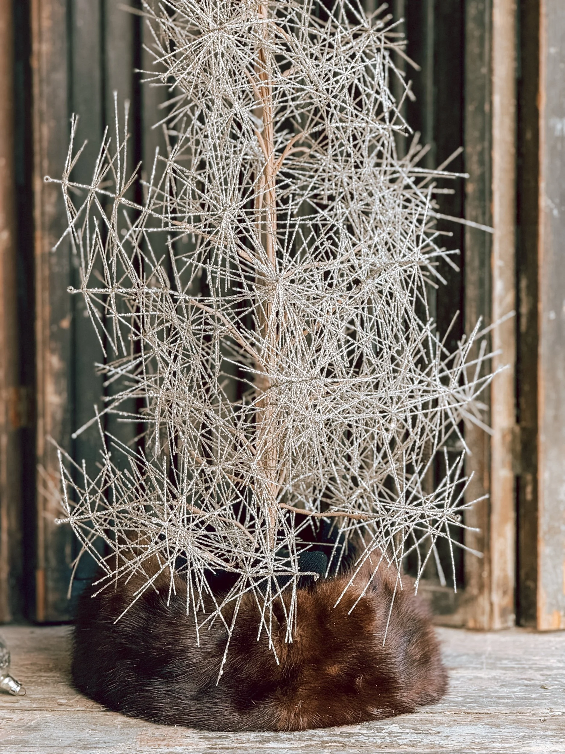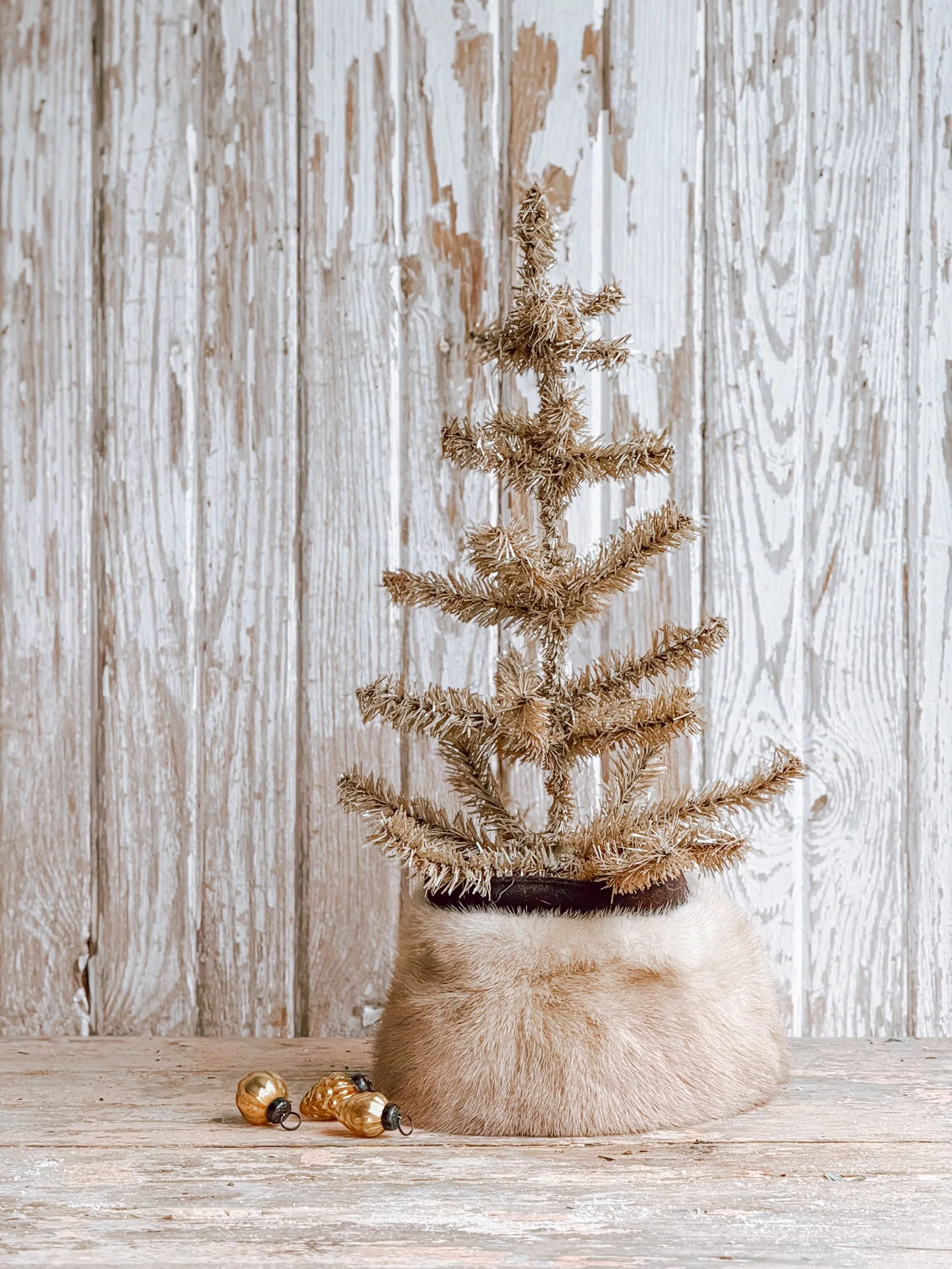 Vintage French Mocha Tinsel Tree w/ Vintage Fur Tree Skirt