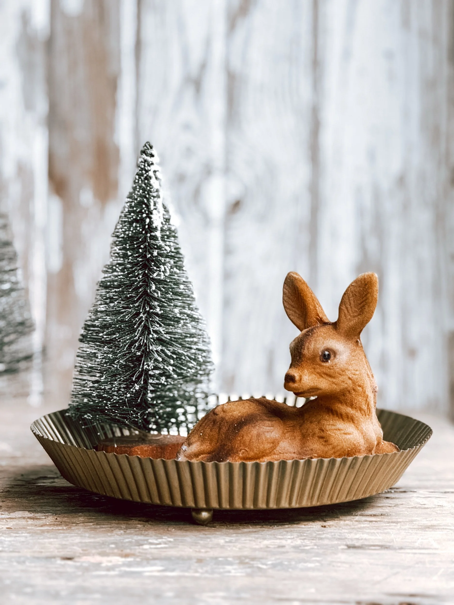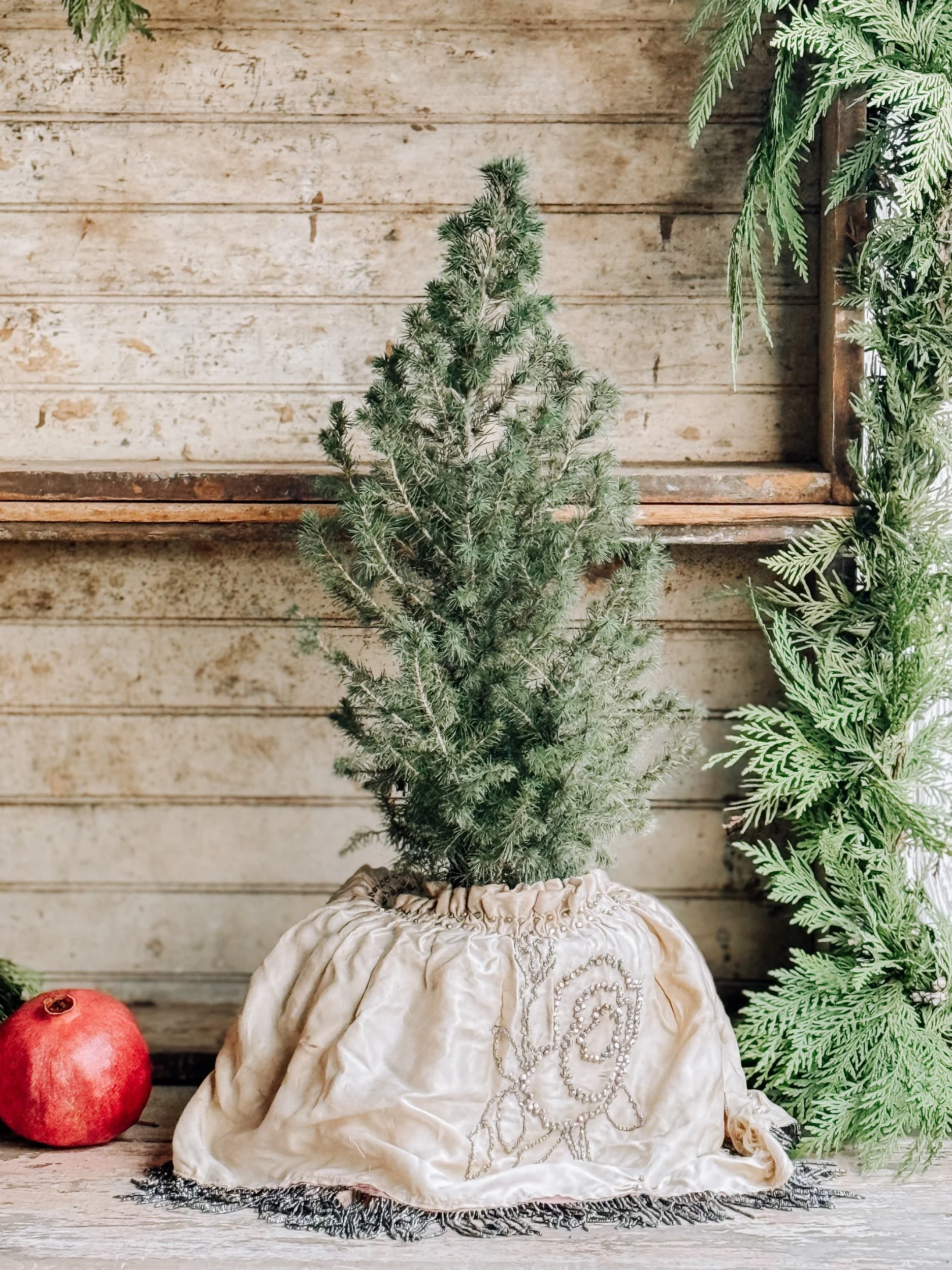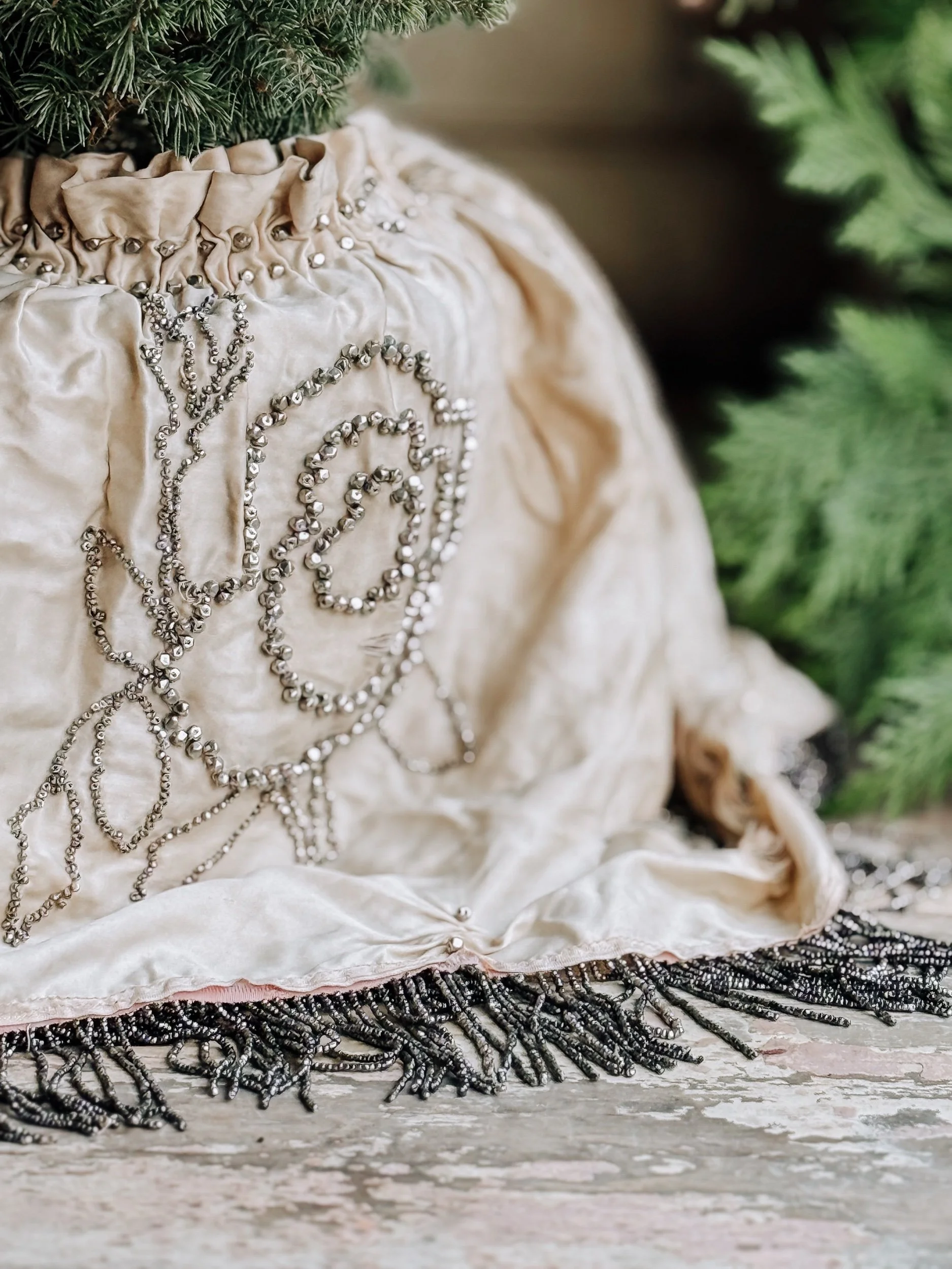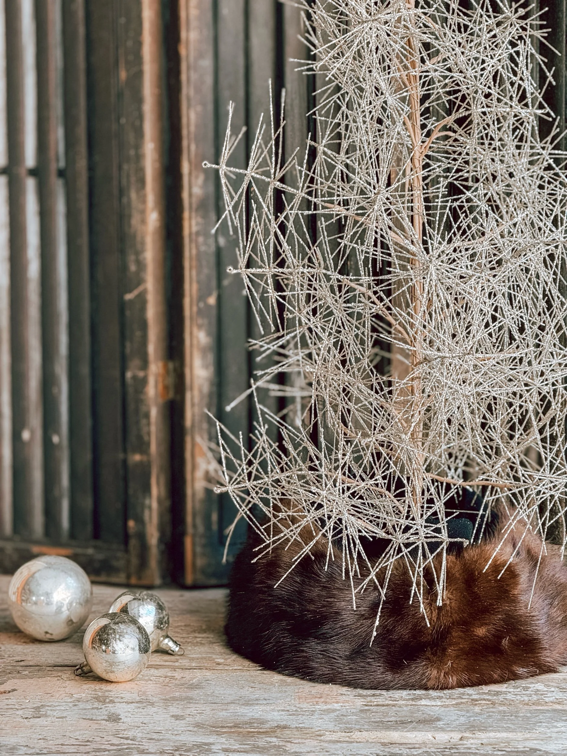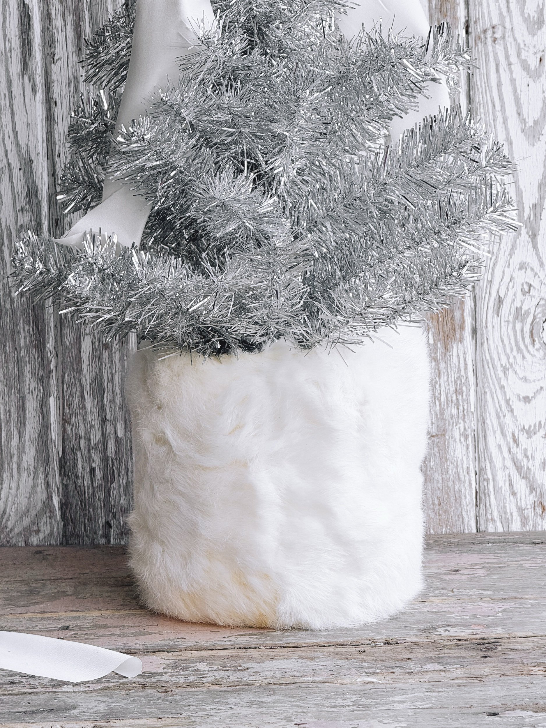 Vintage French Mocha Tinsel Tree w/ Vintage Fur Tree Skirt