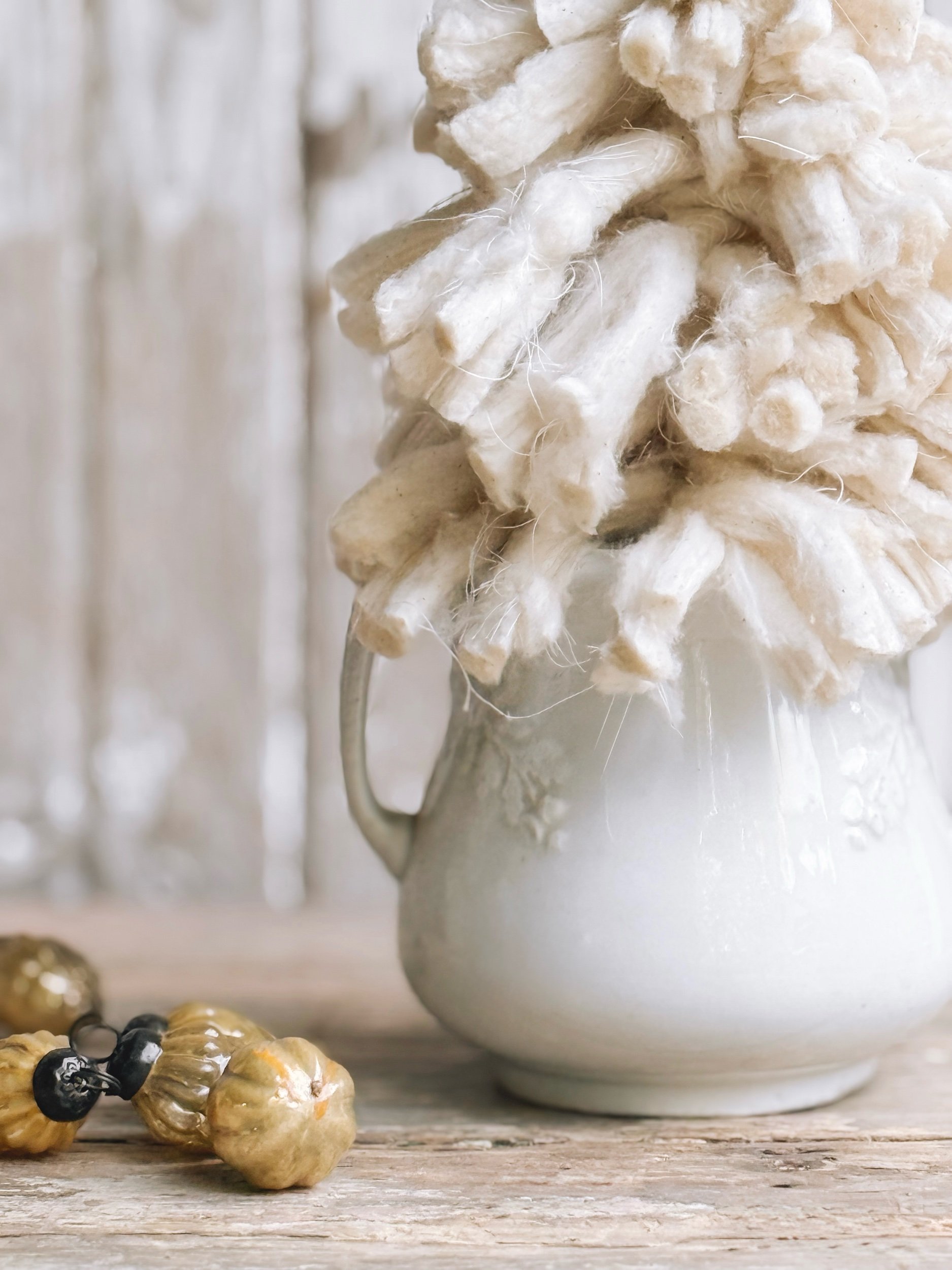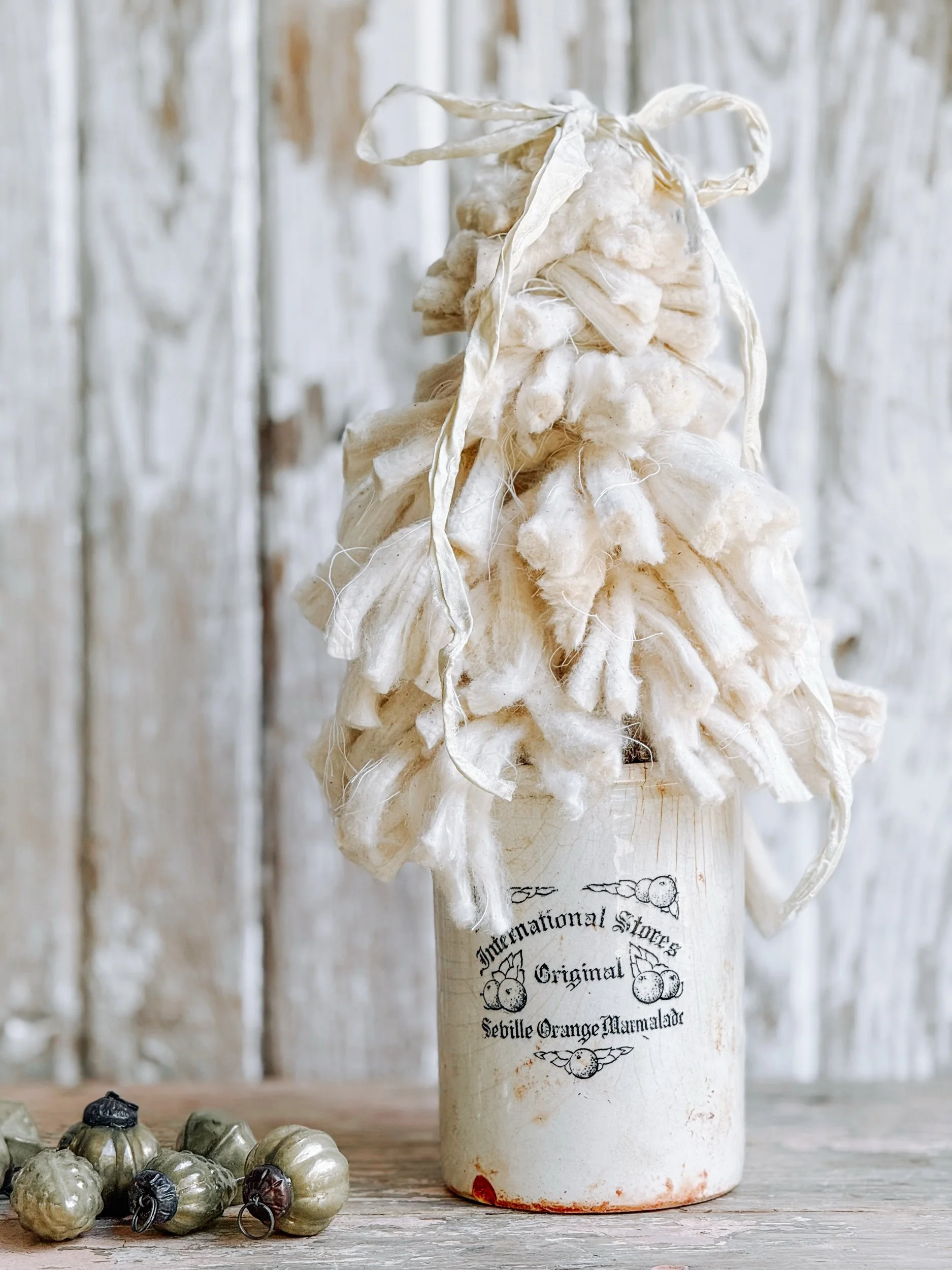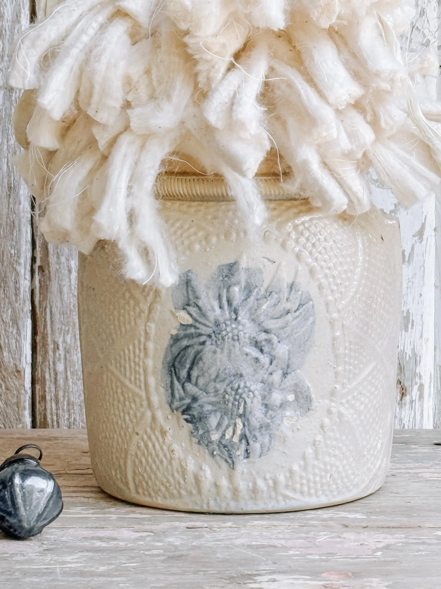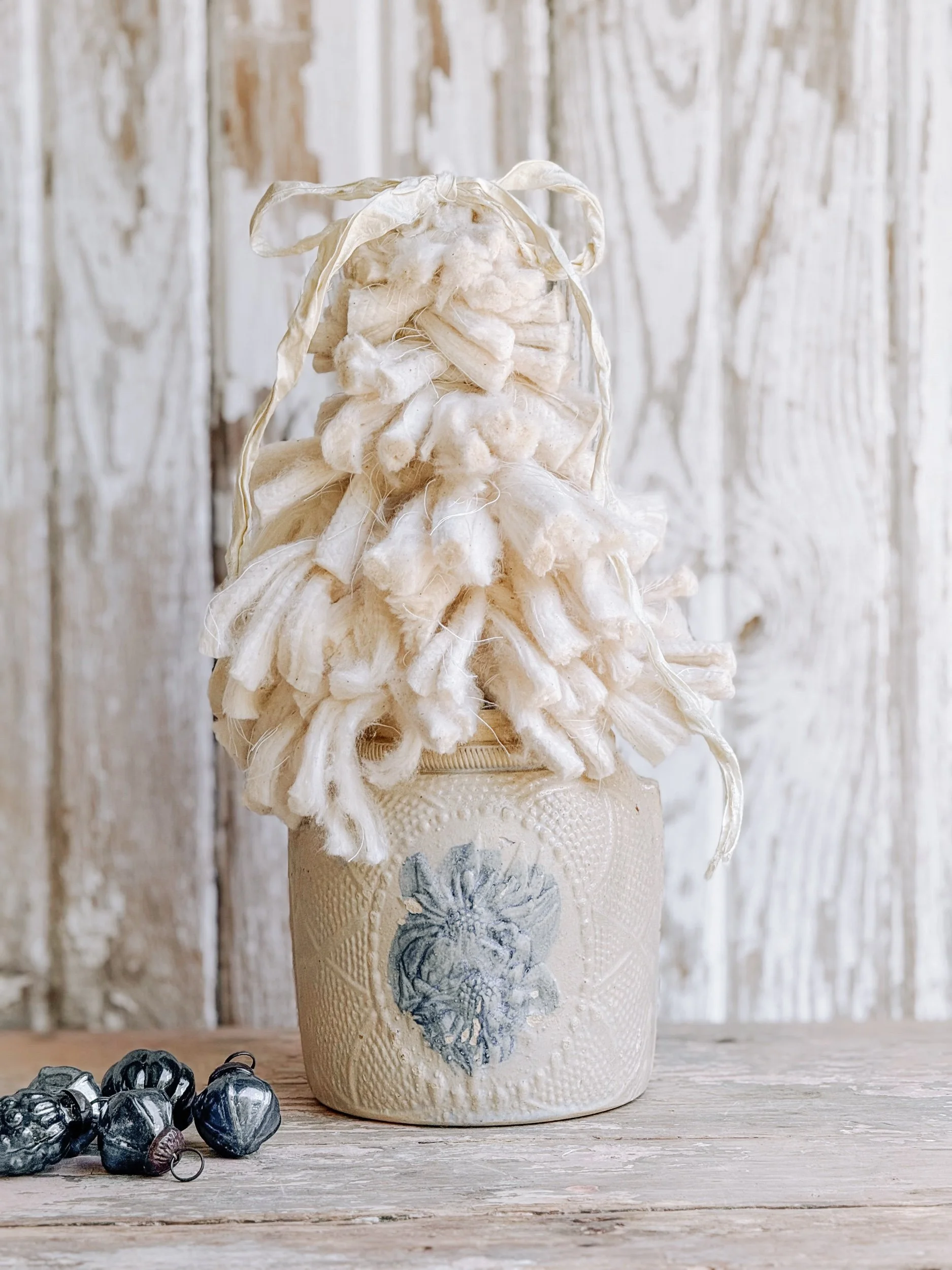 Antique English Ironstone Crock w/ Handmade Creamy Yarn Tree