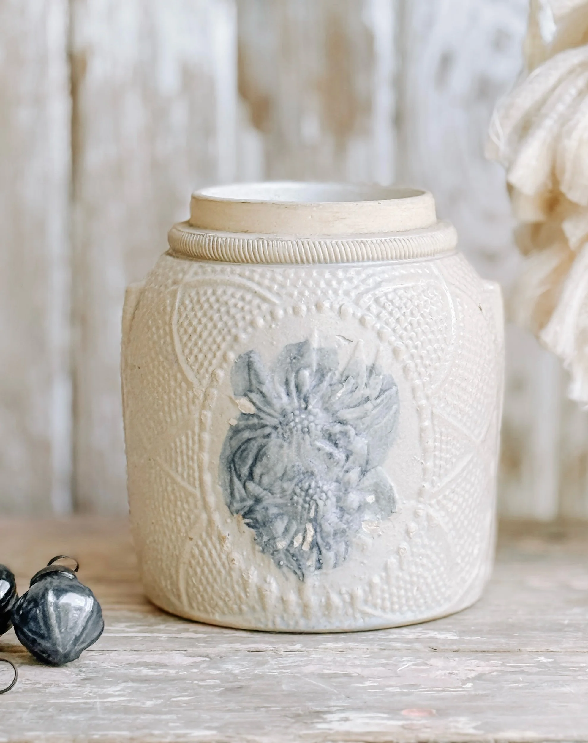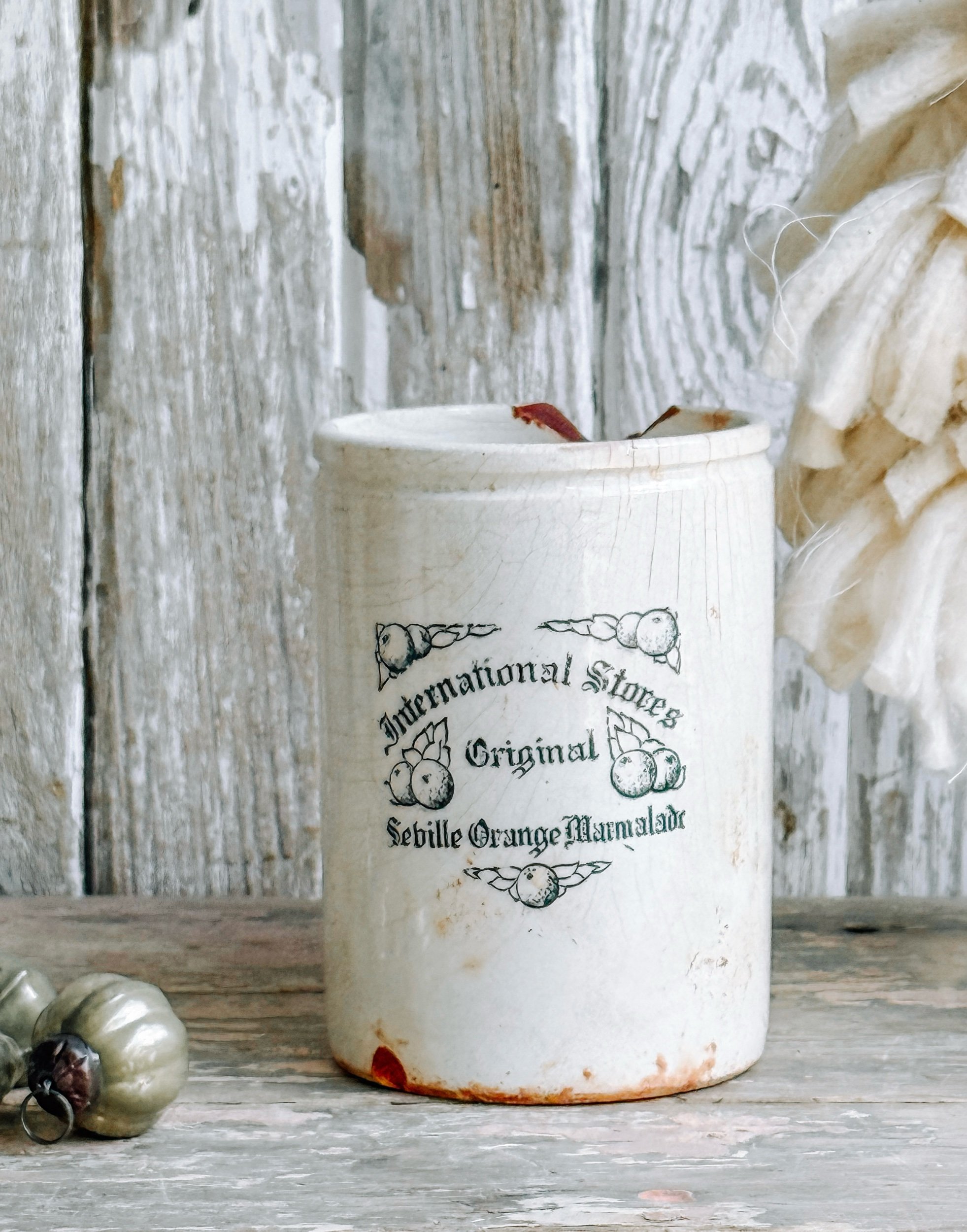 Rare Antique English Ironstone Marmalade Jar w/ Handmade Creamy Yarn Tree