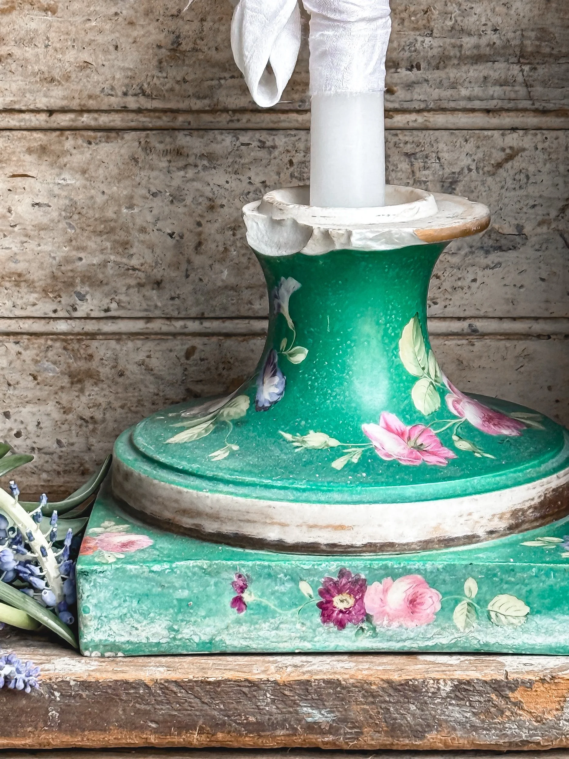 A beautifully aged Victorian candleholder featuring a soft matte porcelain finish in the most charming timeworn green. Delicate hand-painted florals wrap the base, each one gently faded with age, giving this piece its unmistakable antique character.