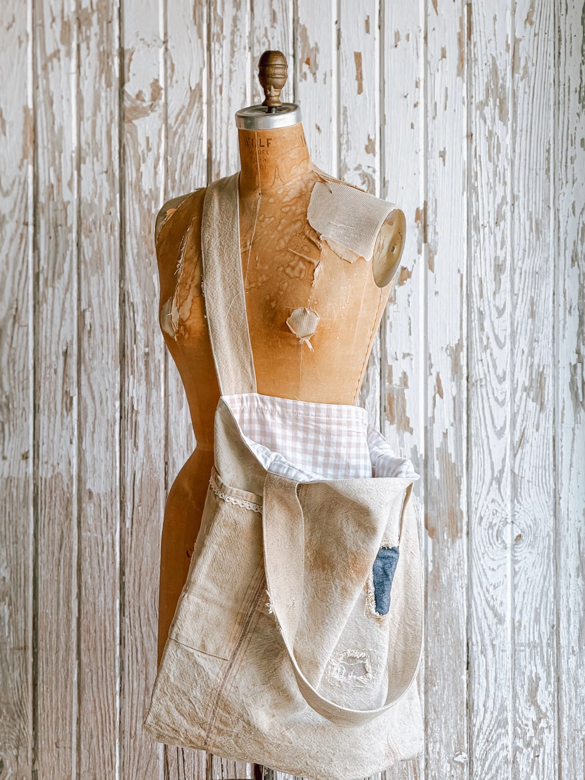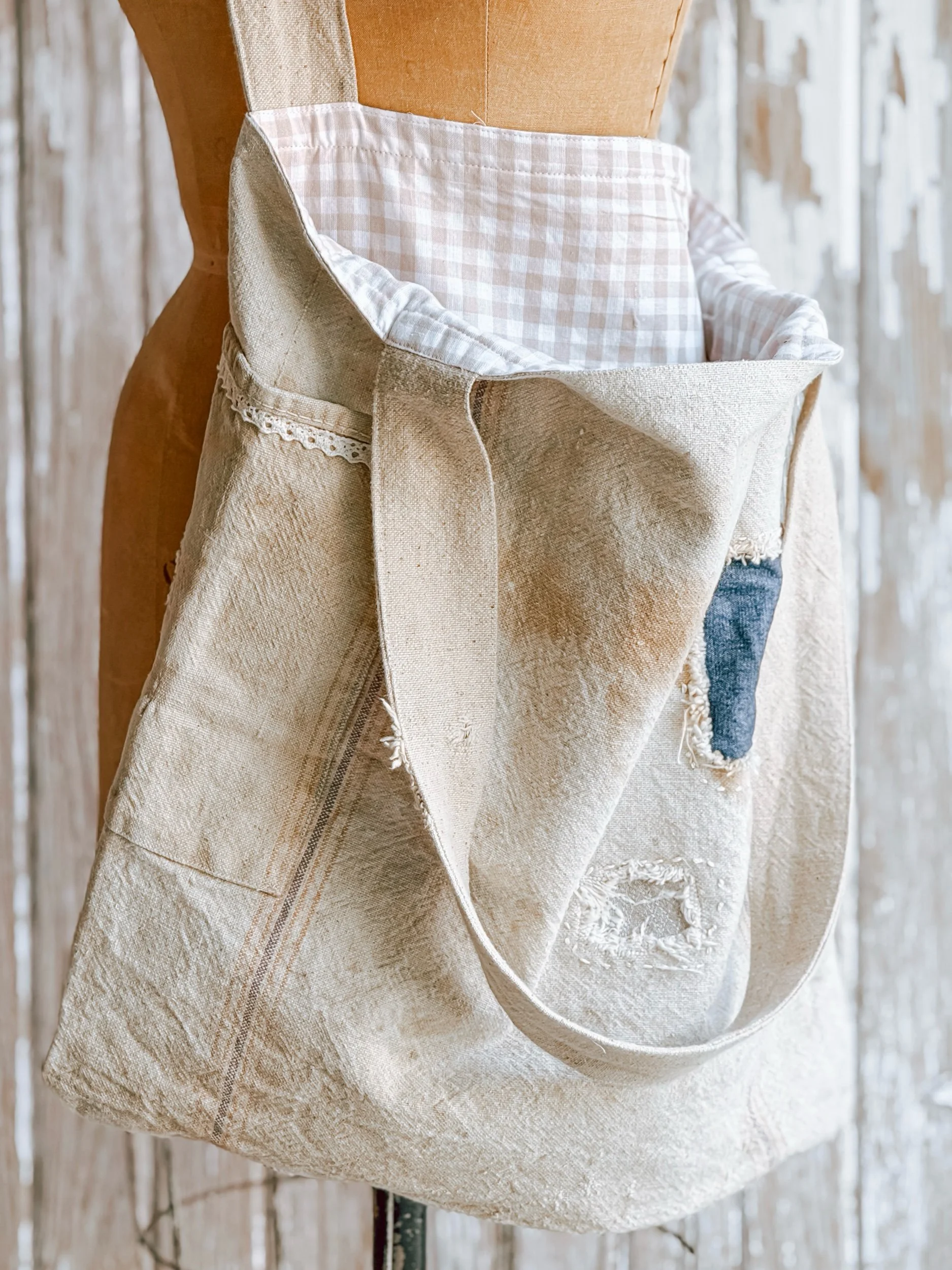 Discover the timeless charm of our handmade antique grain sack tote, expertly crafted with meticulous hand stitching. This unique piece features a classic gingham lining that adds a subtle touch of vintage flair. Durable yet stylish, it’s perfect for everyday use or as a statement accessory to complement any outfit. Each tote carries a piece of history, blending rustic heritage with modern functionality. Purse body: 19 × 20 inches