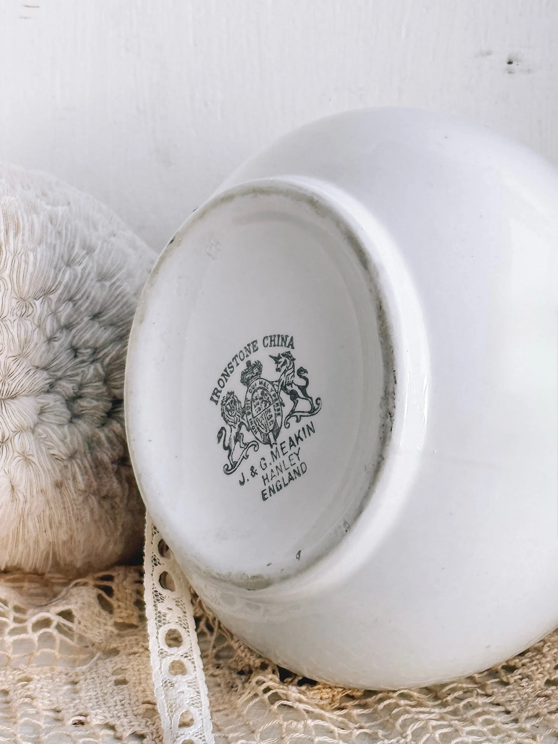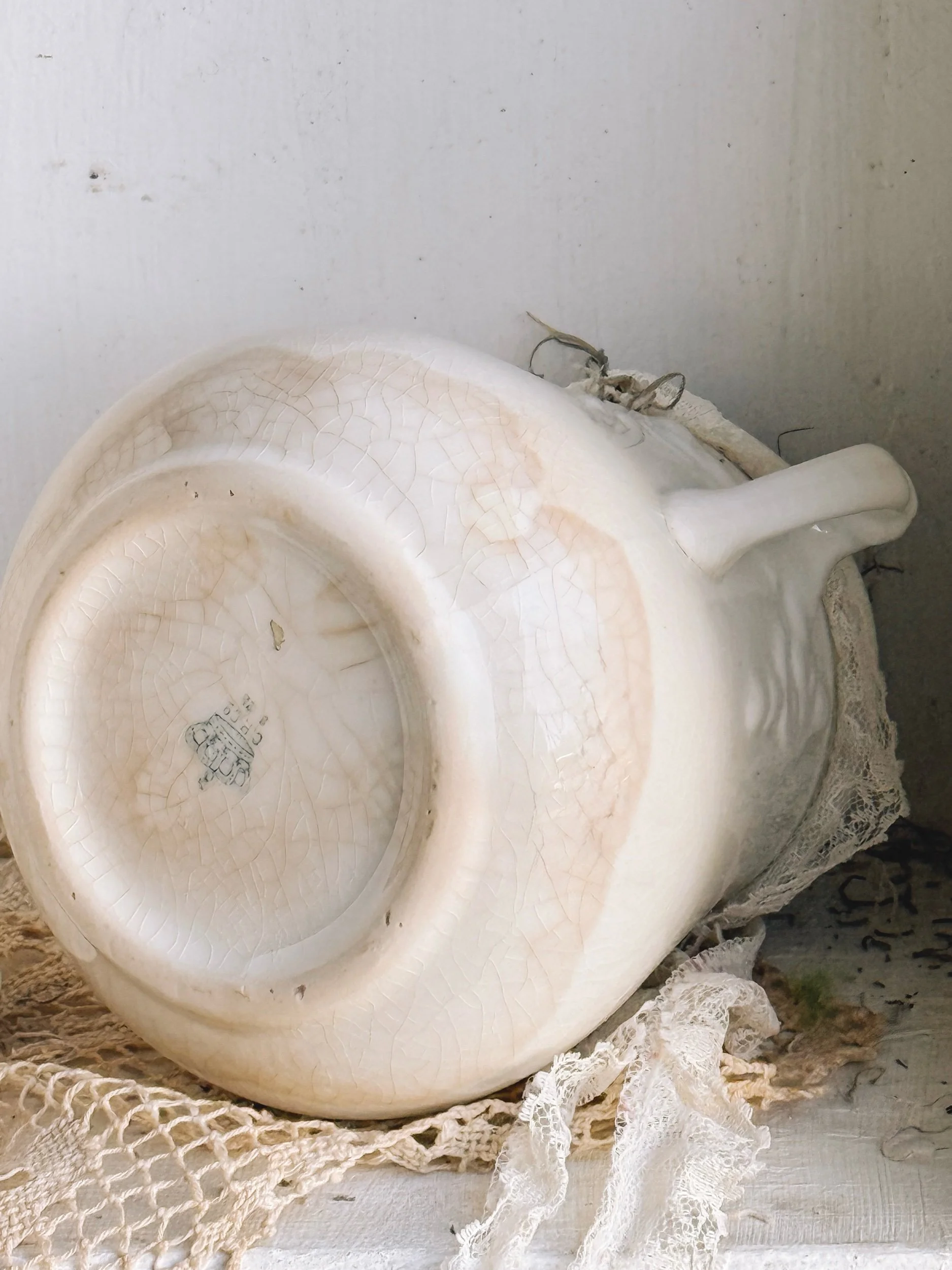 The creamy white glaze is enriched with time, showing gentle patina and warm staining along the base—giving this piece a deeply lived-in, collected feel. Stamped on the underside, it carries both authenticity and quiet character.