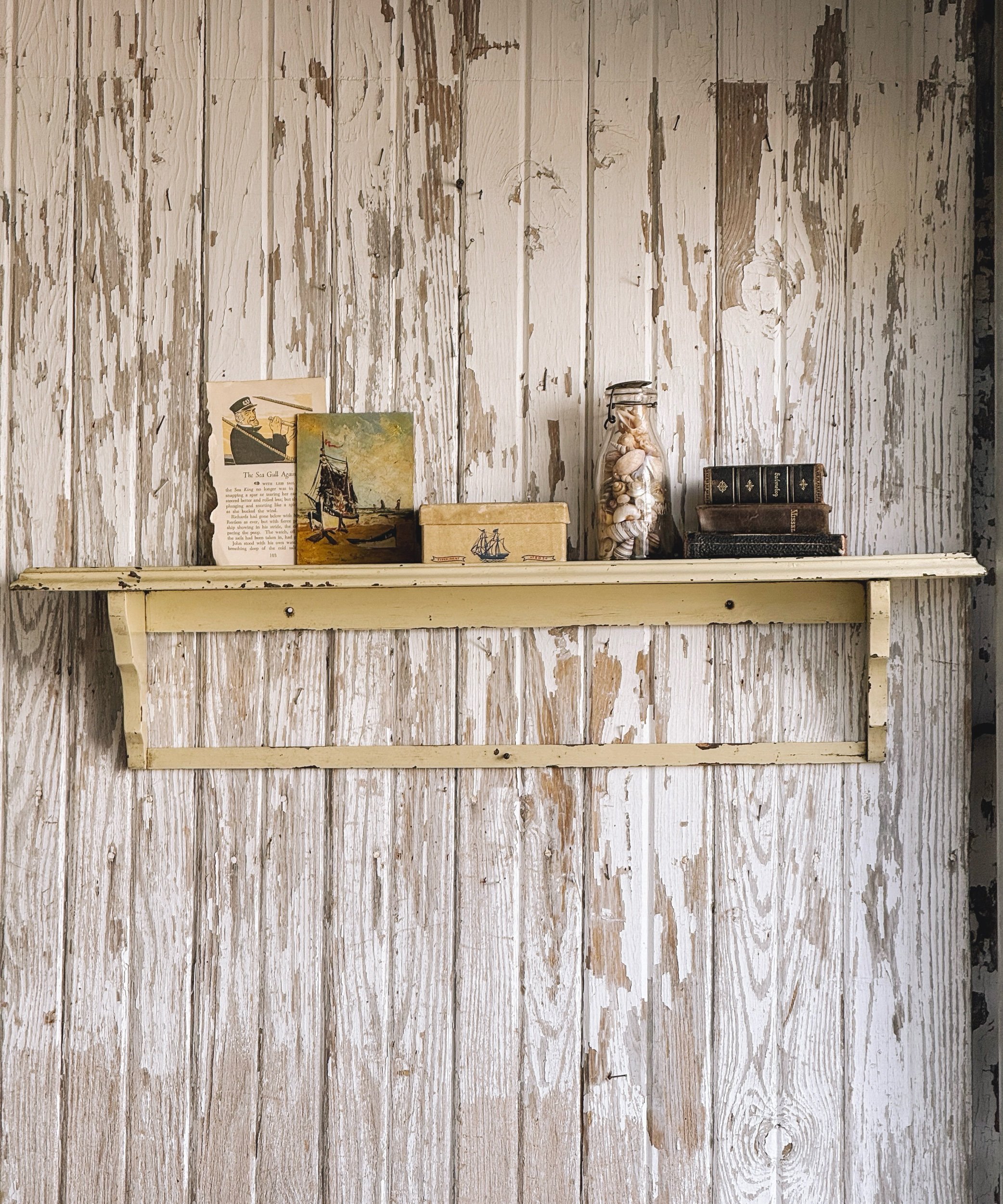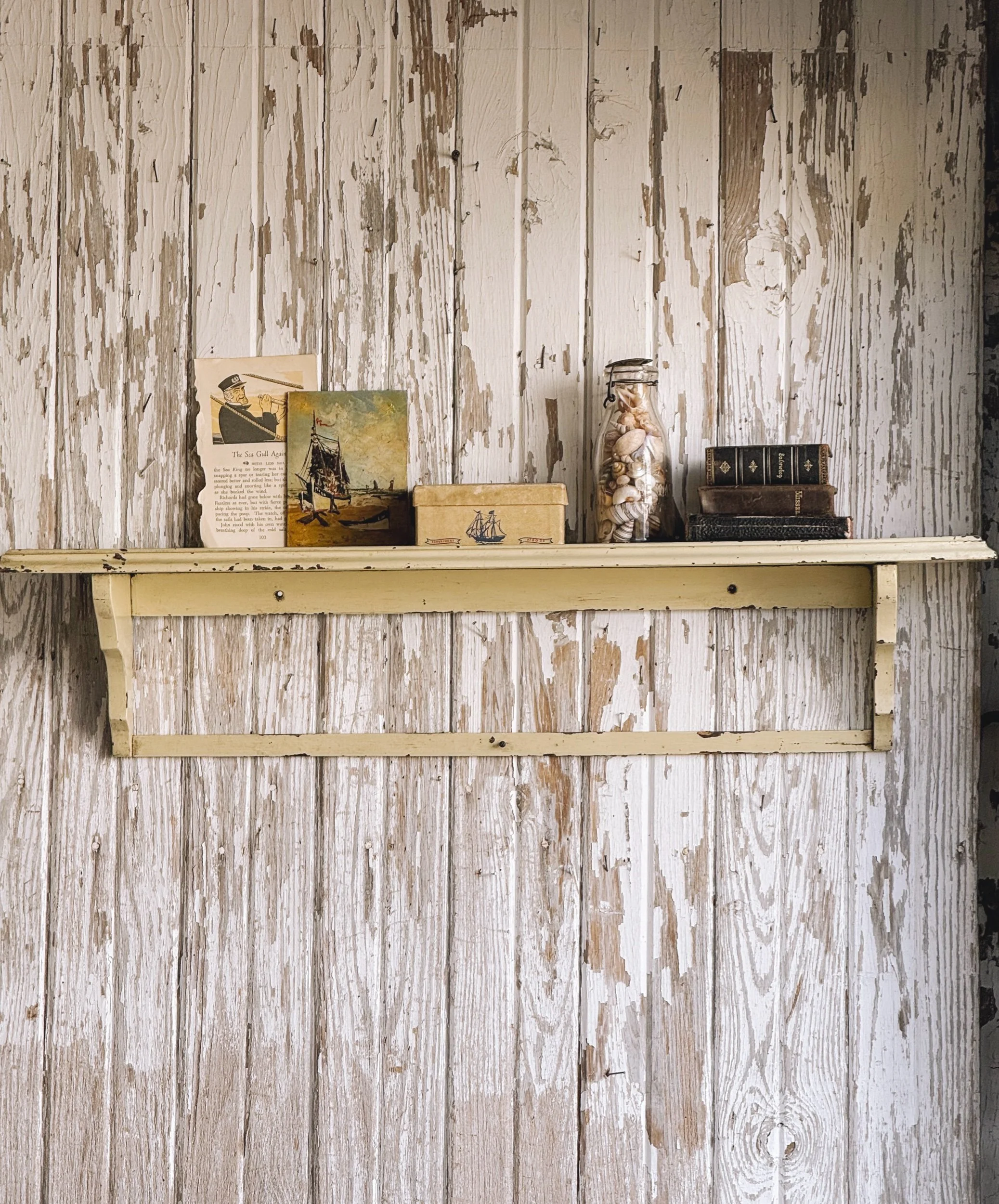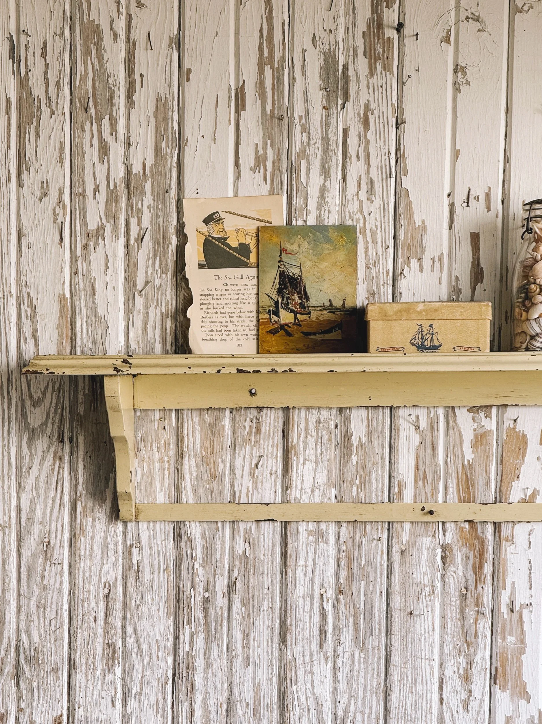 A beautifully timeworn antique shelf in the softest buttery yellow, carrying layers of age and quiet character. The naturally worn paint reveals glimpses of its history beneath, giving it that perfectly imperfect, collected-over-time feel.