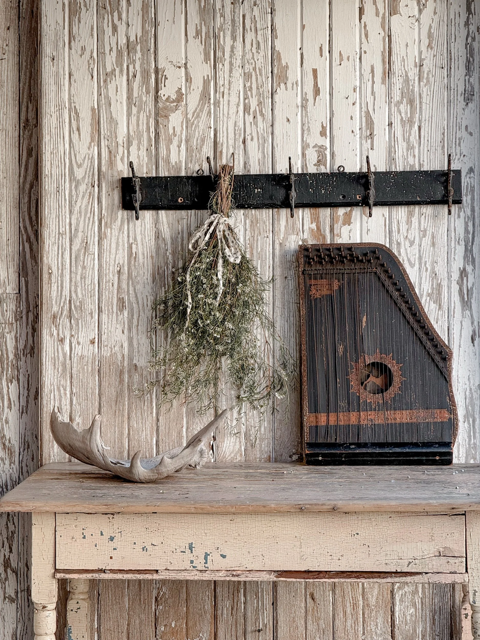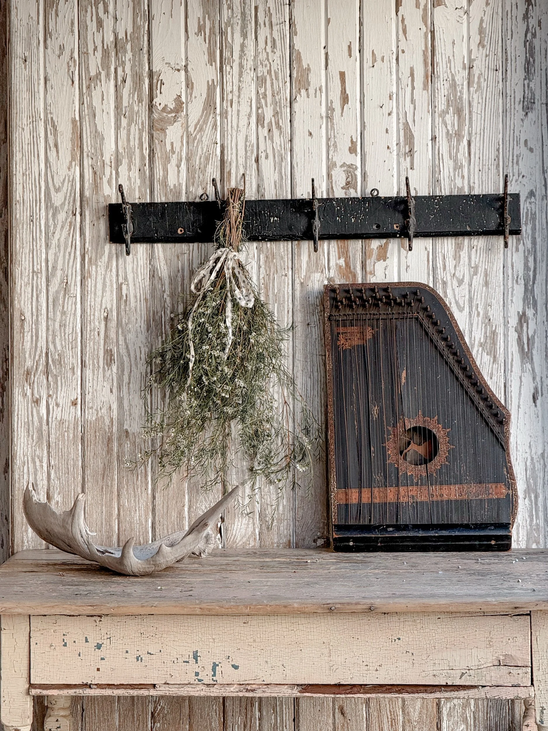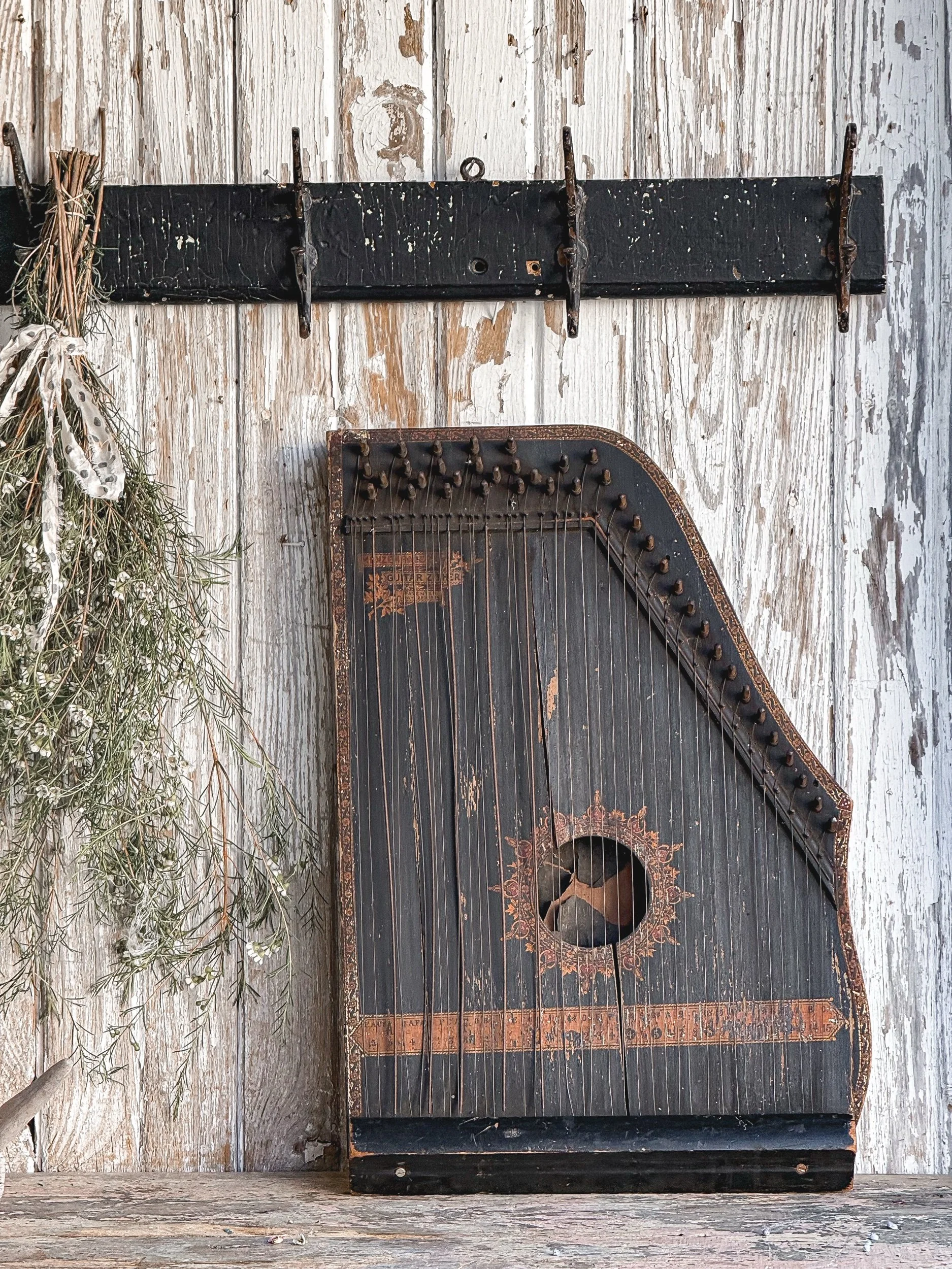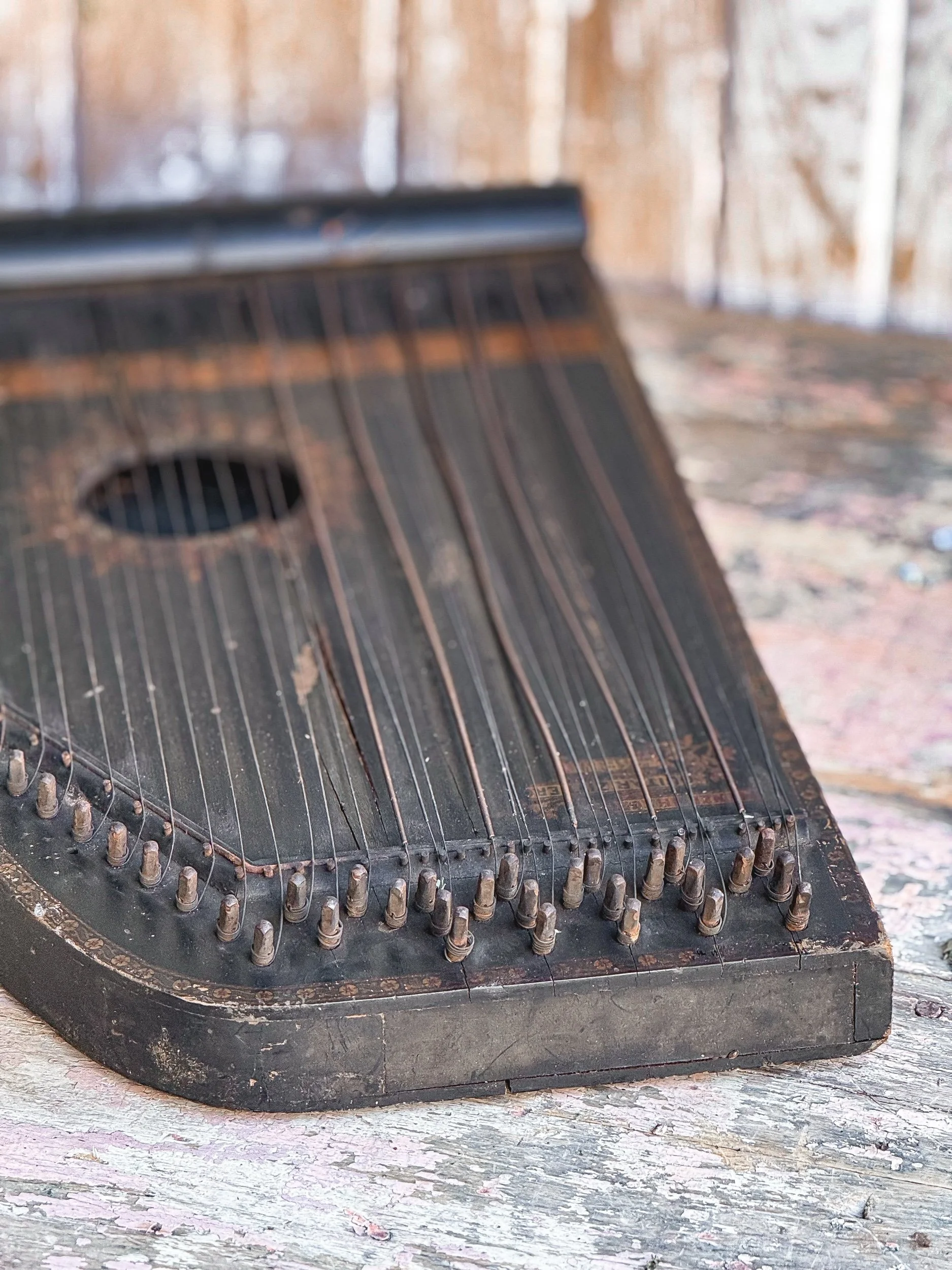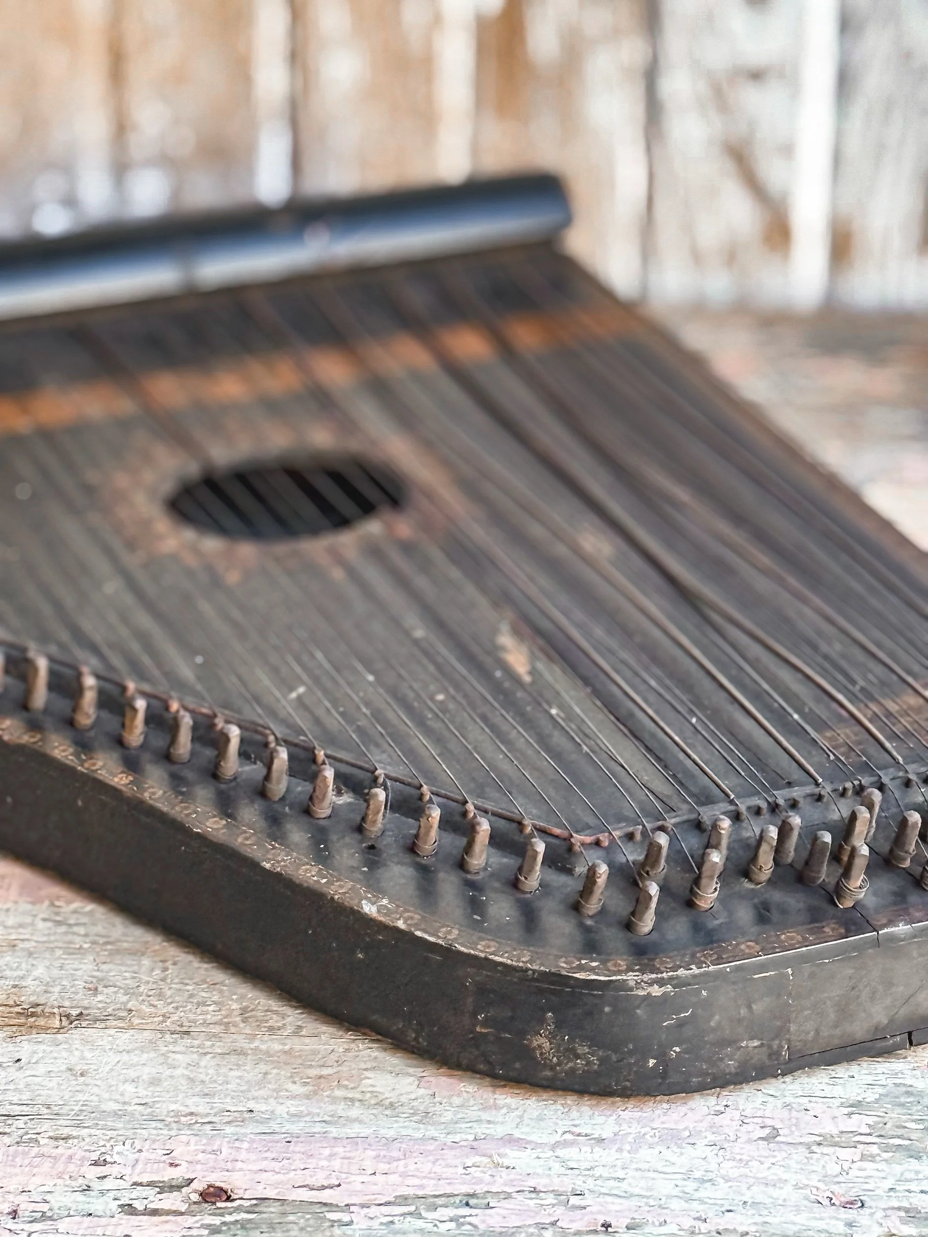 A beautifully aged antique zither, a traditional stringed instrument once played in parlors and homes, now carrying a rich, timeworn presence.