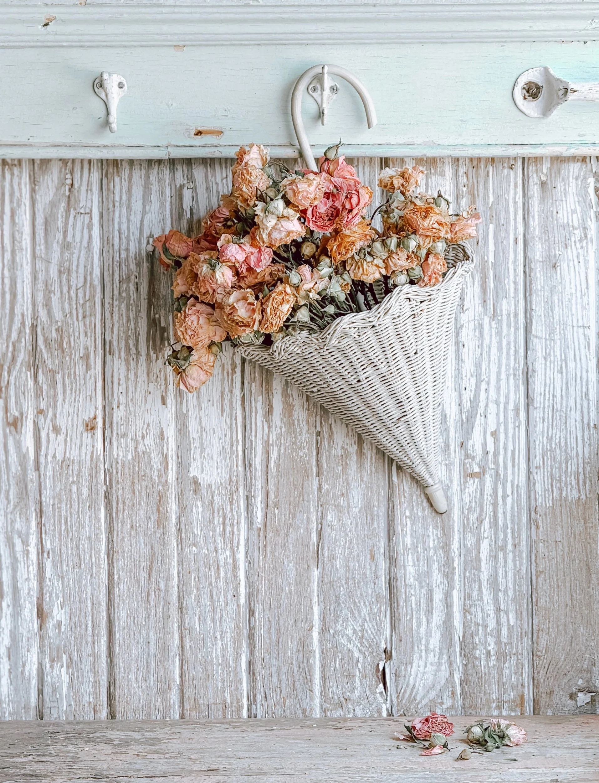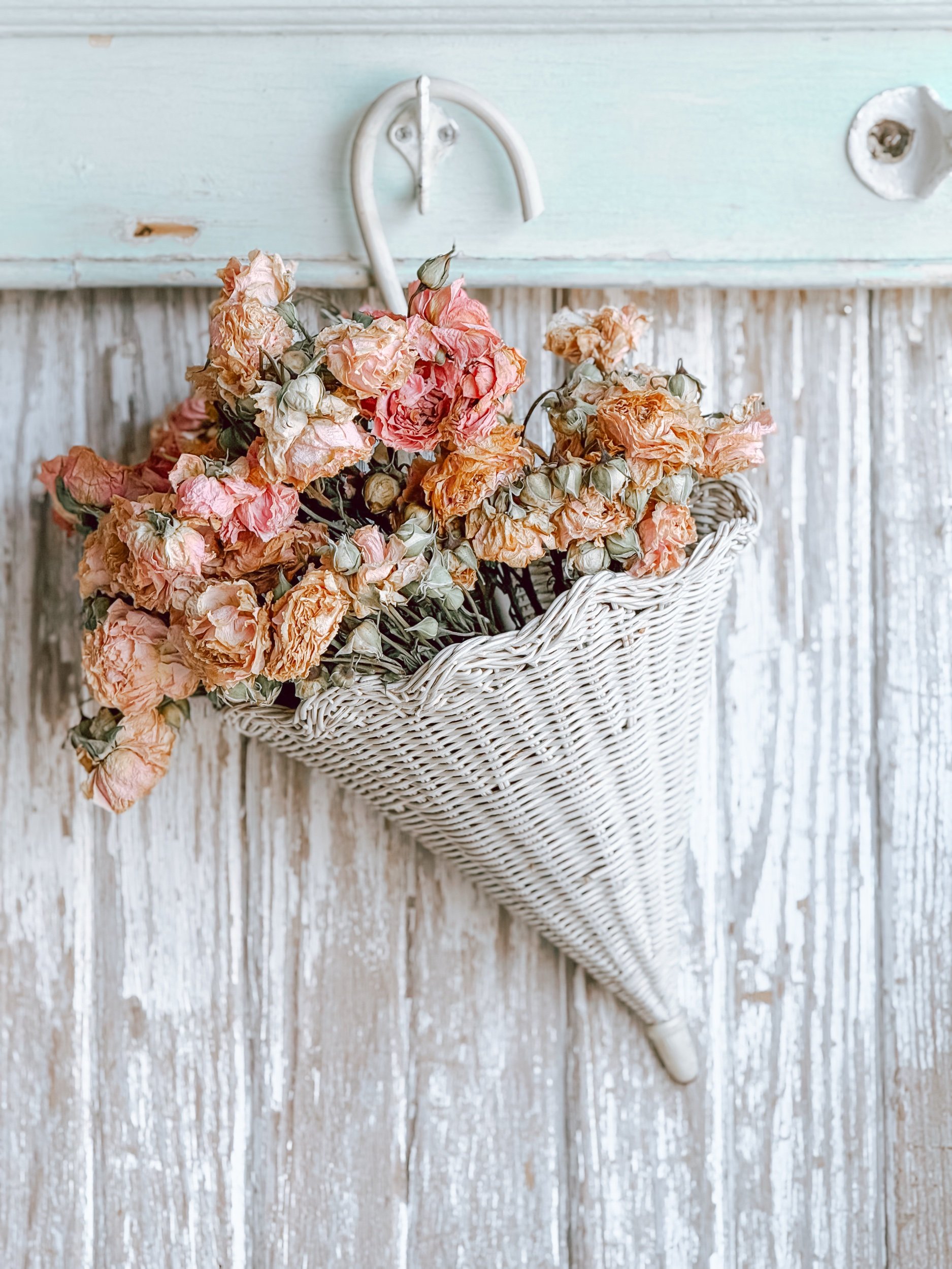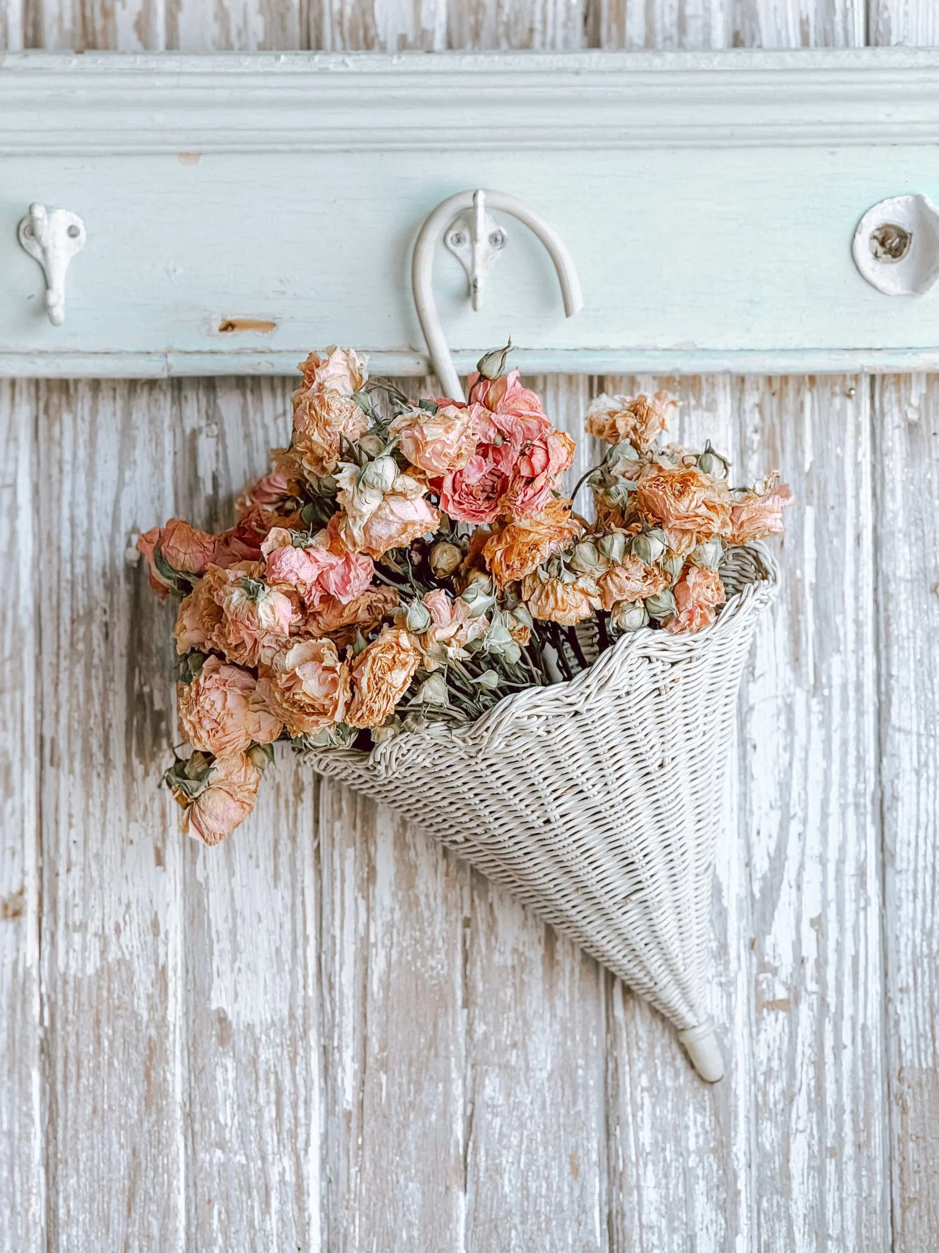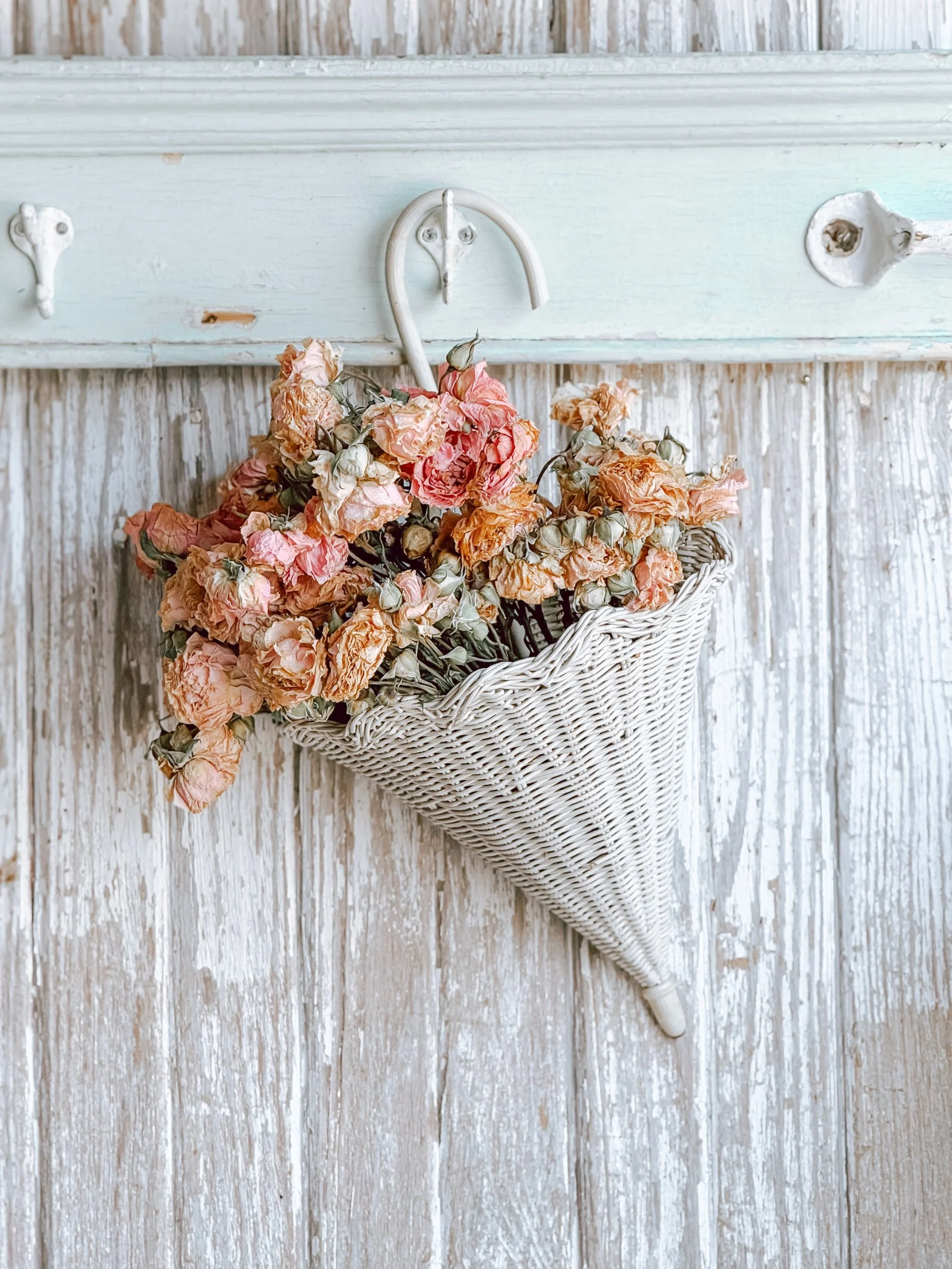 Vintage Wicker Floral Wall Pocket with Dried Rose Bouquet *