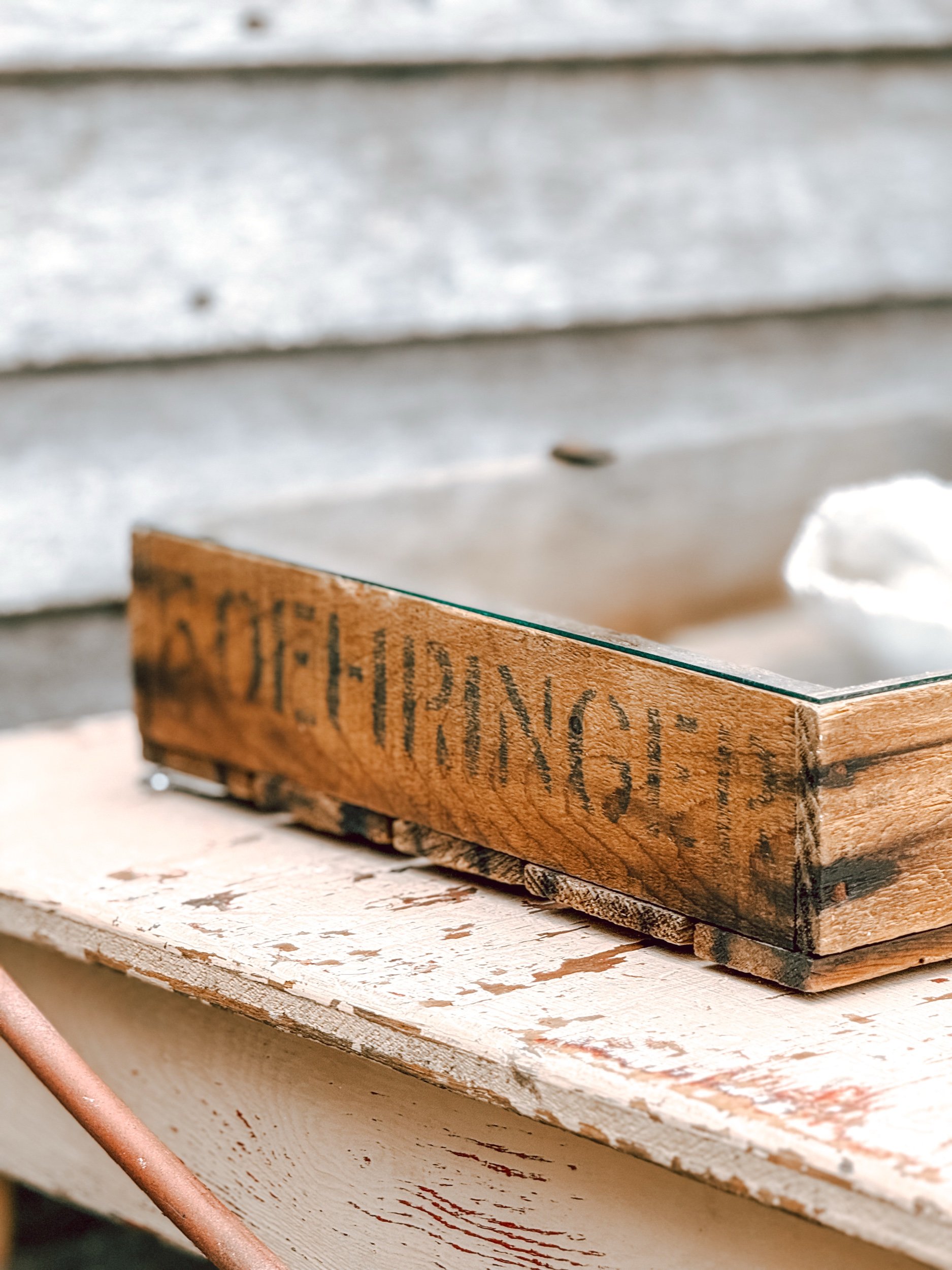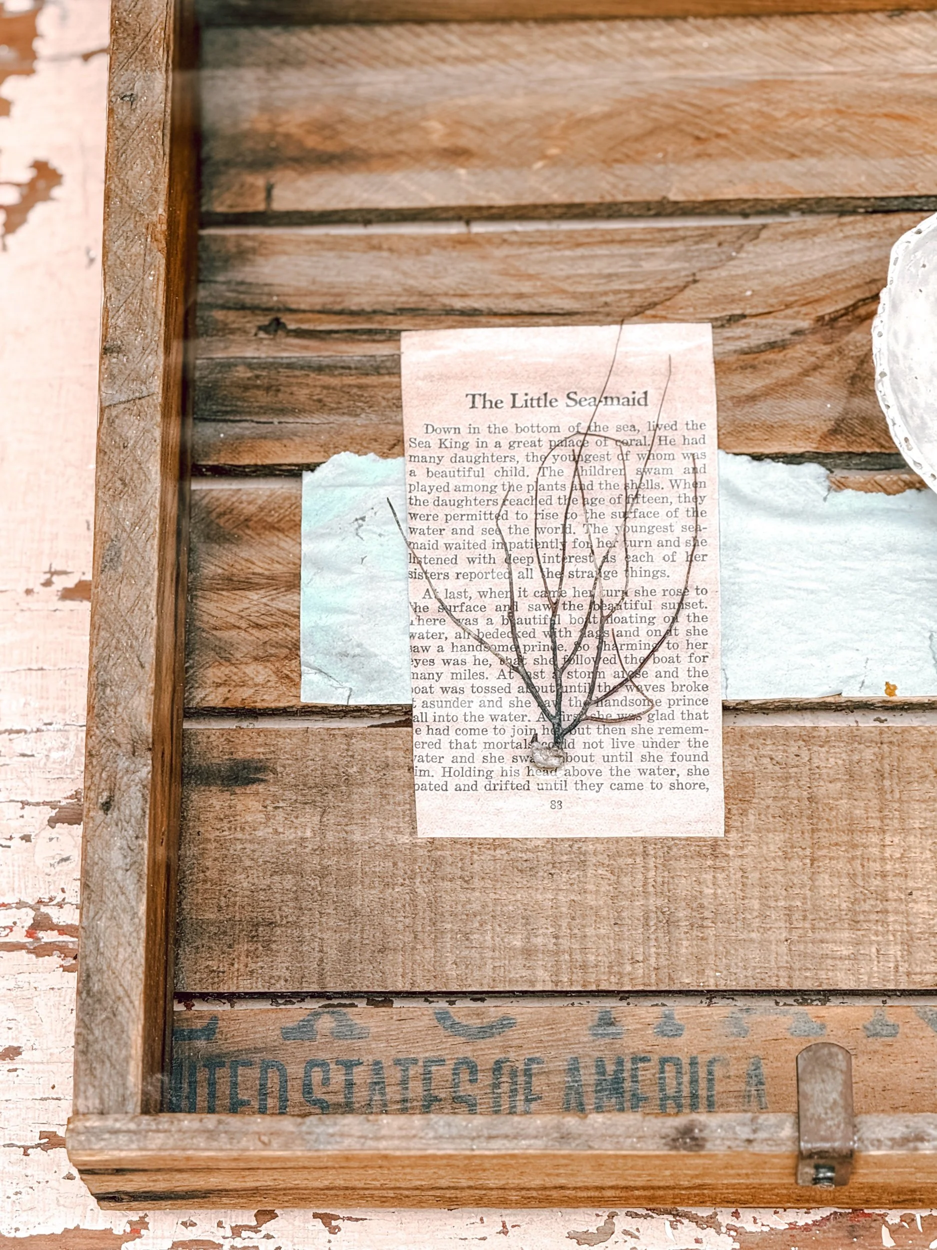 Constructed from wood with a glass front, this piece features natural wood slats, aged paper ephemera from The Little Mermaid, and an organic coastal specimen mounted at the center. The combination of texture, story, and patina gives the piece depth and quiet character.