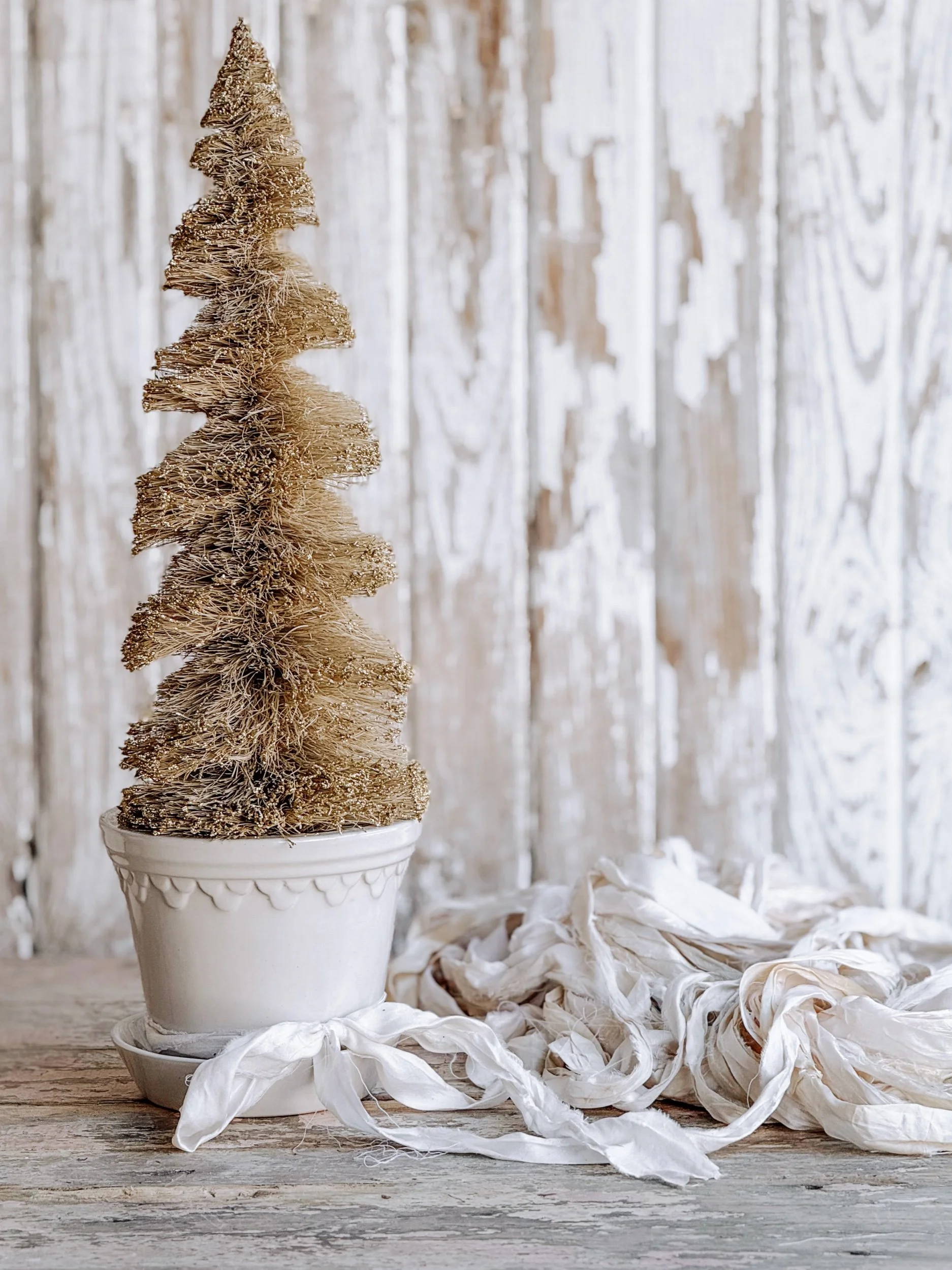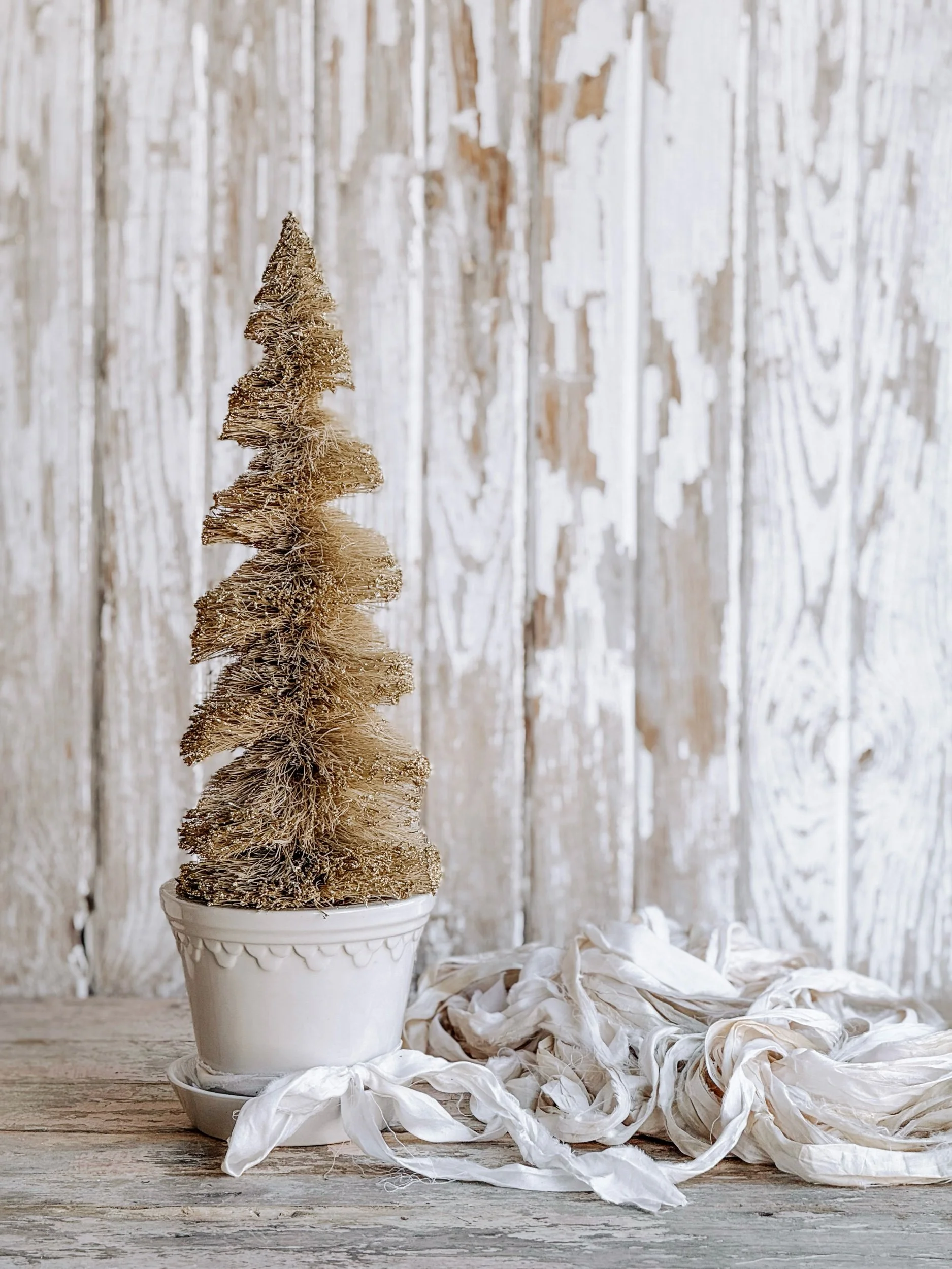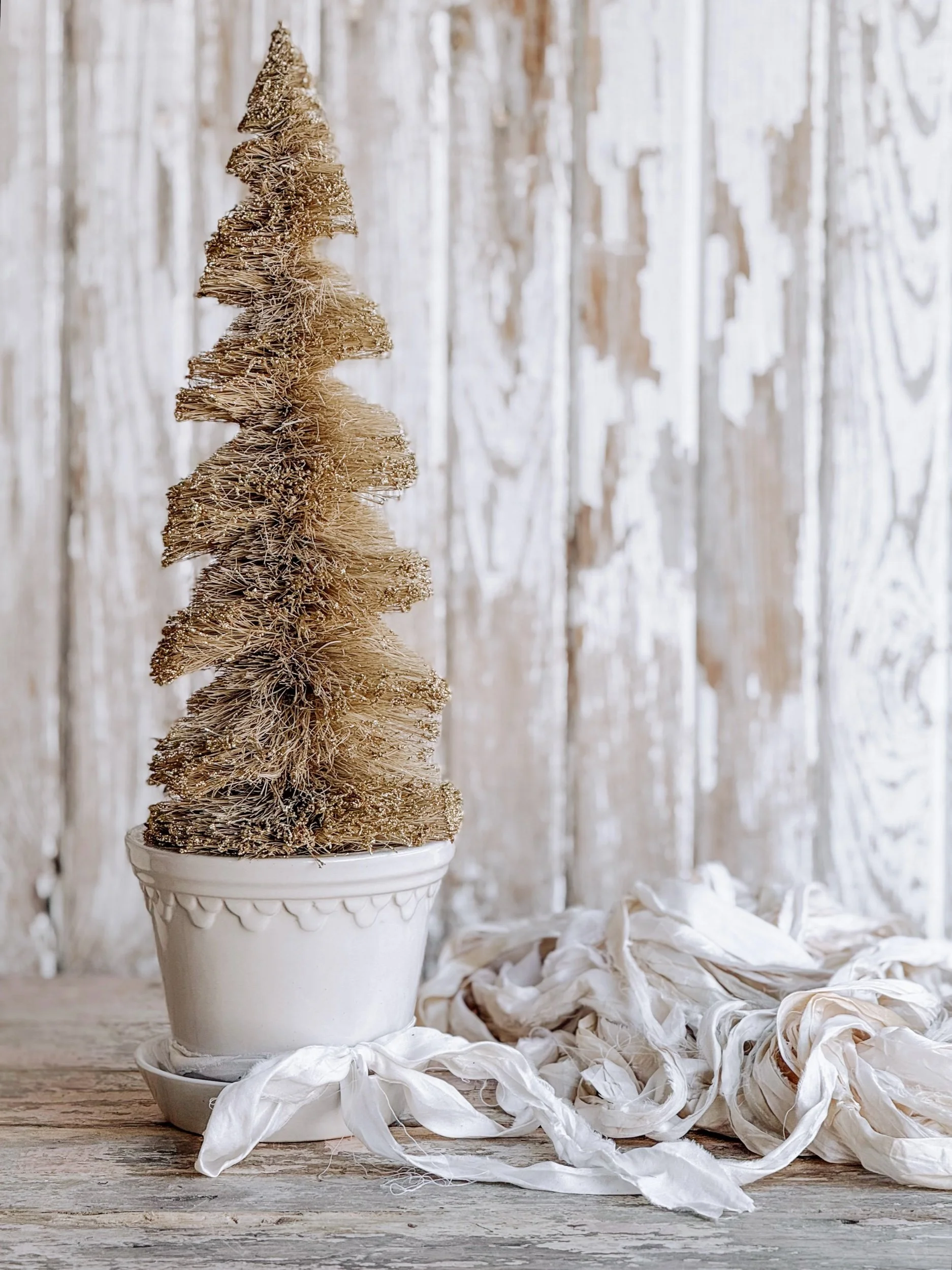 A softly styled winter white Bergs Potter planter paired with a French cocoa-toned bottle brush tree, finished with recycled creamy ribbon for a warm, natural contrast. The cocoa hue adds depth and old-world character, making this piece especially beautiful in neutral, layered winter spaces.