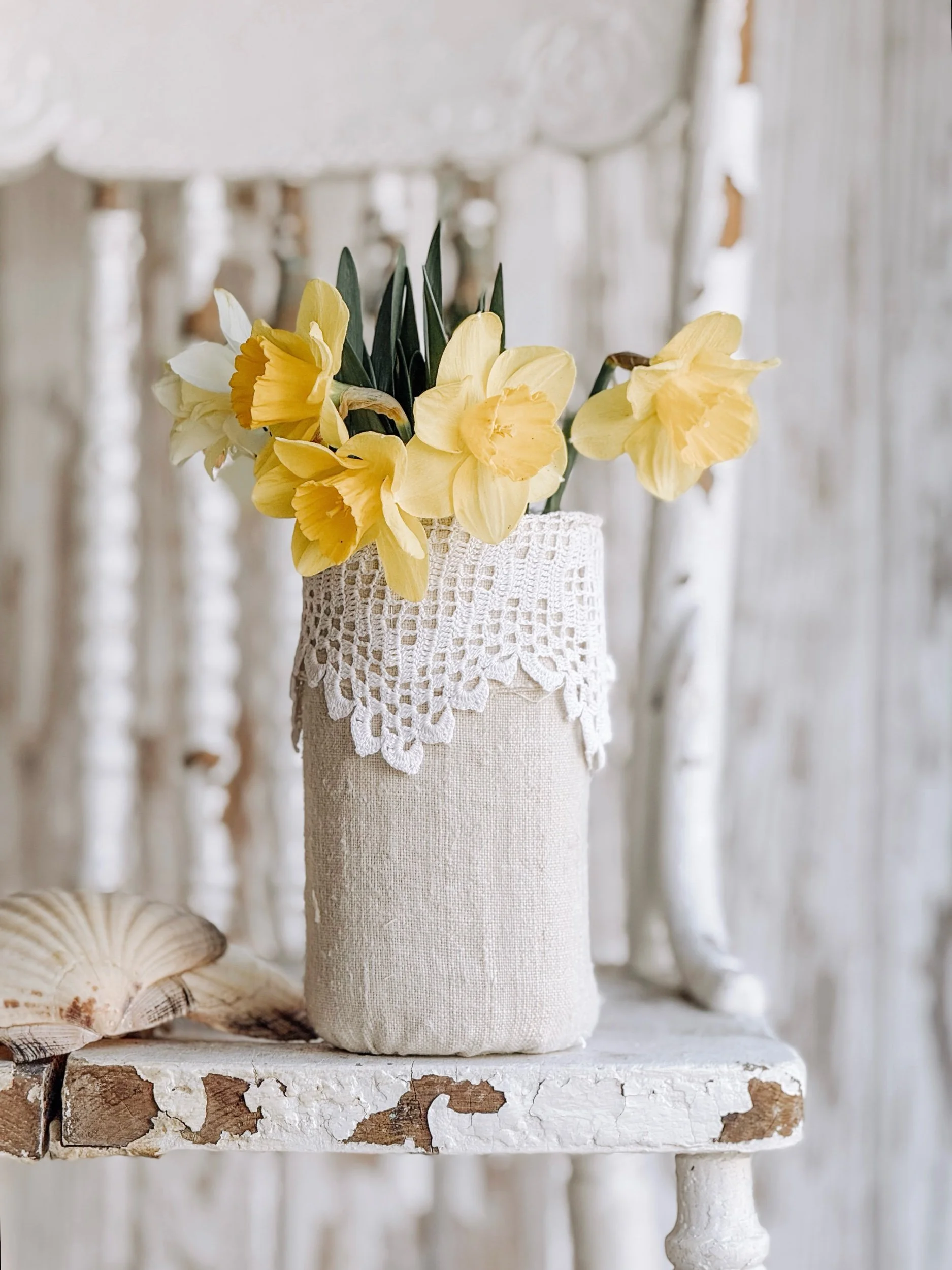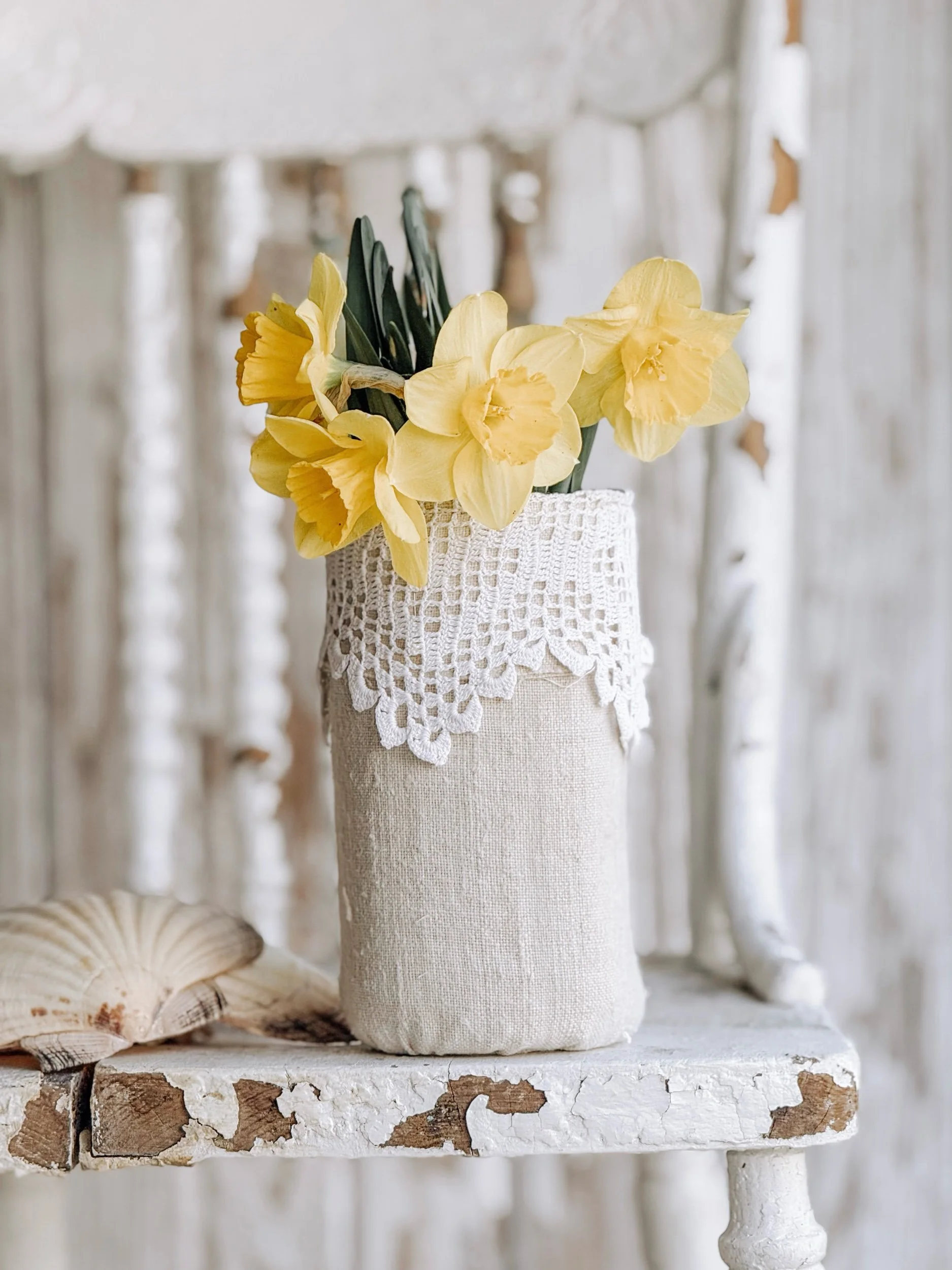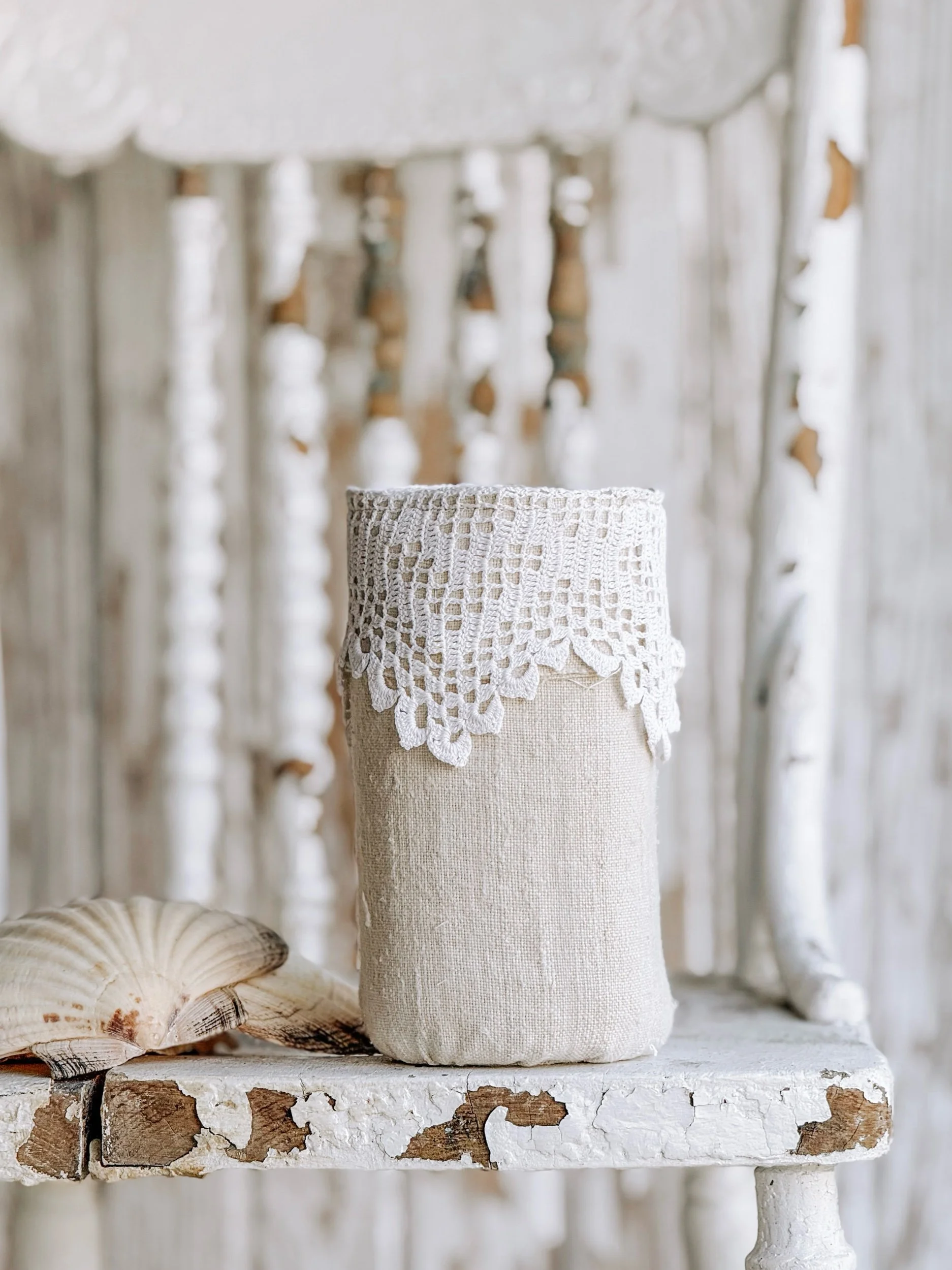 Artisan Handmade Antique French Linen Vase Cover with Glass Jar – Lace Trim
