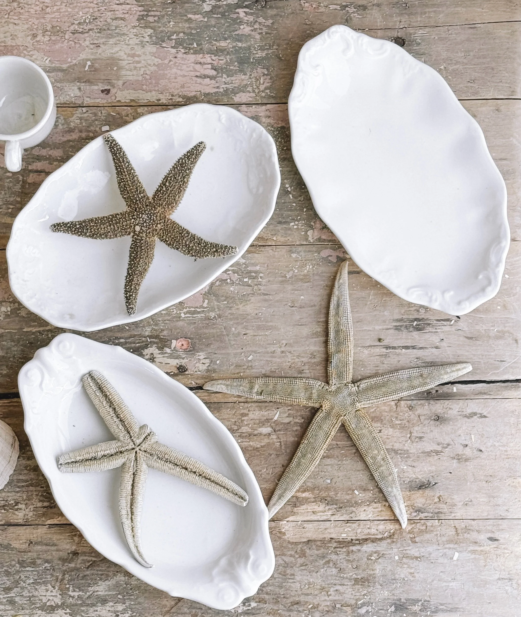 A beautifully gathered set of three antique European ironstone plates, each with its own softly worn character and creamy white patina. Paired with vintage starfish, this collection brings a quiet coastal elegance to any space.