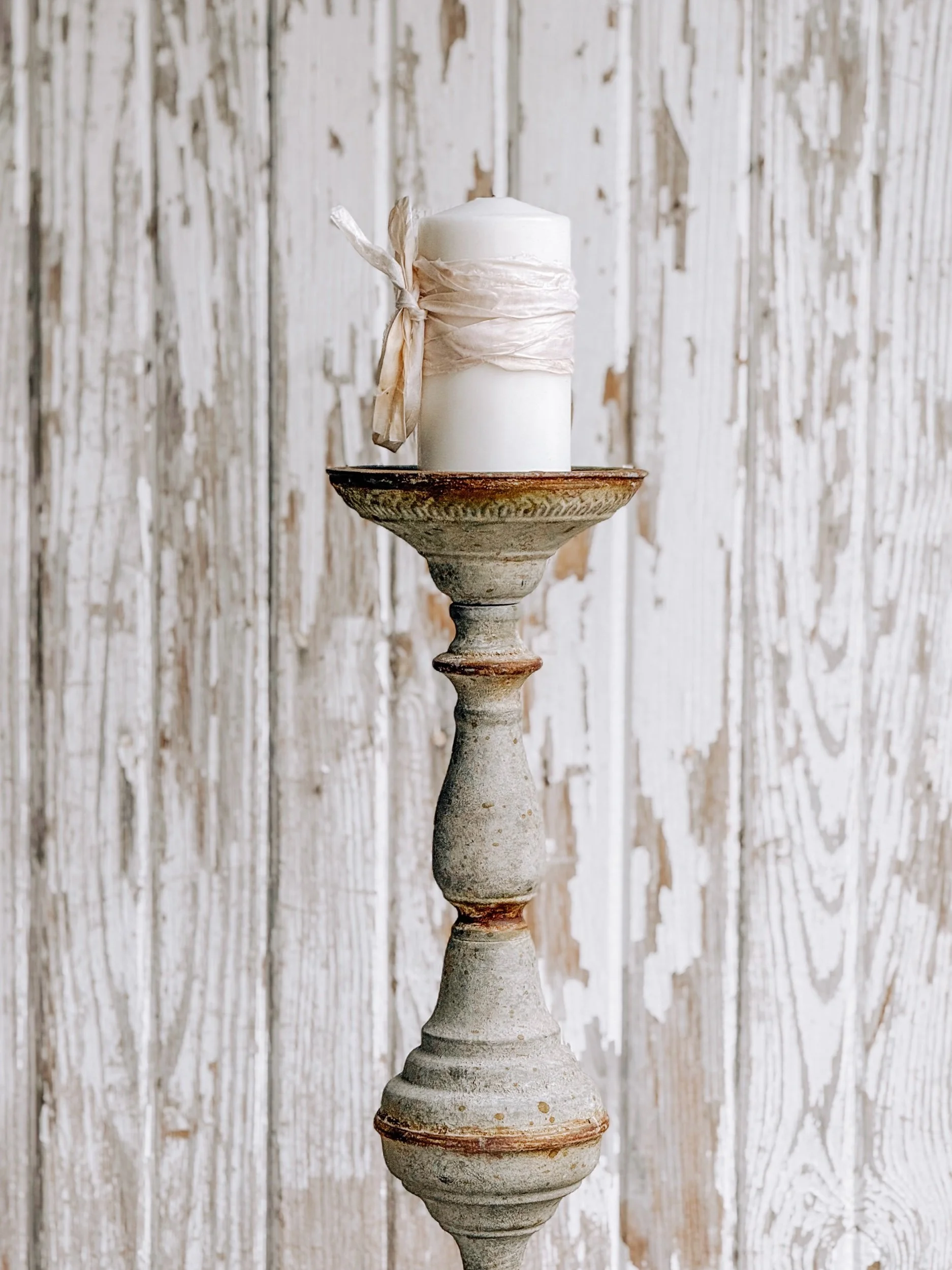 A beautifully sculptural vintage zinc candleholder with a softly weathered finish and layered aged patina that gives it an old-world, timeworn presence. Its tall silhouette and ornate base make it a striking accent for shelves, consoles, mantels, or the center of a gathered table.