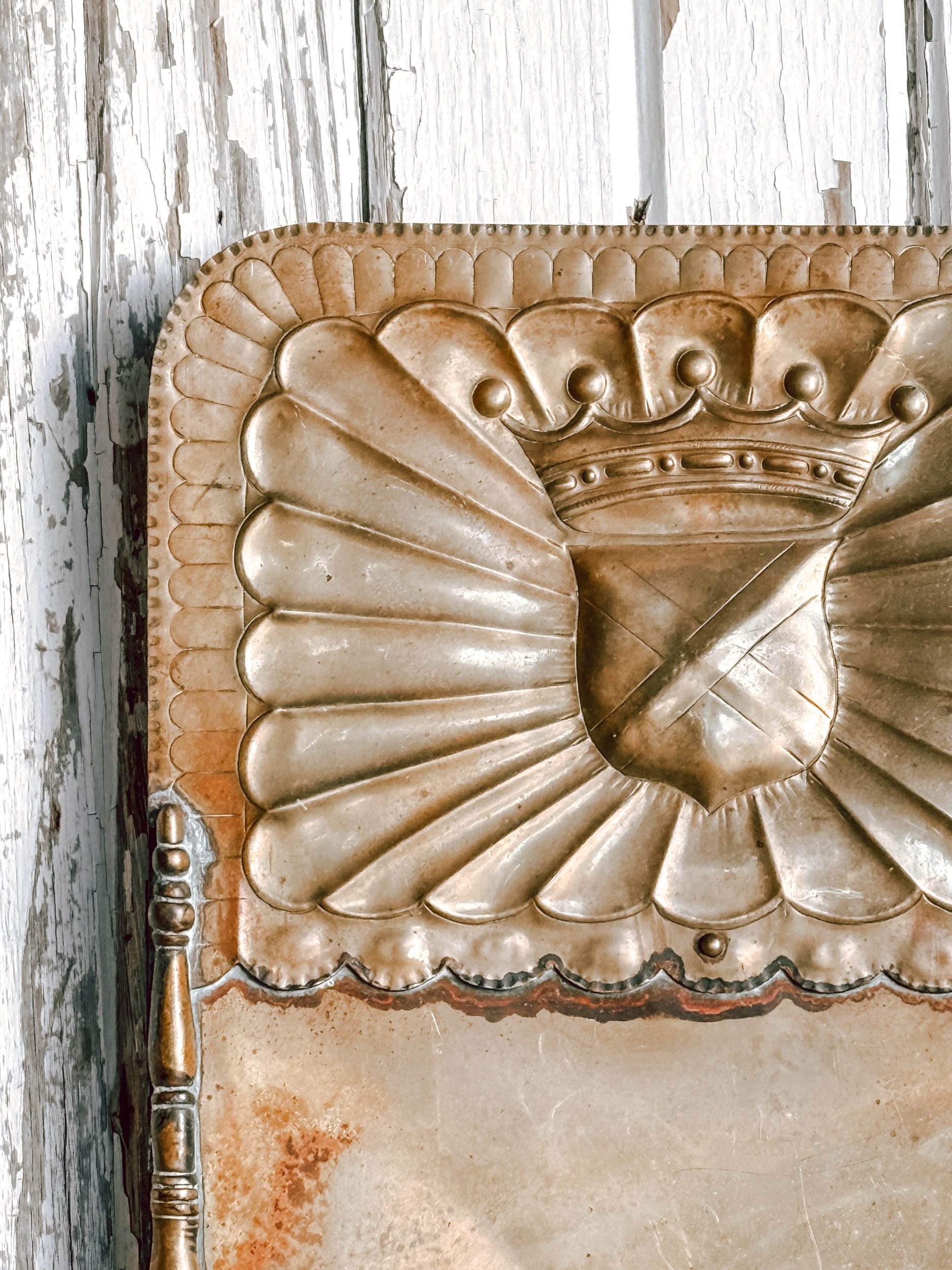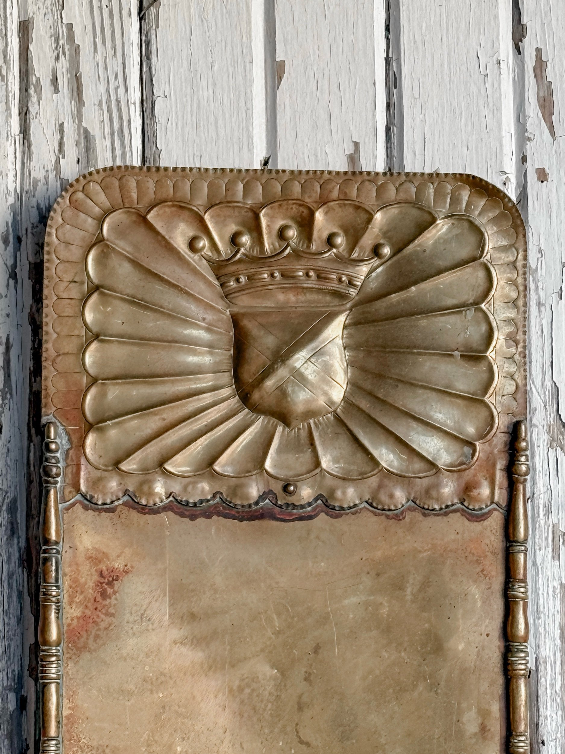 A striking antique European brass wall sconce featuring a raised heraldic crest crowned at the center. Hand-worked in repoussé brass, this piece displays beautiful depth, symmetry, and timeworn character.