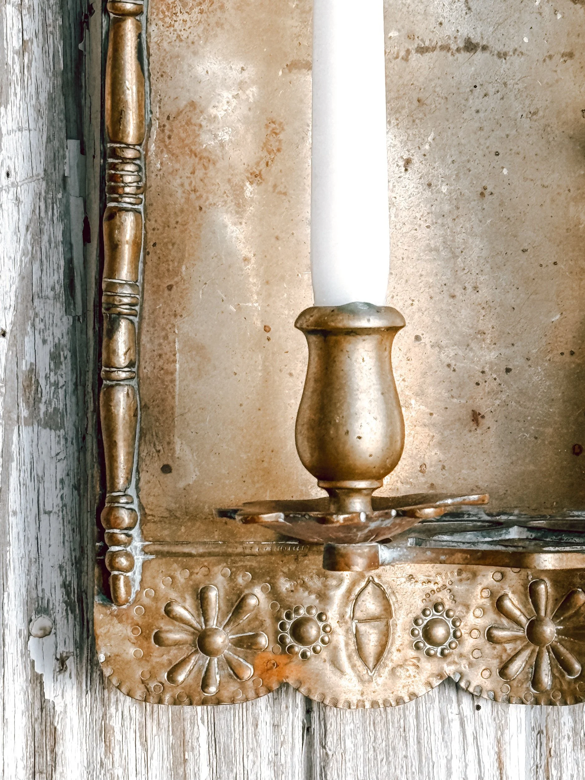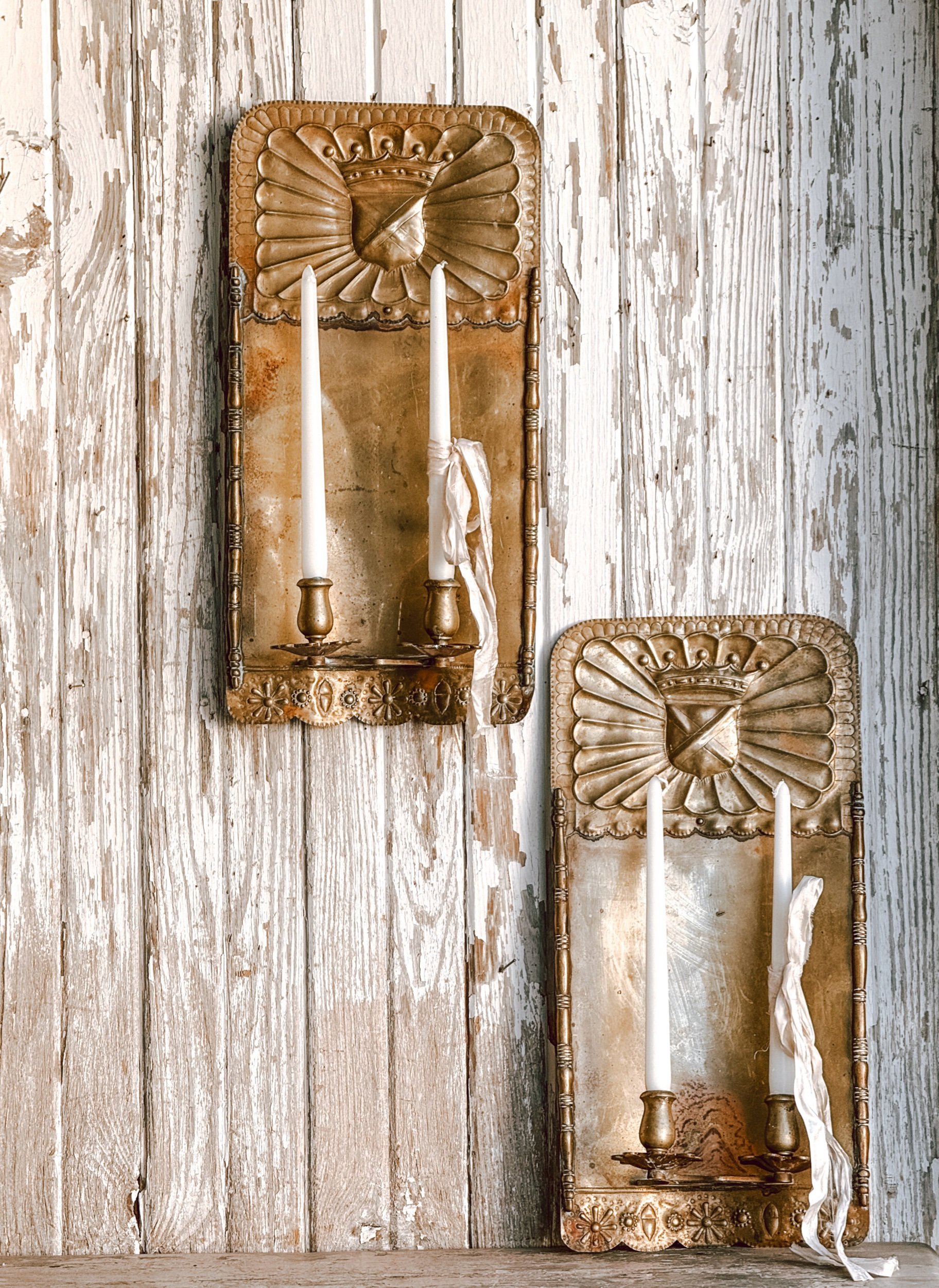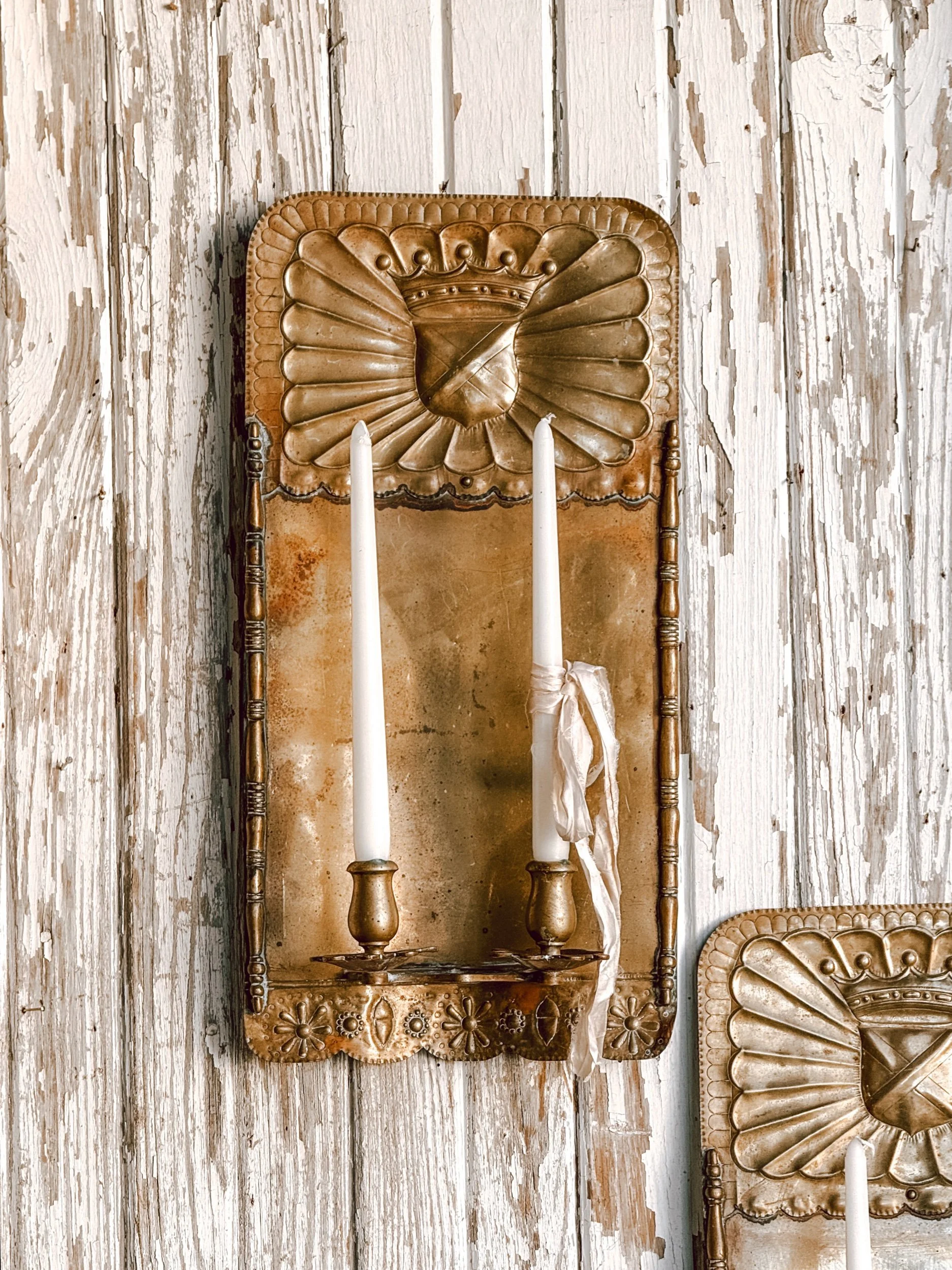 The softly aged patina and sculptural form suggest continental European origin, likely French or Northern Italian. Designed to hold two tapers, it brings warmth and quiet drama to any wall—perfect for entryways, dining spaces, or layered gallery walls.