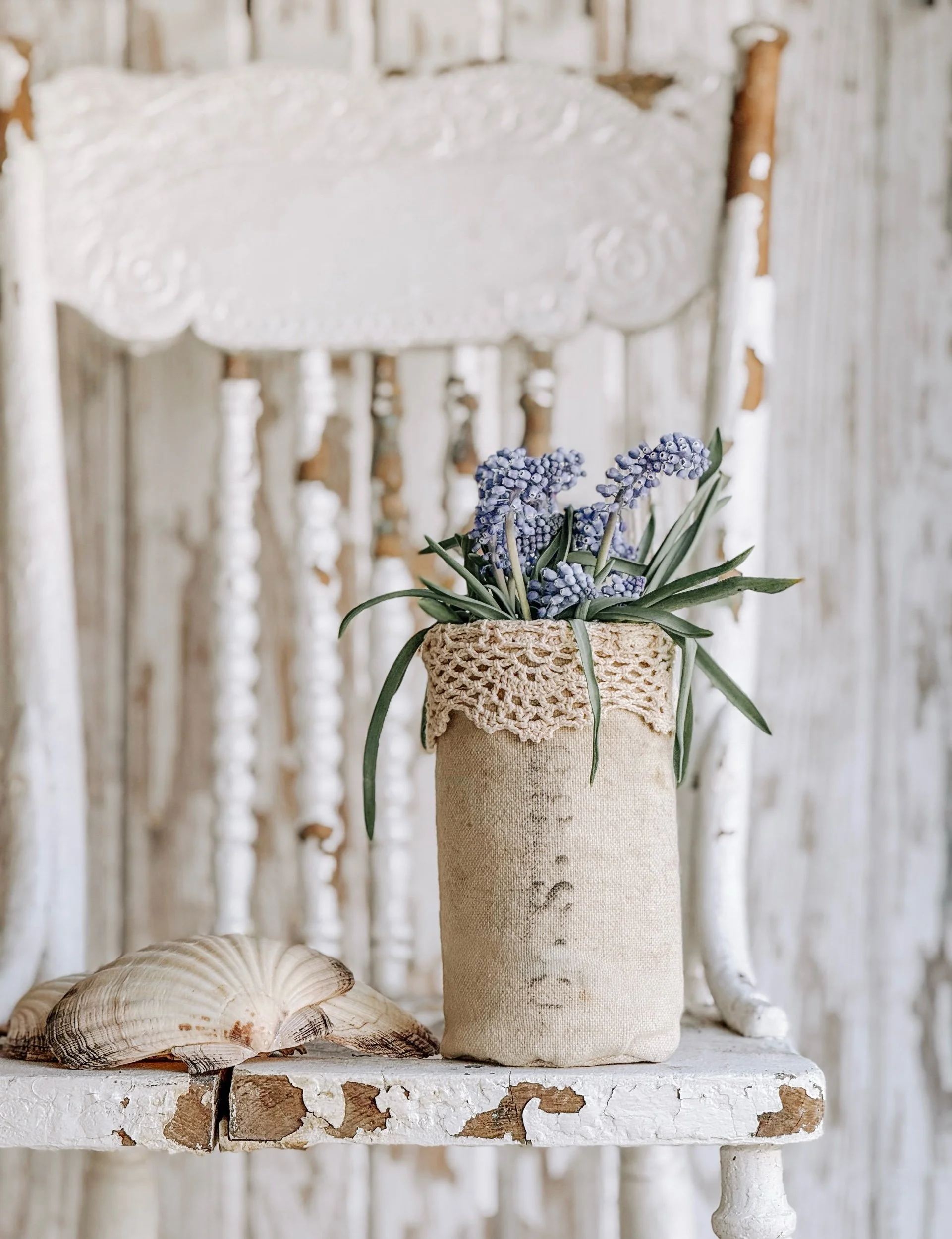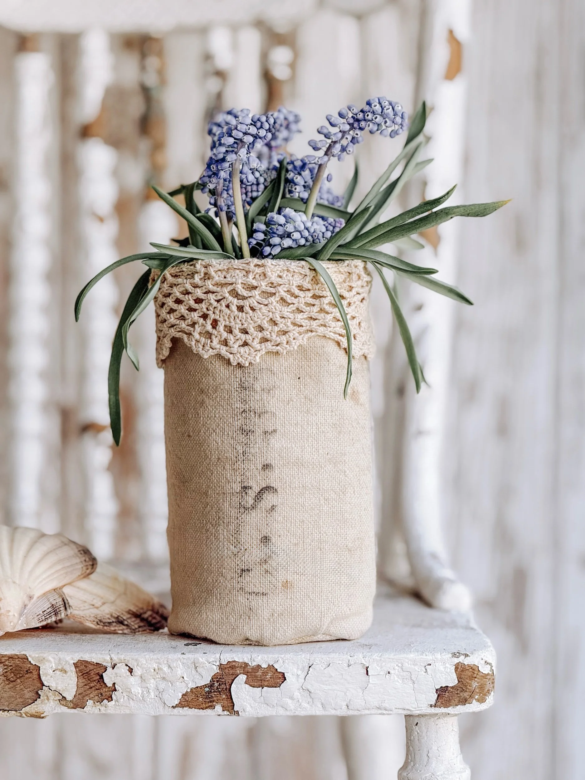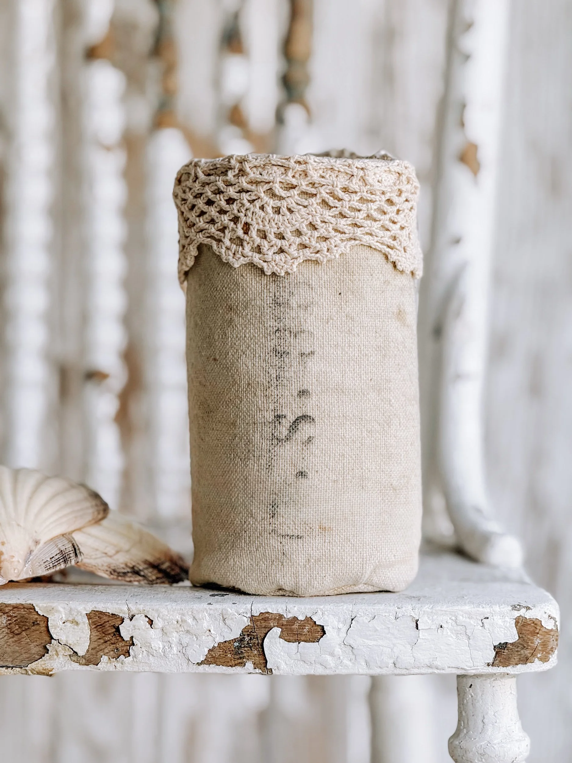 Artisan Handmade Antique French Linen Vase Cover with Glass Jar – Crochet Edge