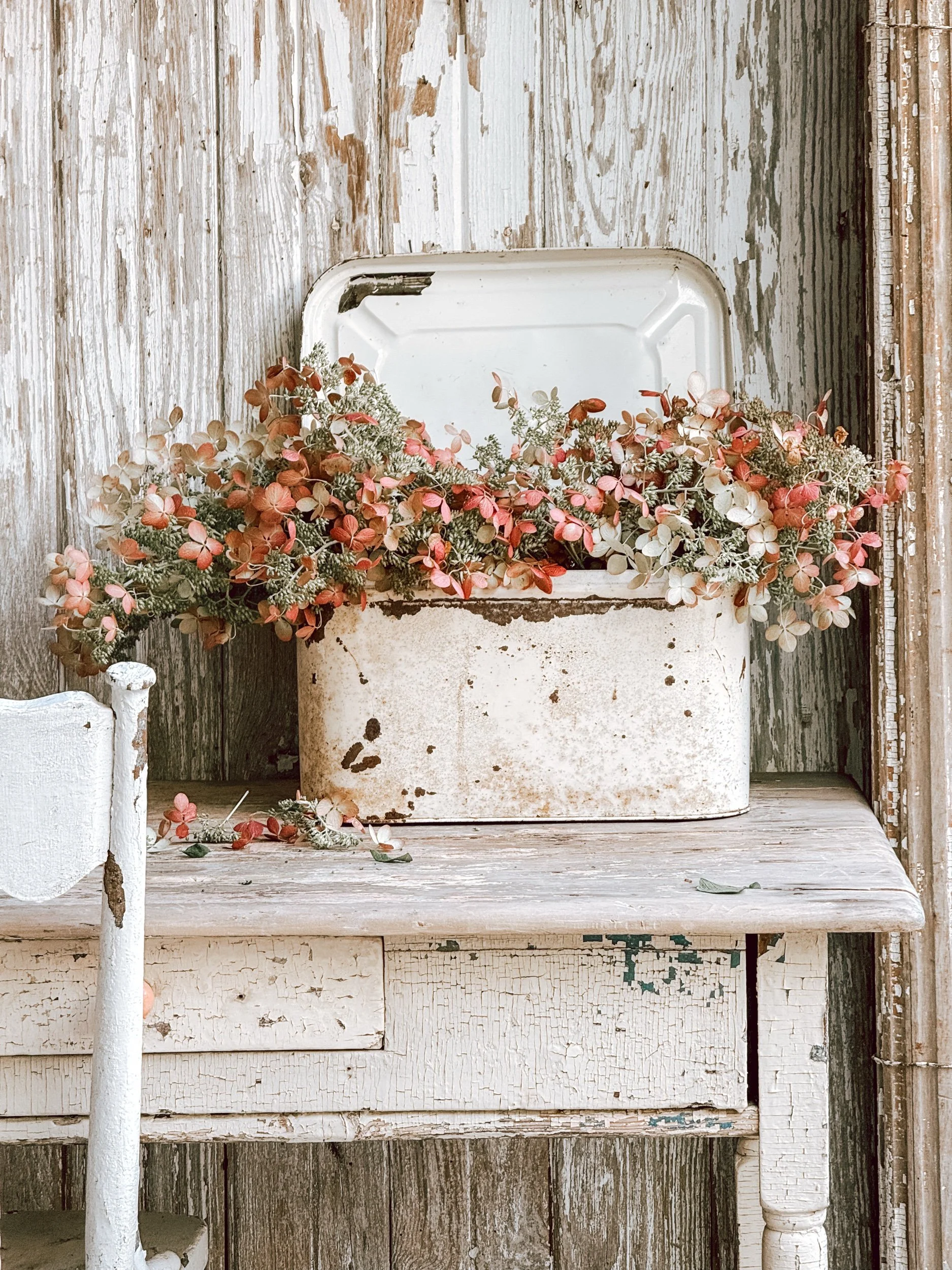 Beautiful aged patina with bold orange and cream graphics — a true statement piece for holiday styling, kitchen displays, or as a unique vessel for small trees and greenery.