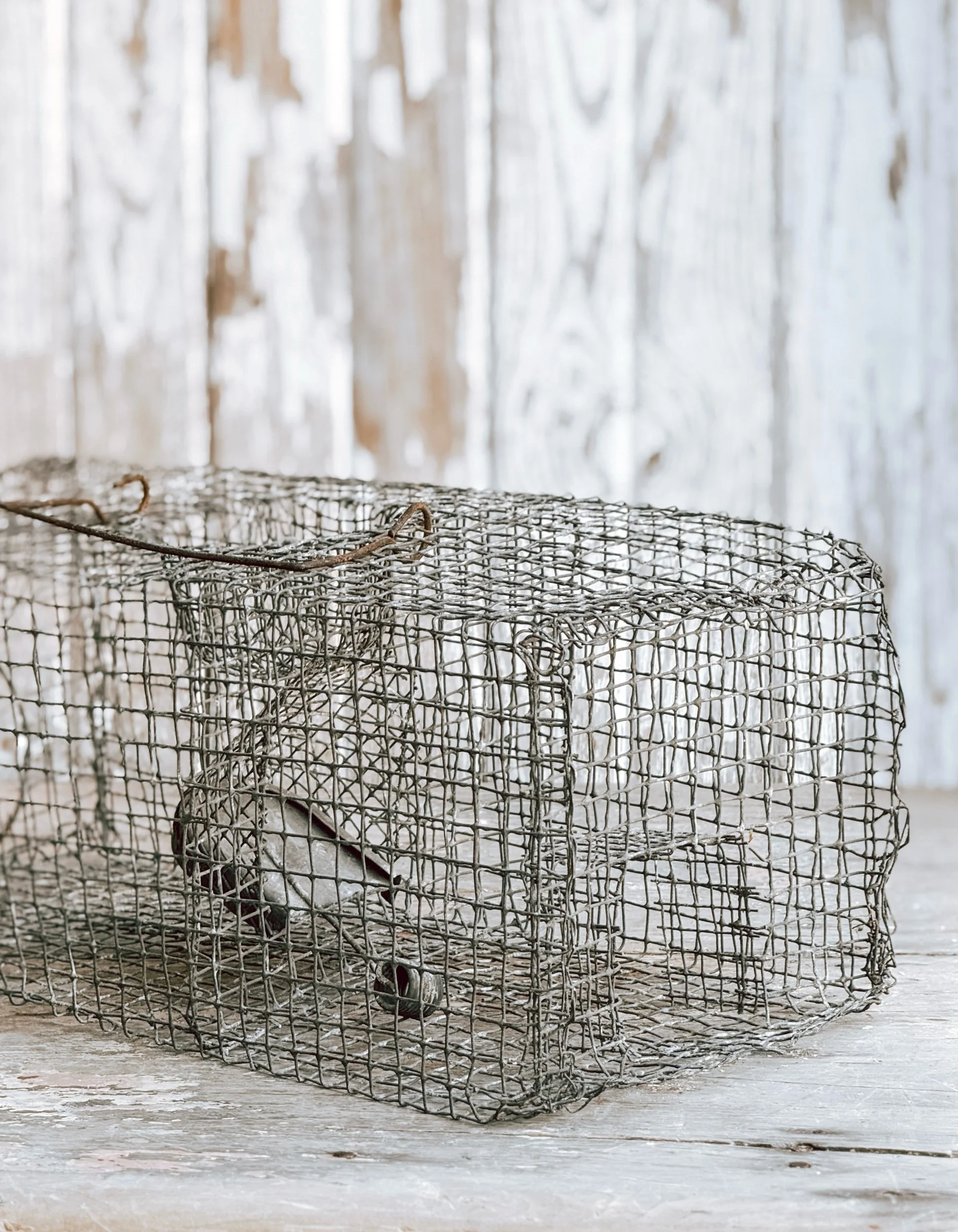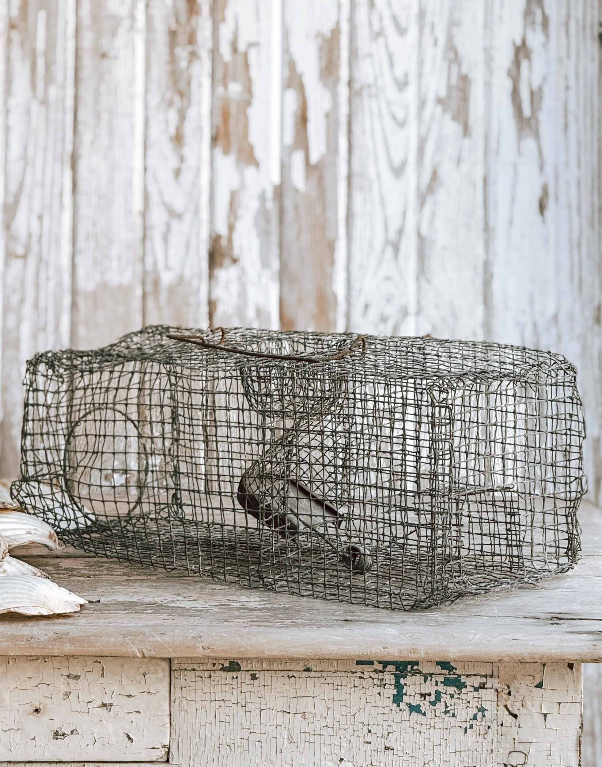 An authentic antique wire crab trap with a beautifully weathered patina, full of texture and coastal character. The aged metal has softened over time, creating that perfect muted tone that blends effortlessly into a collected, seaside-inspired space.