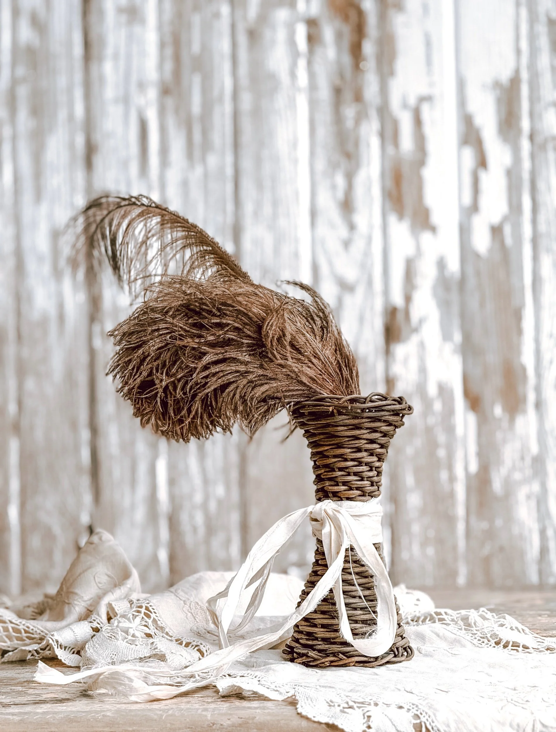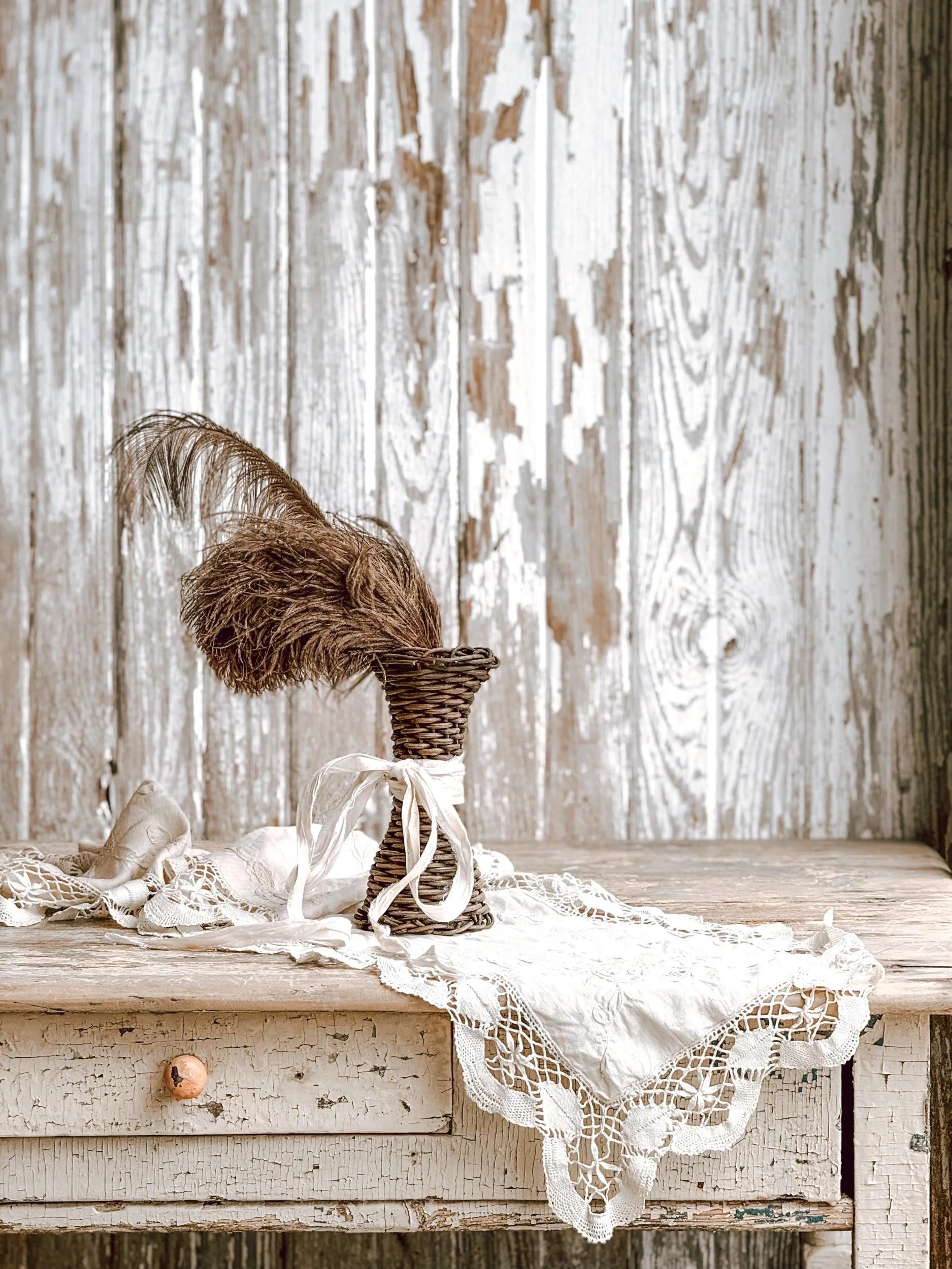 Antique Wicker Vase with French Feather & Victorian Linen Runner