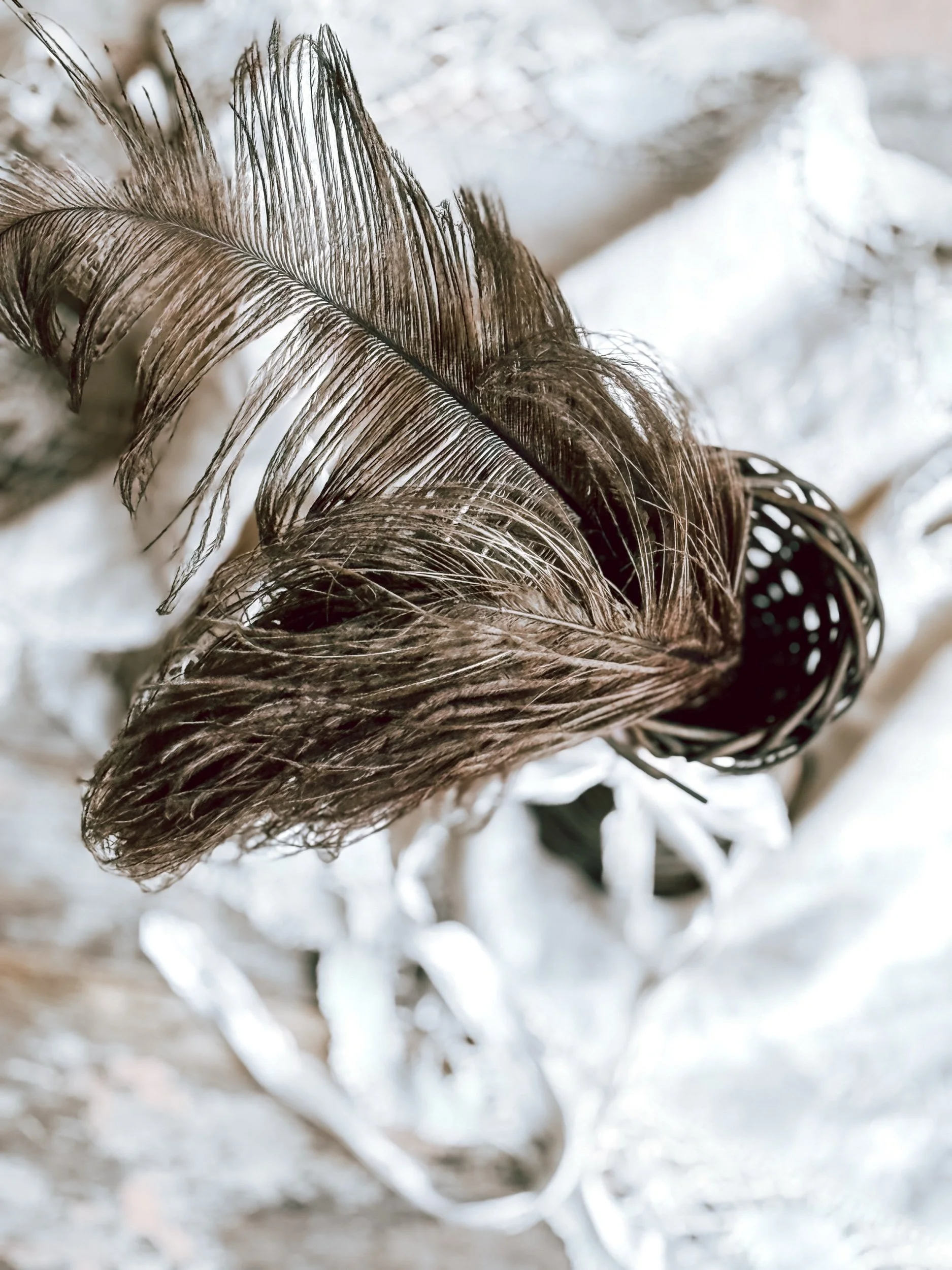 A beautifully collected antique vignette featuring a timeworn wicker vase paired with an antique French feather and a gorgeous Victorian linen table runner. Soft, layered textures and creamy neutrals make this piece a quiet statement for winter styling.
