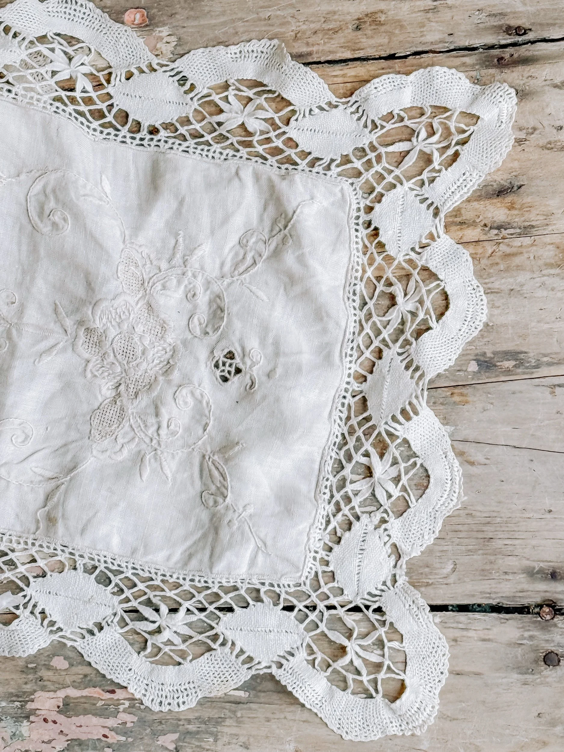 The wicker vase shows lovely aged patina and natural wear, while the antique feather adds movement and old-world charm. The Victorian linen runner, finished with intricate lacework and delicate embroidery, brings a sense of romance and history to the composition.