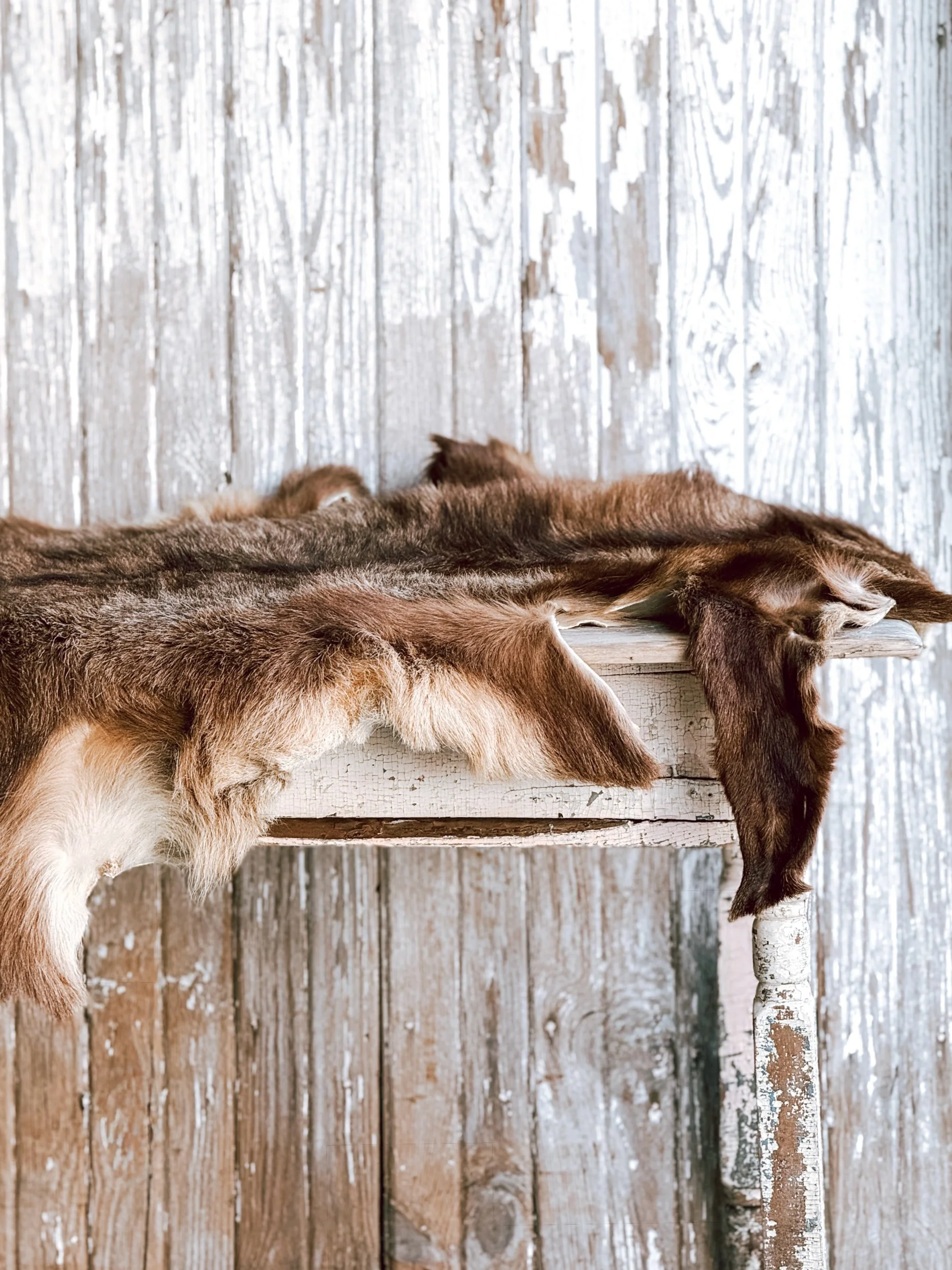 Each hide is completely unique, with natural shape variation, tonal shifts, and markings that reflect its authenticity and age. A timeless, grounding piece that layers effortlessly into rustic, cottage, or collected interiors.