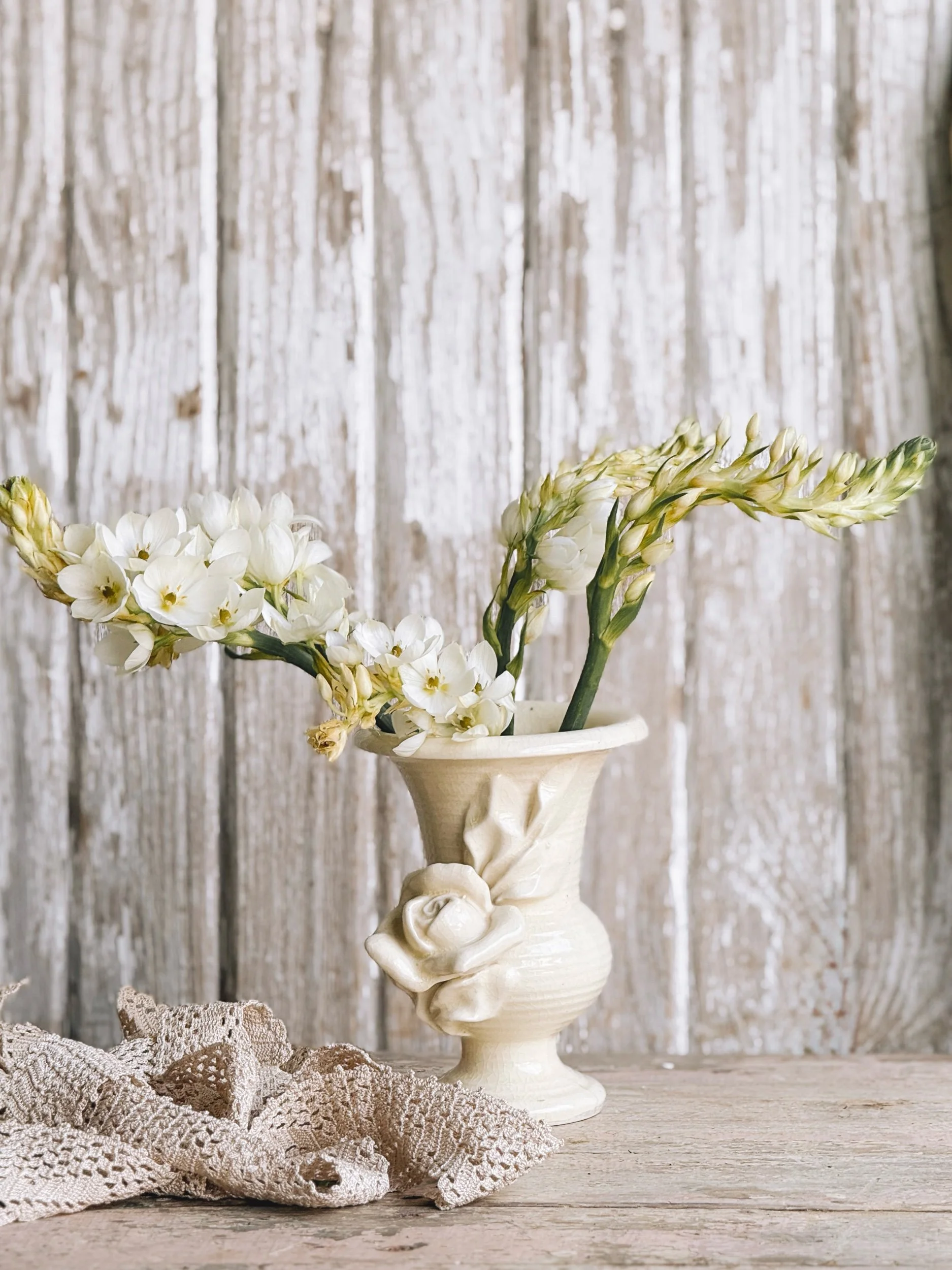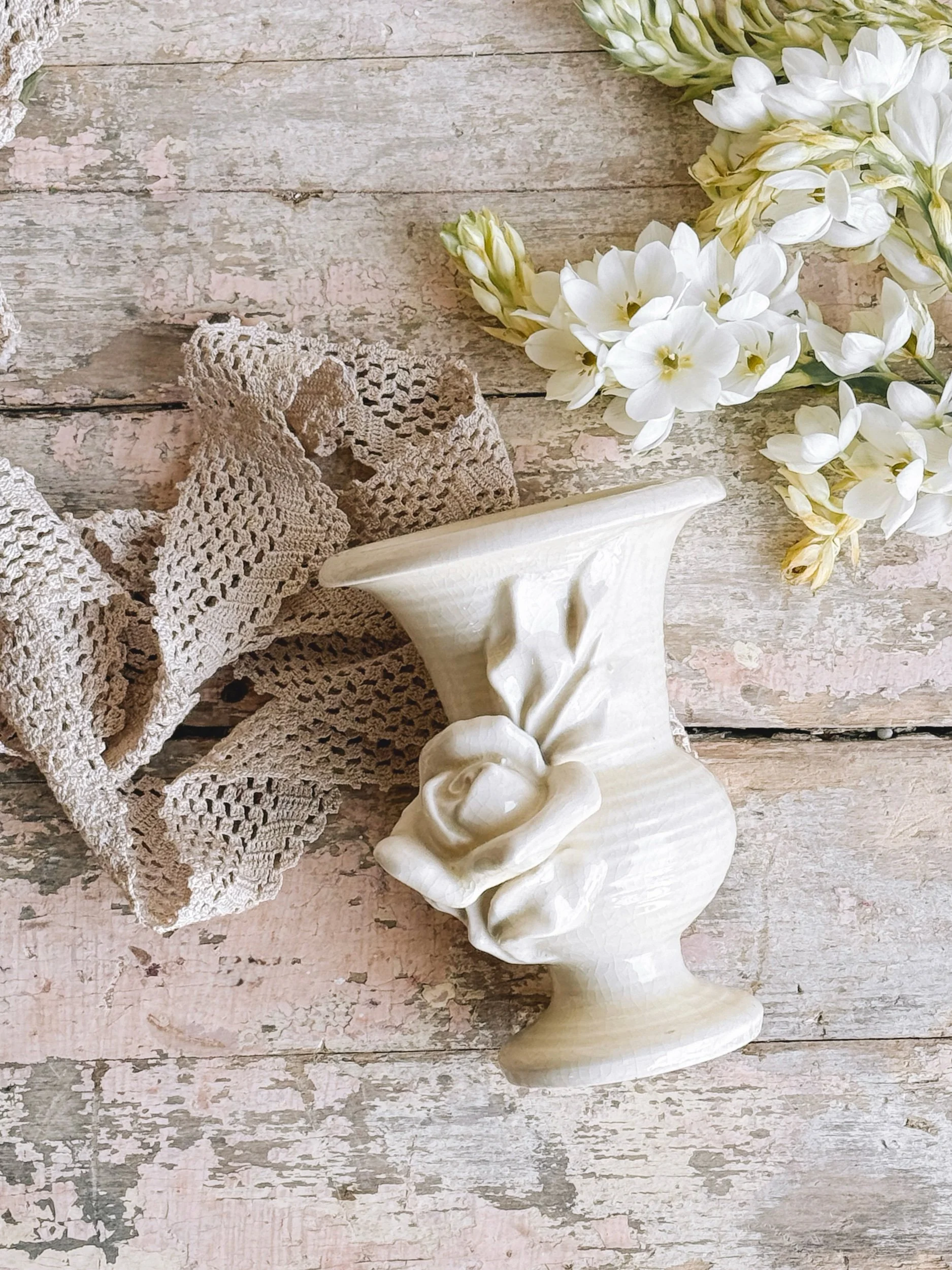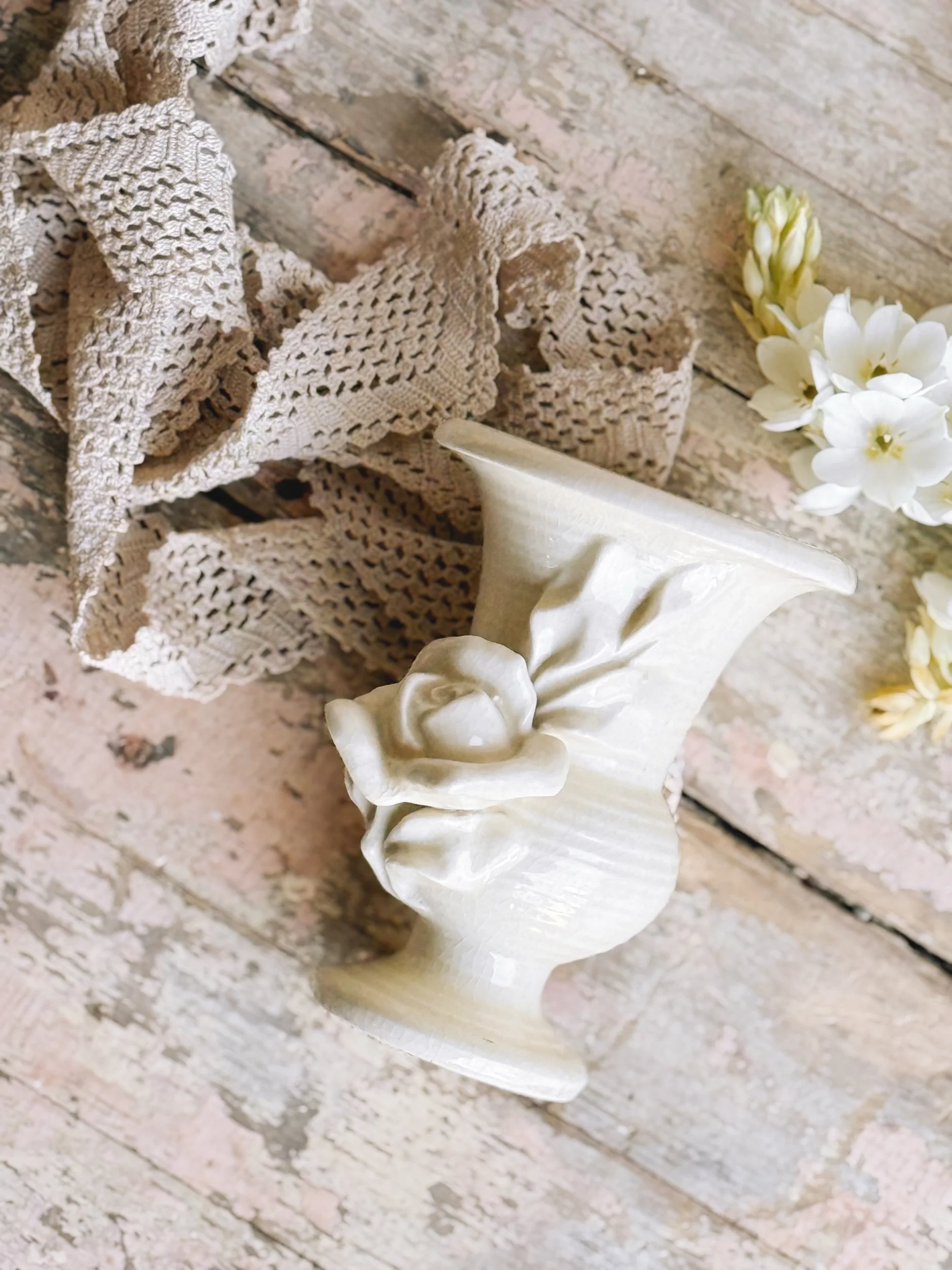 A beautifully detailed ironstone vase in a soft creamy tone, featuring a sculpted rose motif that adds a romantic, old-world touch.