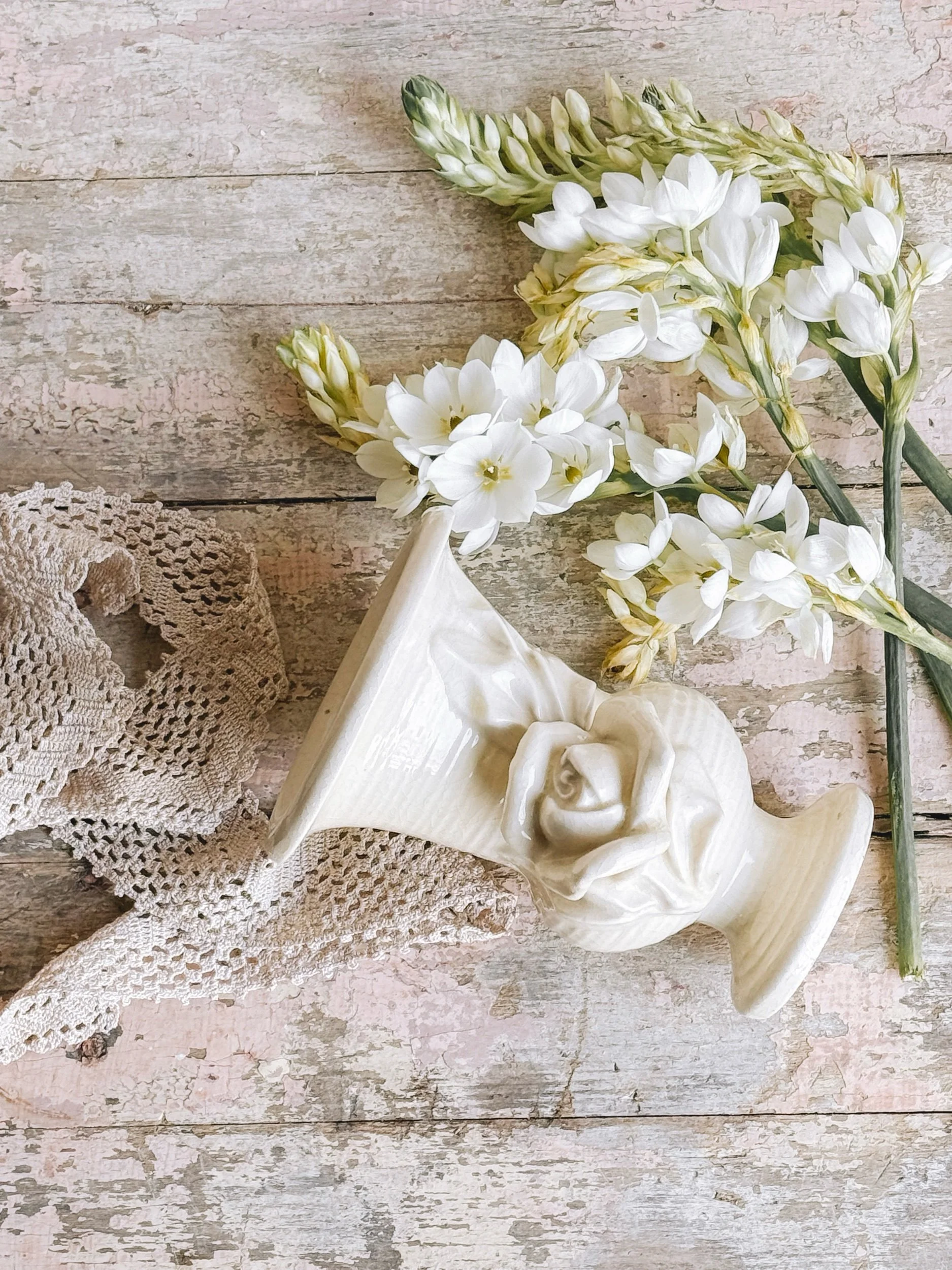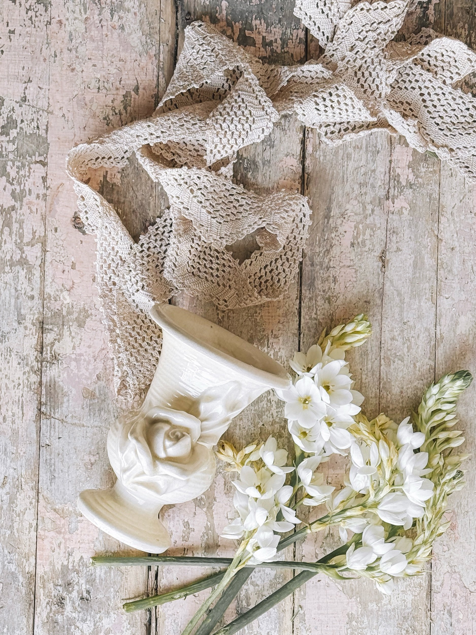 Also lovely styled on a shelf or bedside table as a standalone piece, paired with lace, linen, or antique frames.