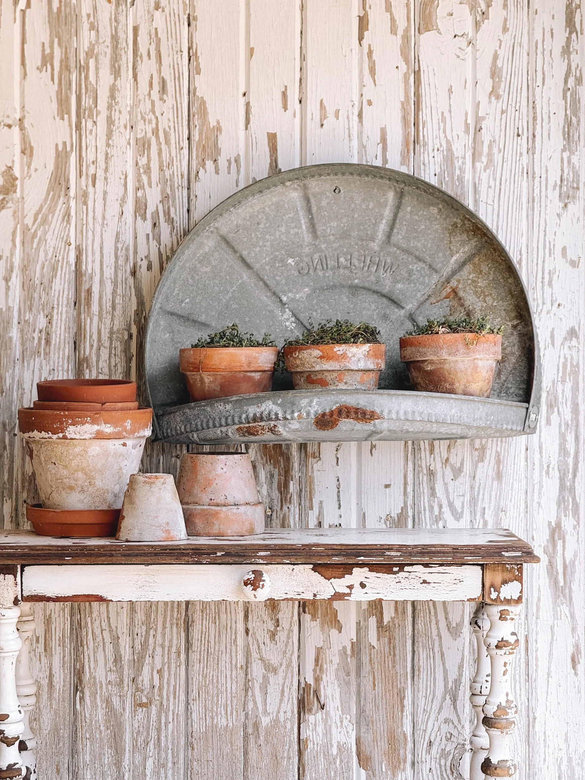 A beautifully timeworn galvanized wall pocket paired with three vintage garden pots, each carrying its own unique patina and character.
