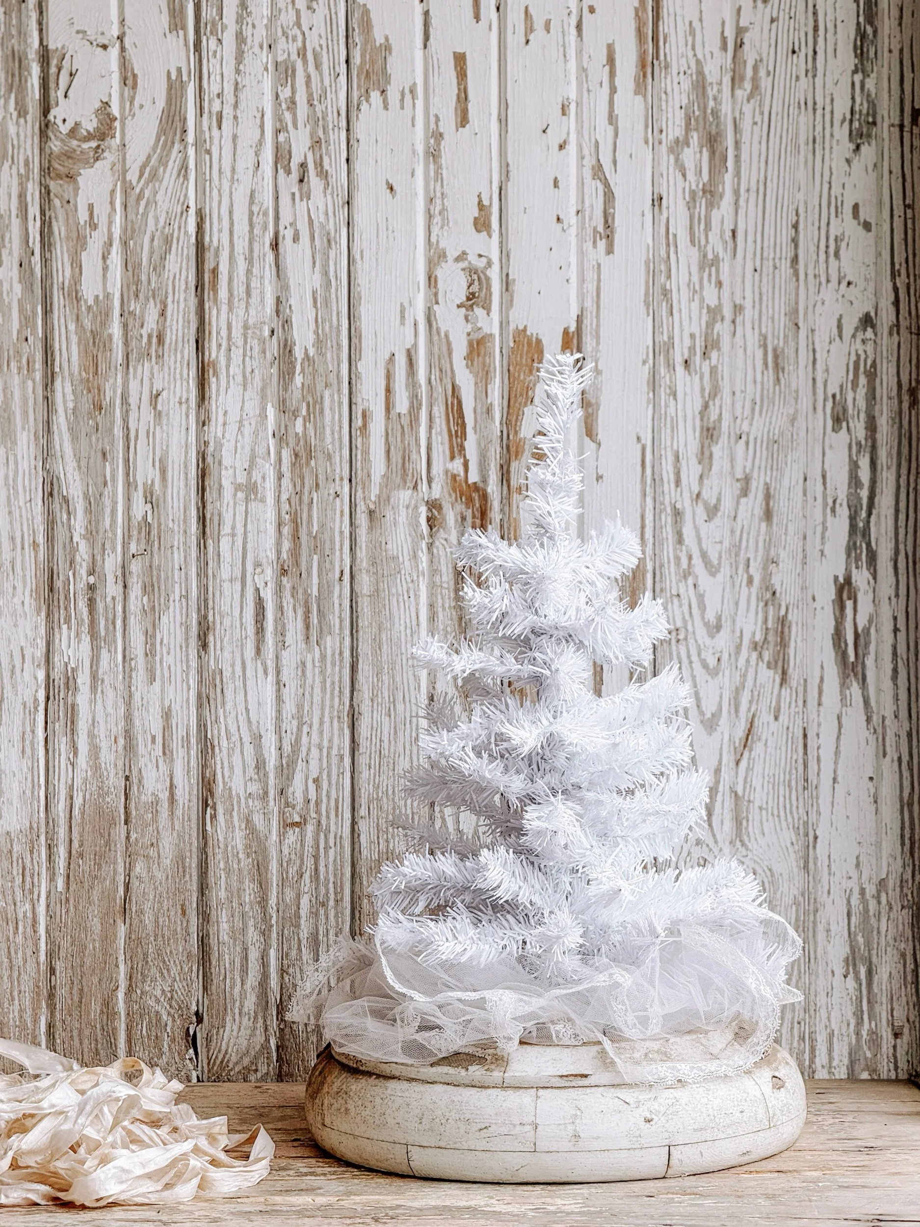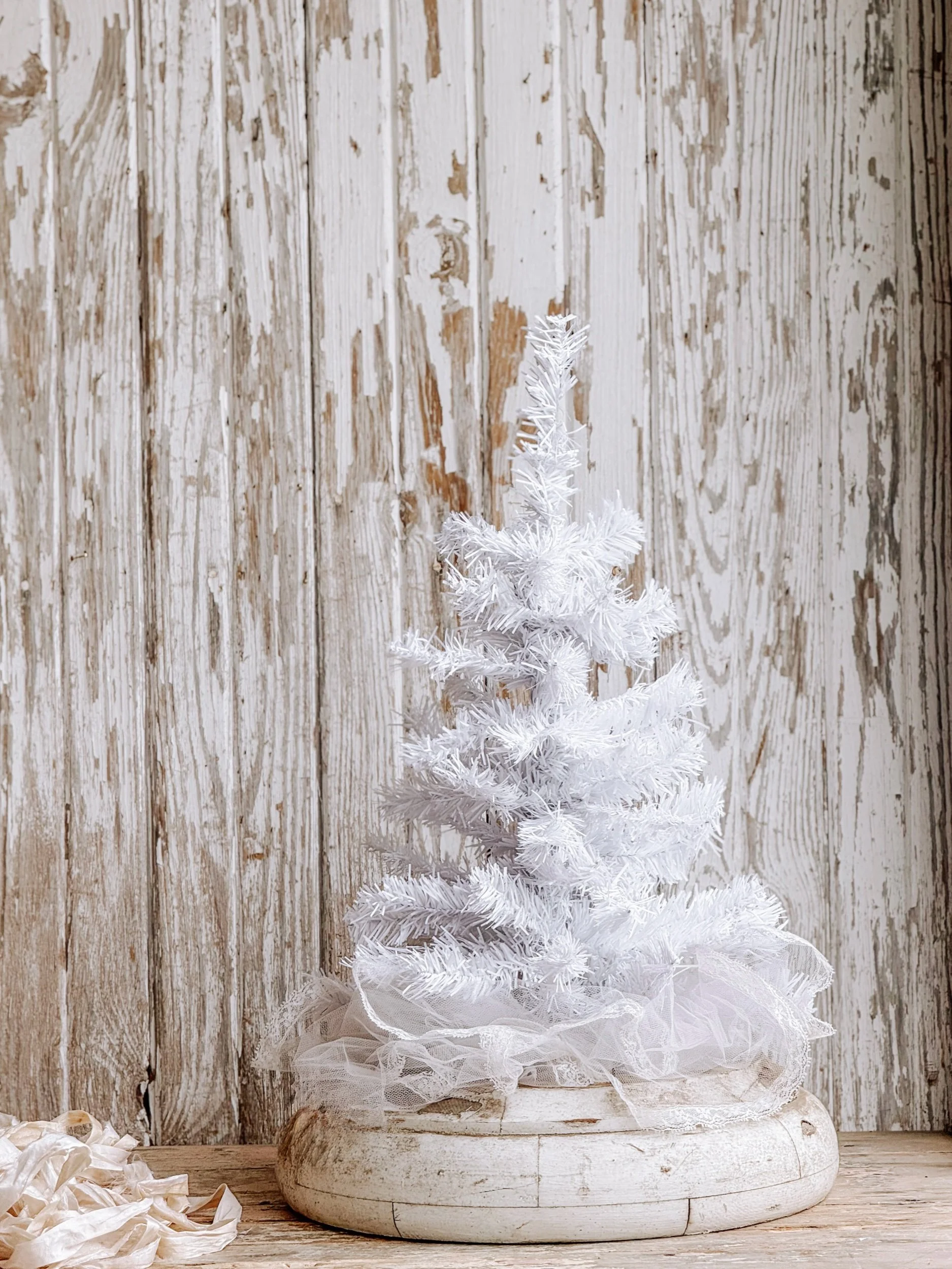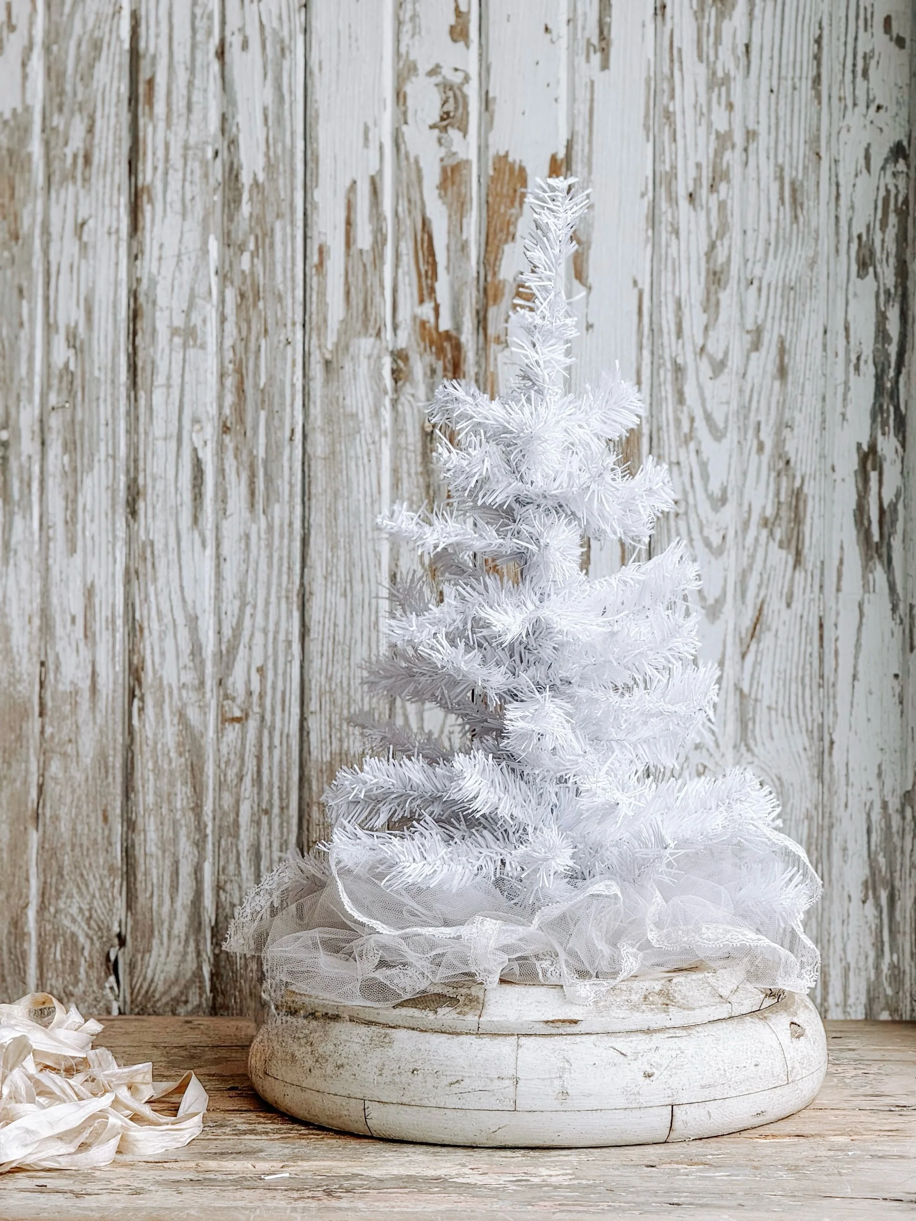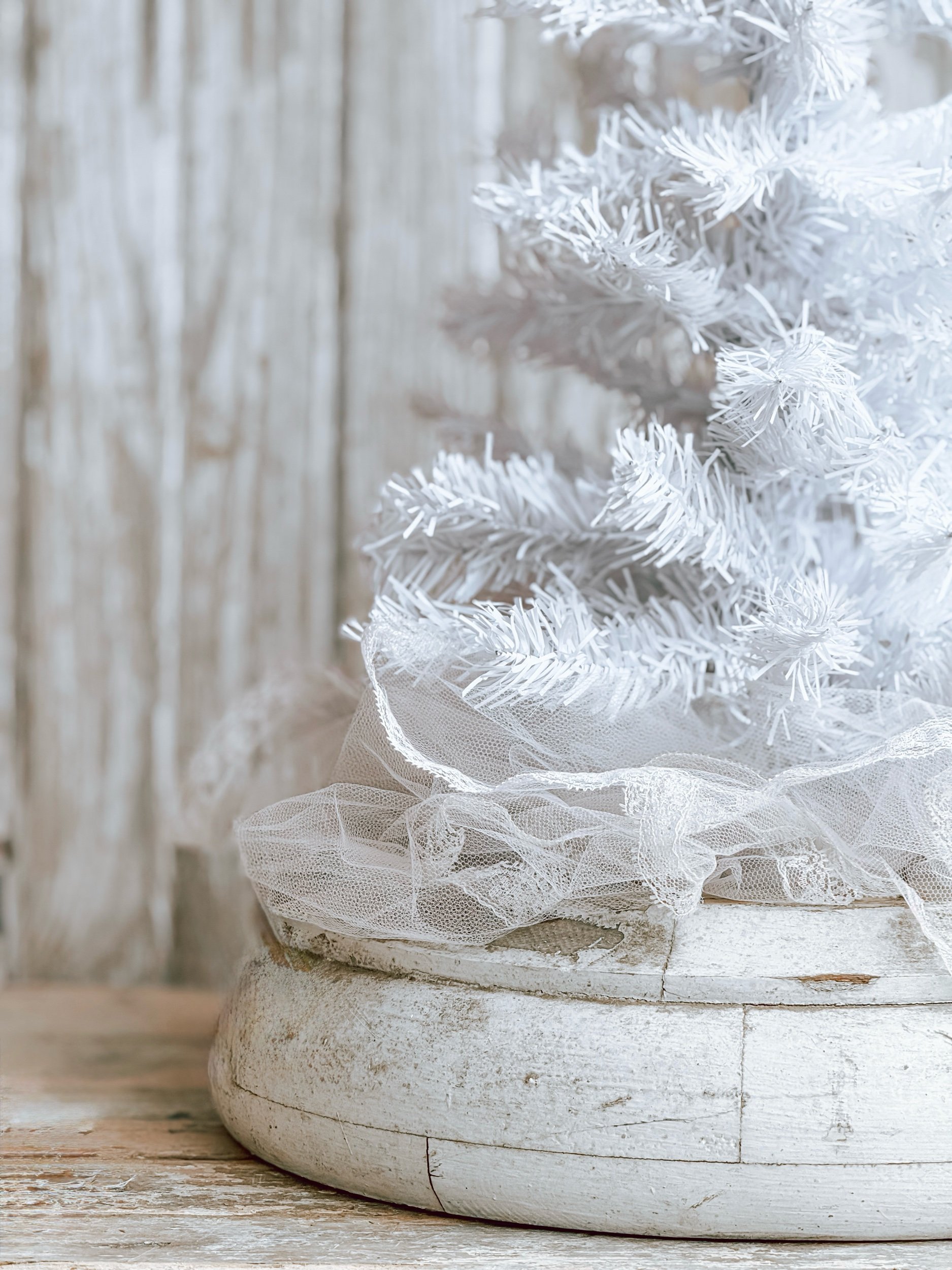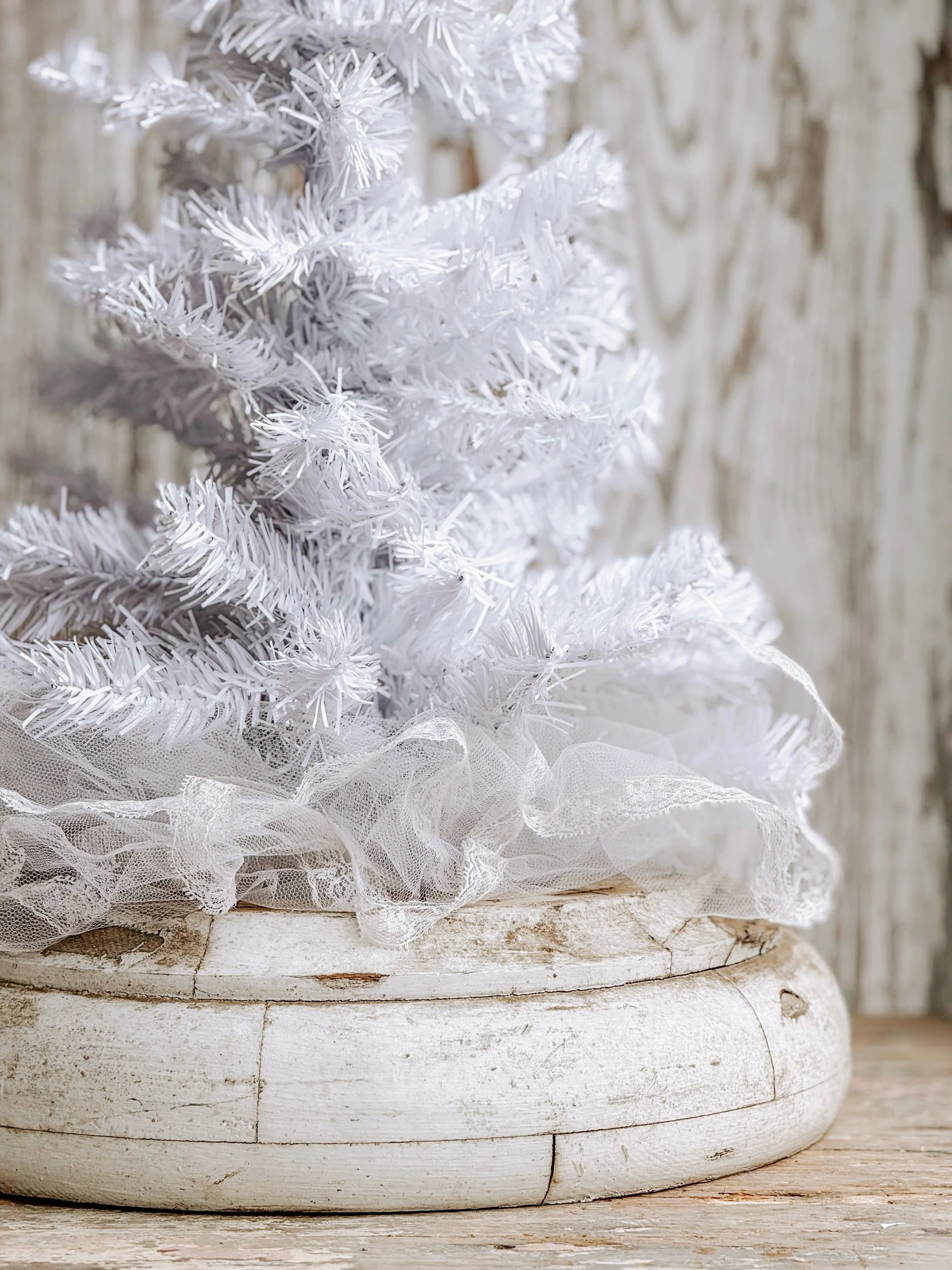 A striking antique salvaged winter white tree wrapped in delicate antique tulle and set into an oversized, timeworn salvaged base. The softly bristled branches create a full yet airy silhouette, while the layered tulle adds a subtle romantic softness at the base of the tree.