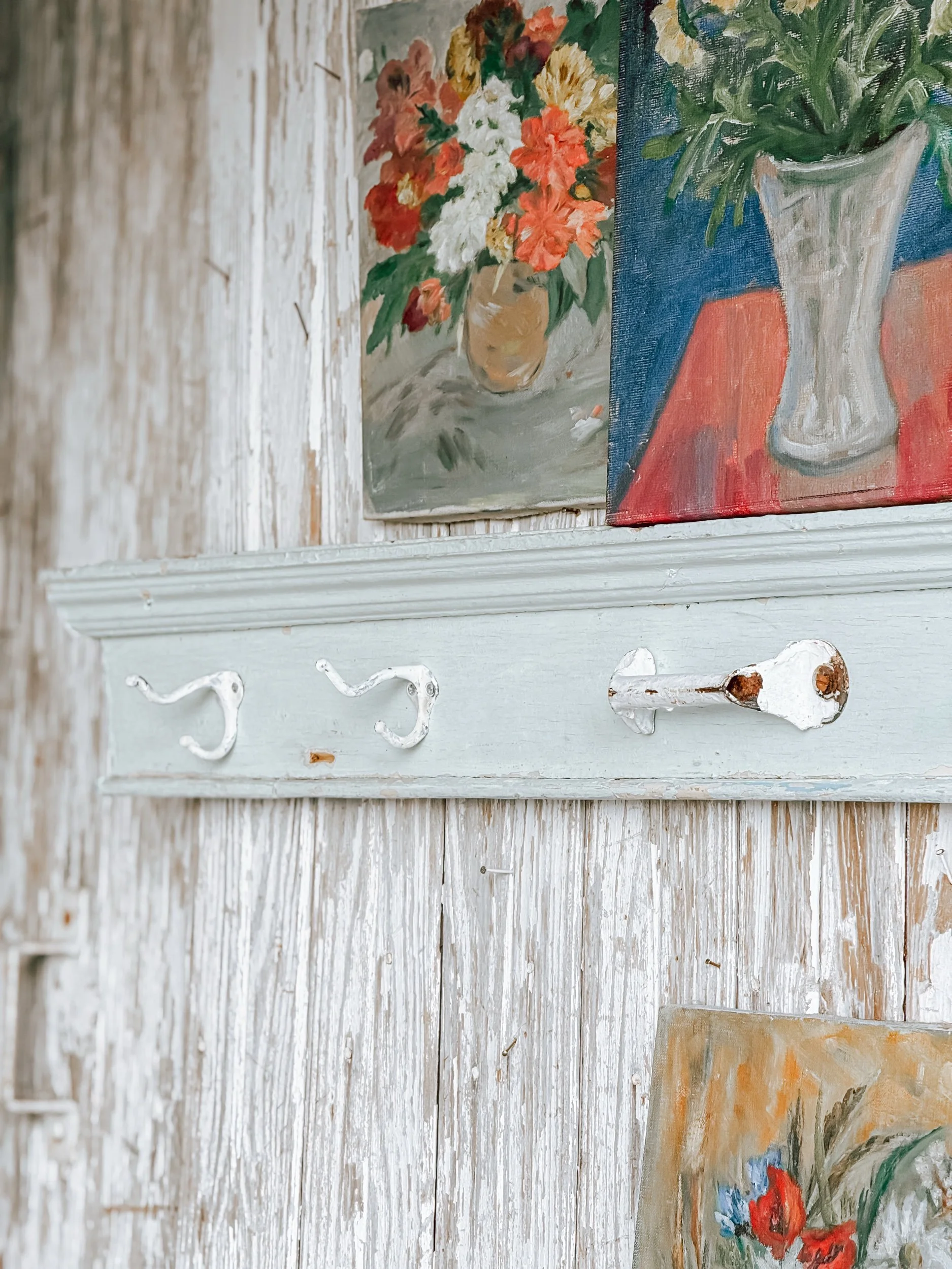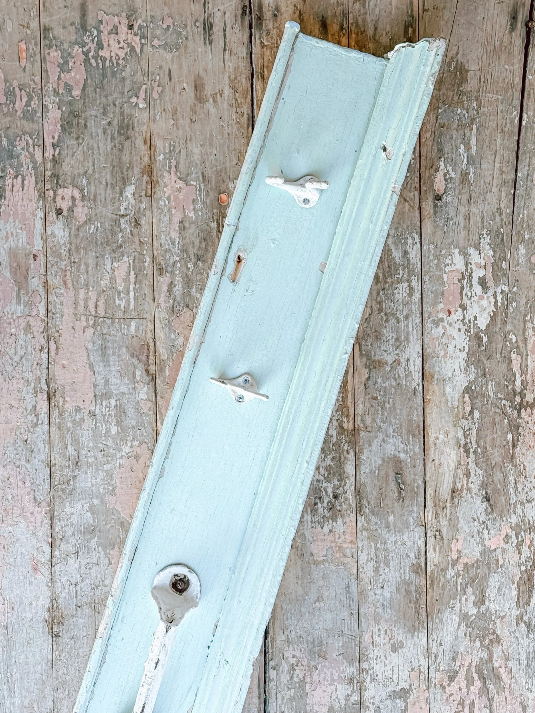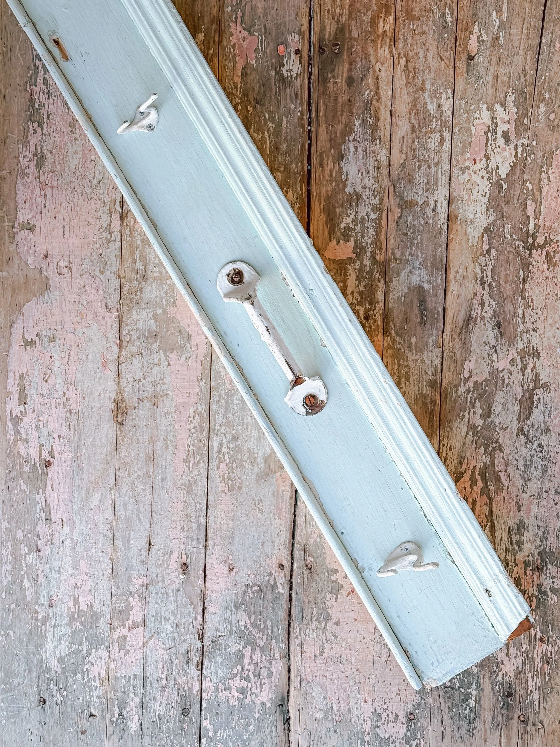A beautifully weathered antique salvaged peg board, finished in a soft pale blue with layers of age and timeworn character. Featuring original pegs and a lower ledge, this piece carries both charm and function—perfect for everyday use or decorative display.
