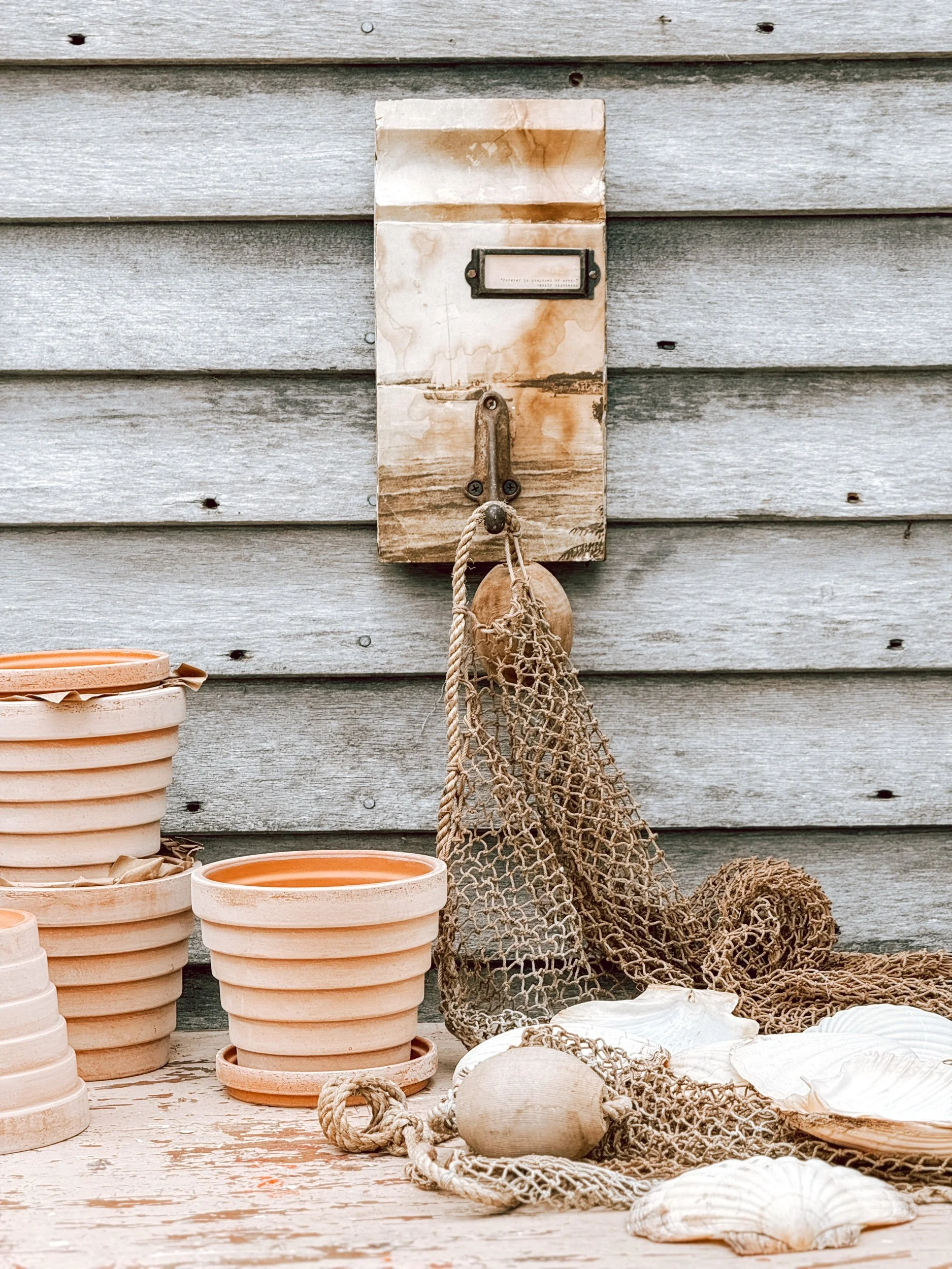 The surface carries a timeworn patina reminiscent of an old harbor cottage, while the mounted metal hook adds both strength and character. The subtle distressing and coastal imagery give it depth without feeling overly themed.