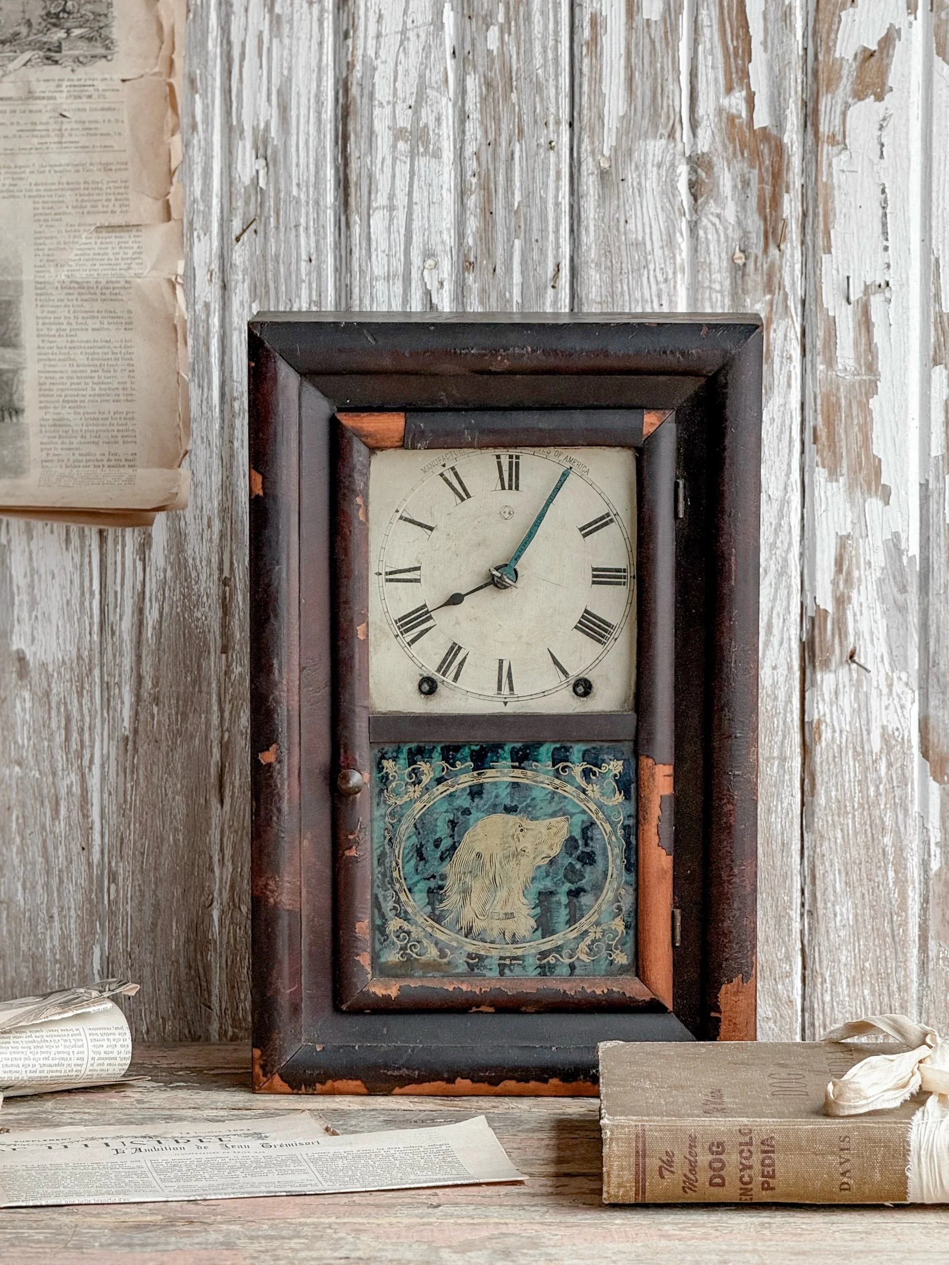 A truly special and soulful antique, this clock is a rare decorative treasure. The worn black case, time-softened edges, and beautifully aged patina frame a charming hand-painted dog panel below the clock face — an unexpected and delightful detail that gives this piece its story.