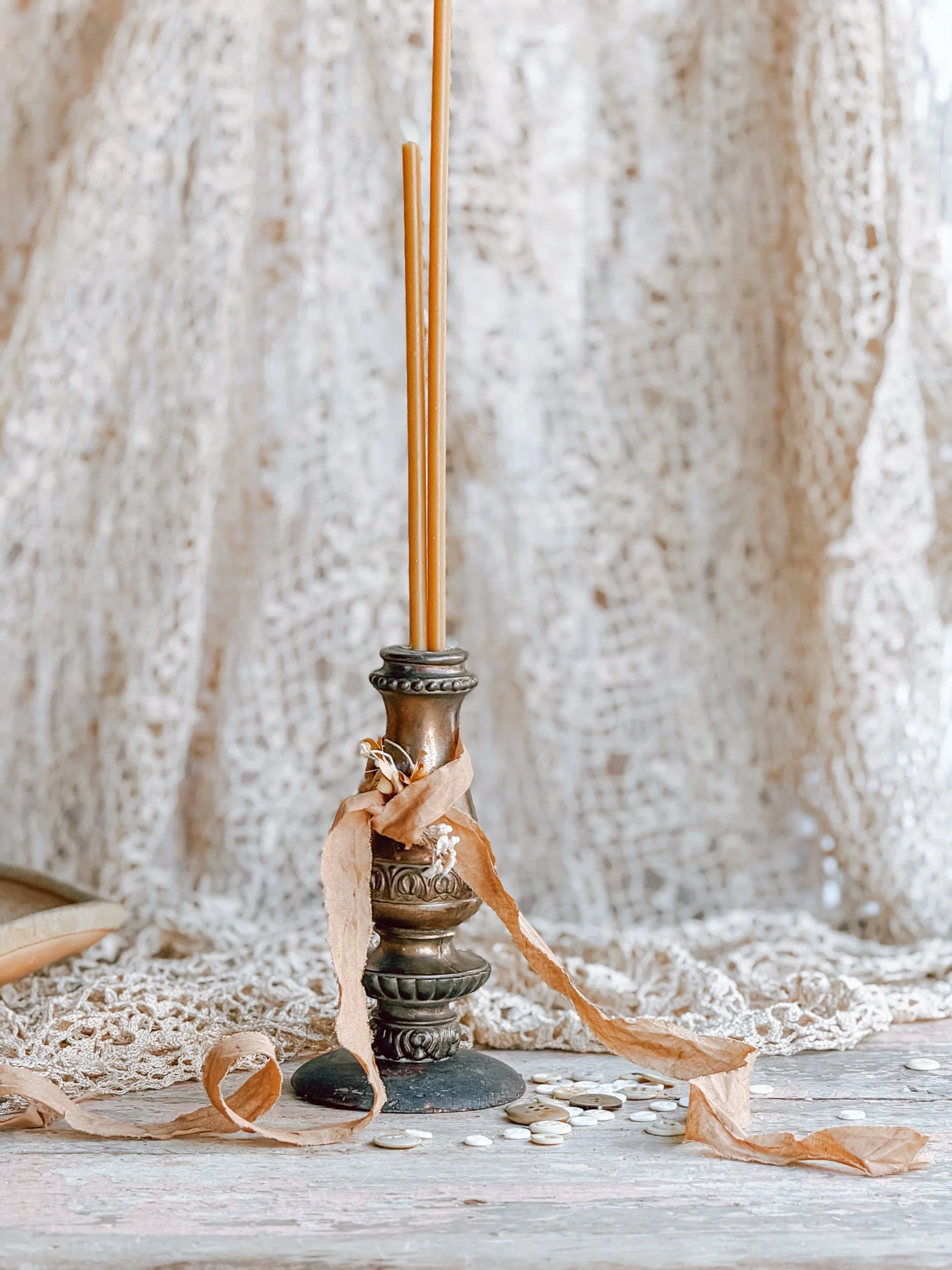Finished with a hand-dyed ribbon and paired with a taper candle, this piece arrives ready to style — perfect for a mantel, table setting, or quiet corner that calls for warmth and age.