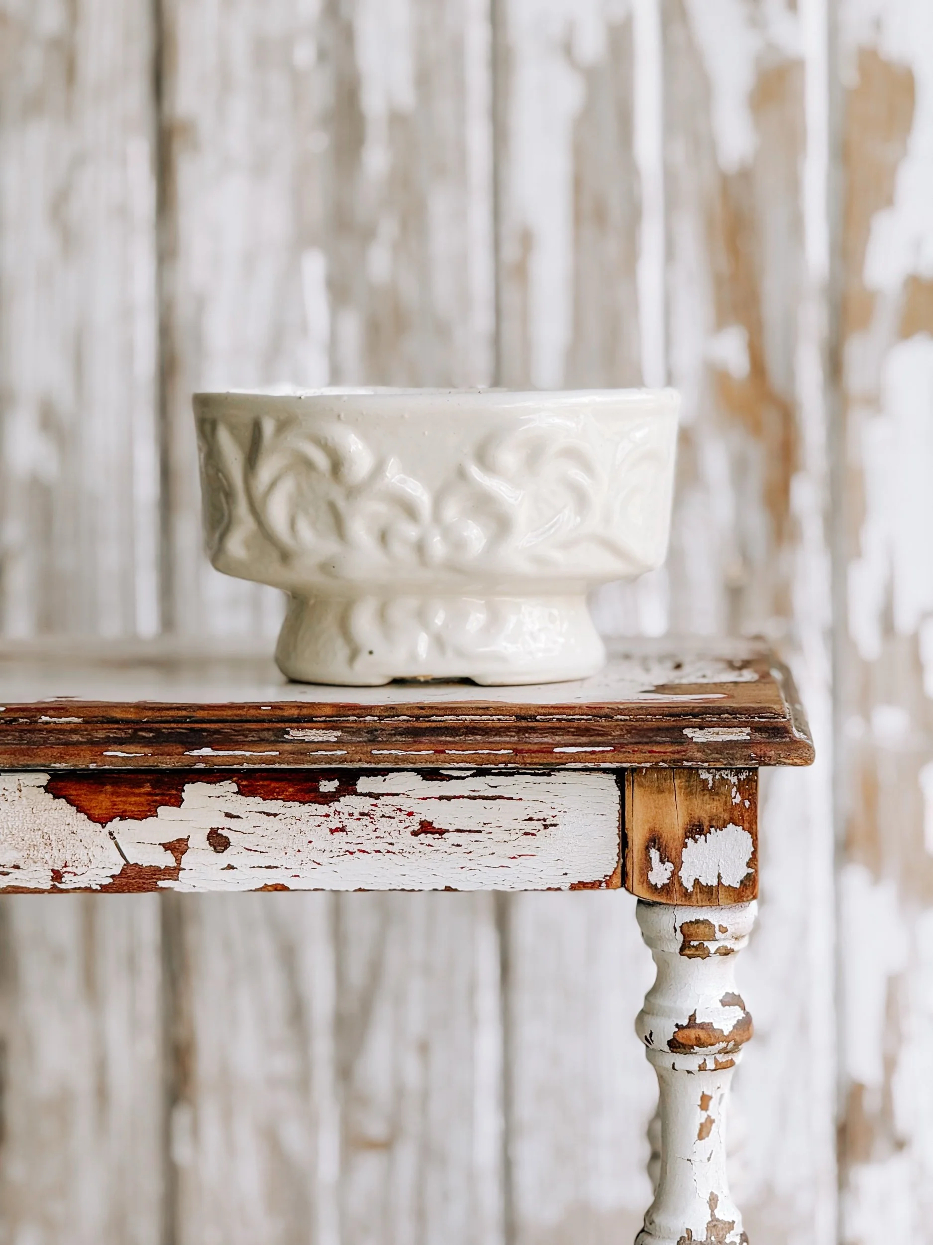 A beautifully aged vintage ironstone planter with soft, creamy tones and delicate raised detailing that wraps gently around the form.