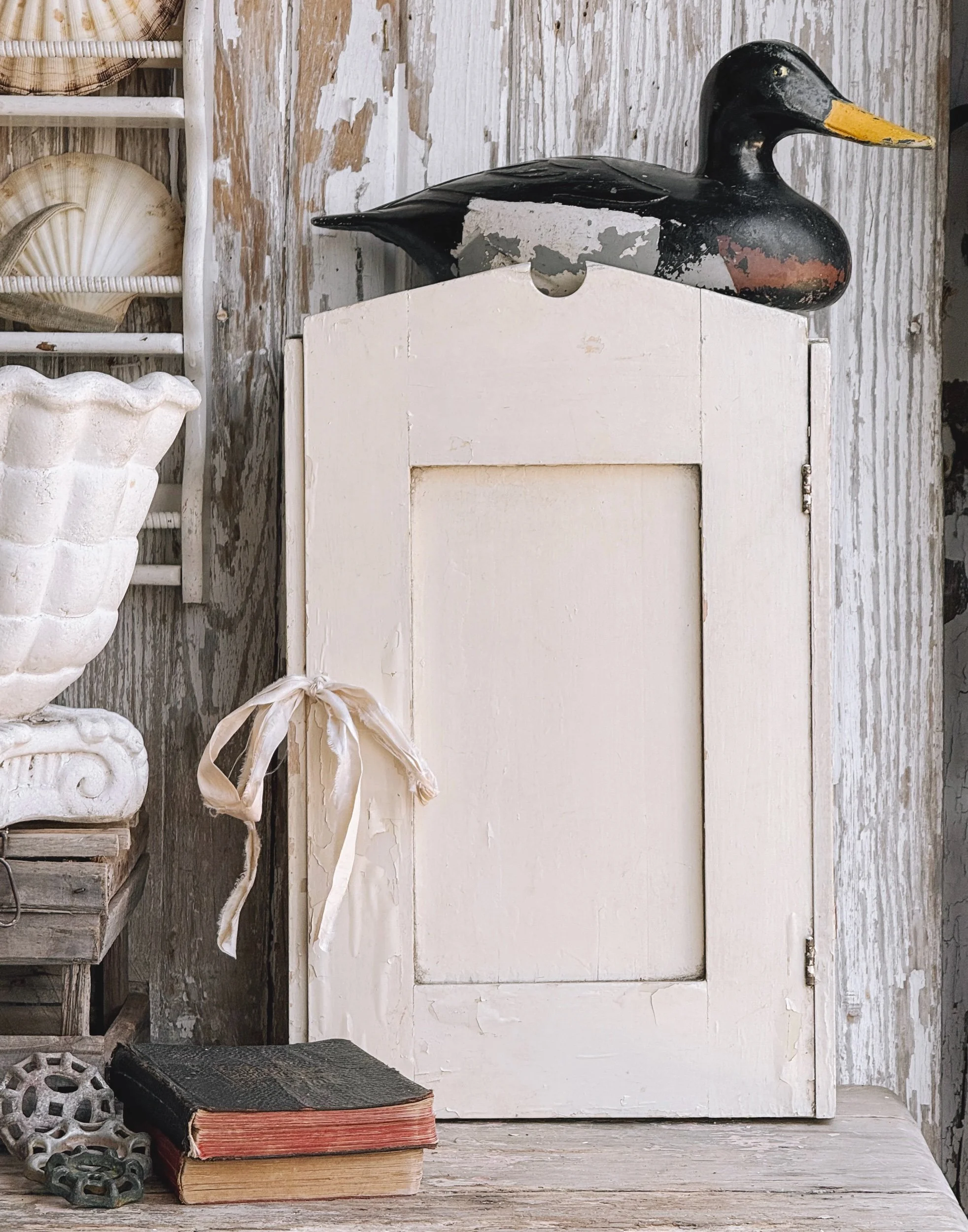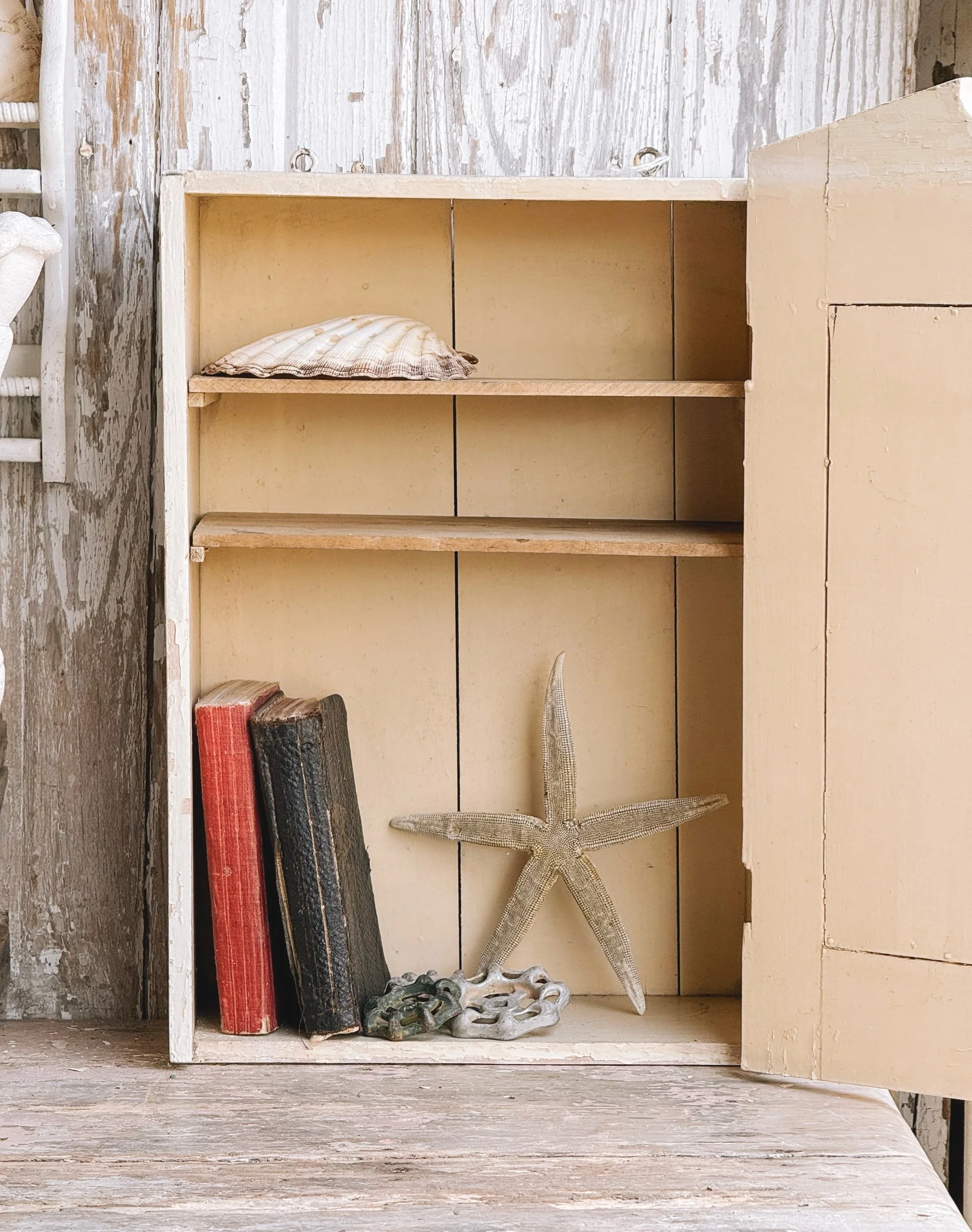 This piece has a simple, timeless silhouette with a perfectly worn surface that reveals layers of age and character. The subtle imperfections and chippy finish give it that lived-in, collected feel that blends effortlessly into both coastal and cottage interiors.