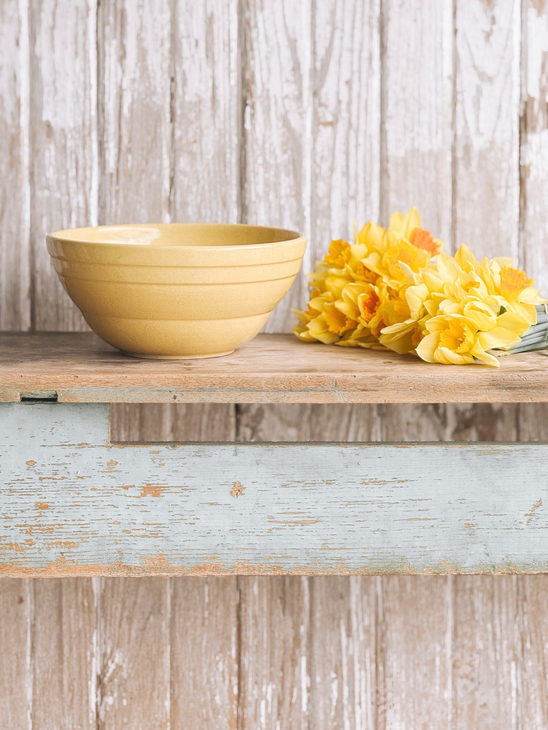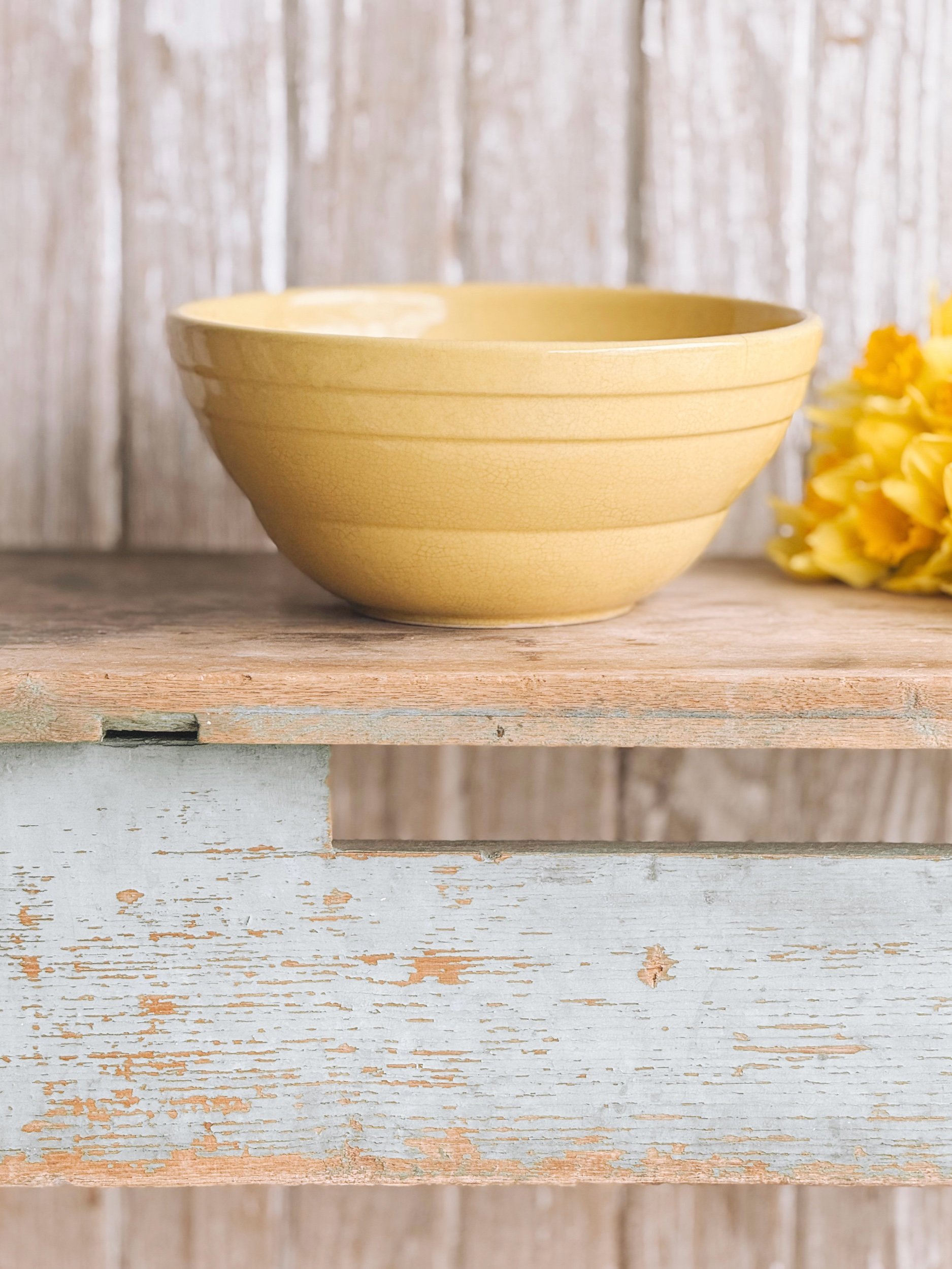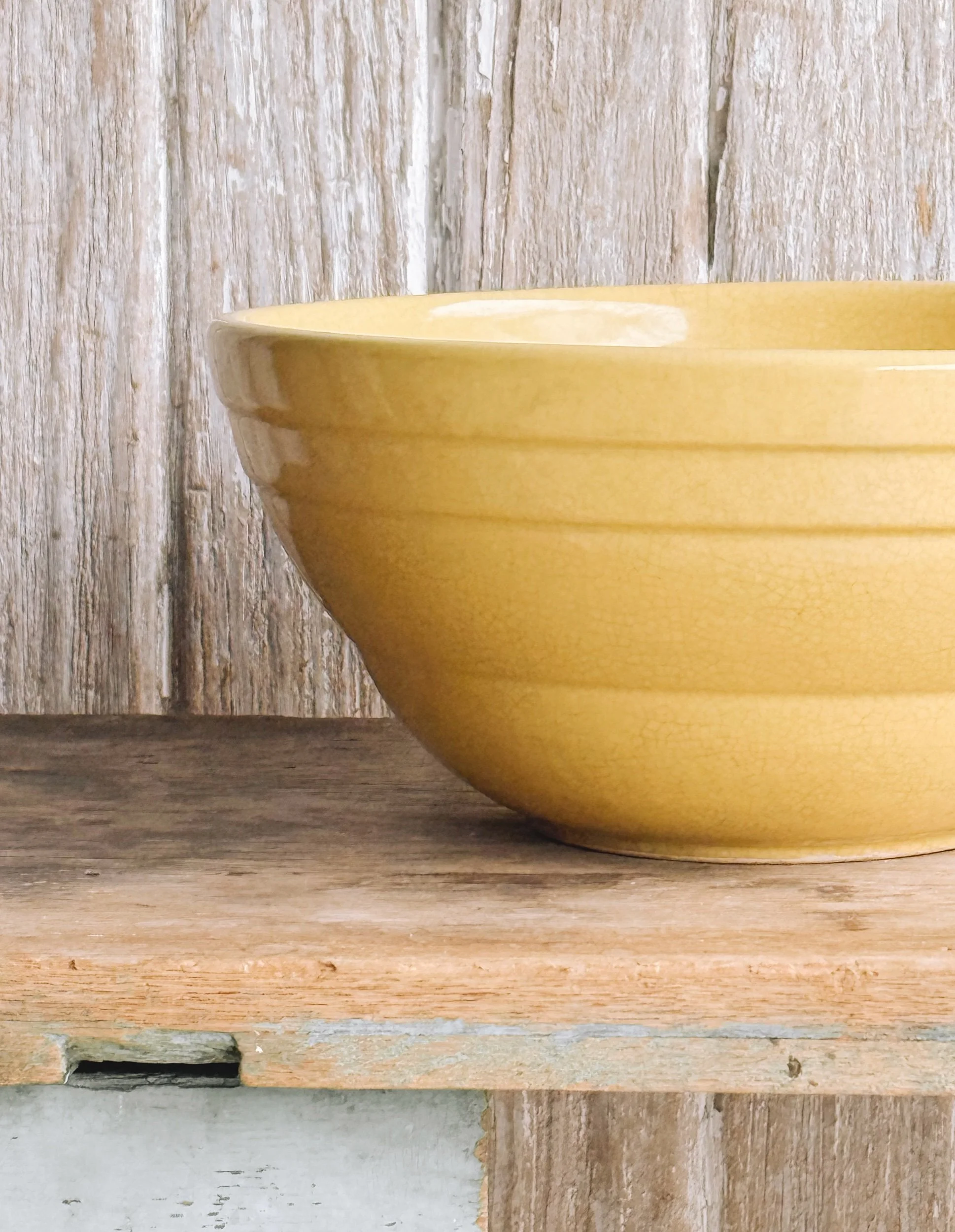 A classic vintage yellowware mixing bowl with a warm, golden tone and softly worn character. The subtle banded detail and gentle crazing give it that timeless, well-loved feel that only comes with age.