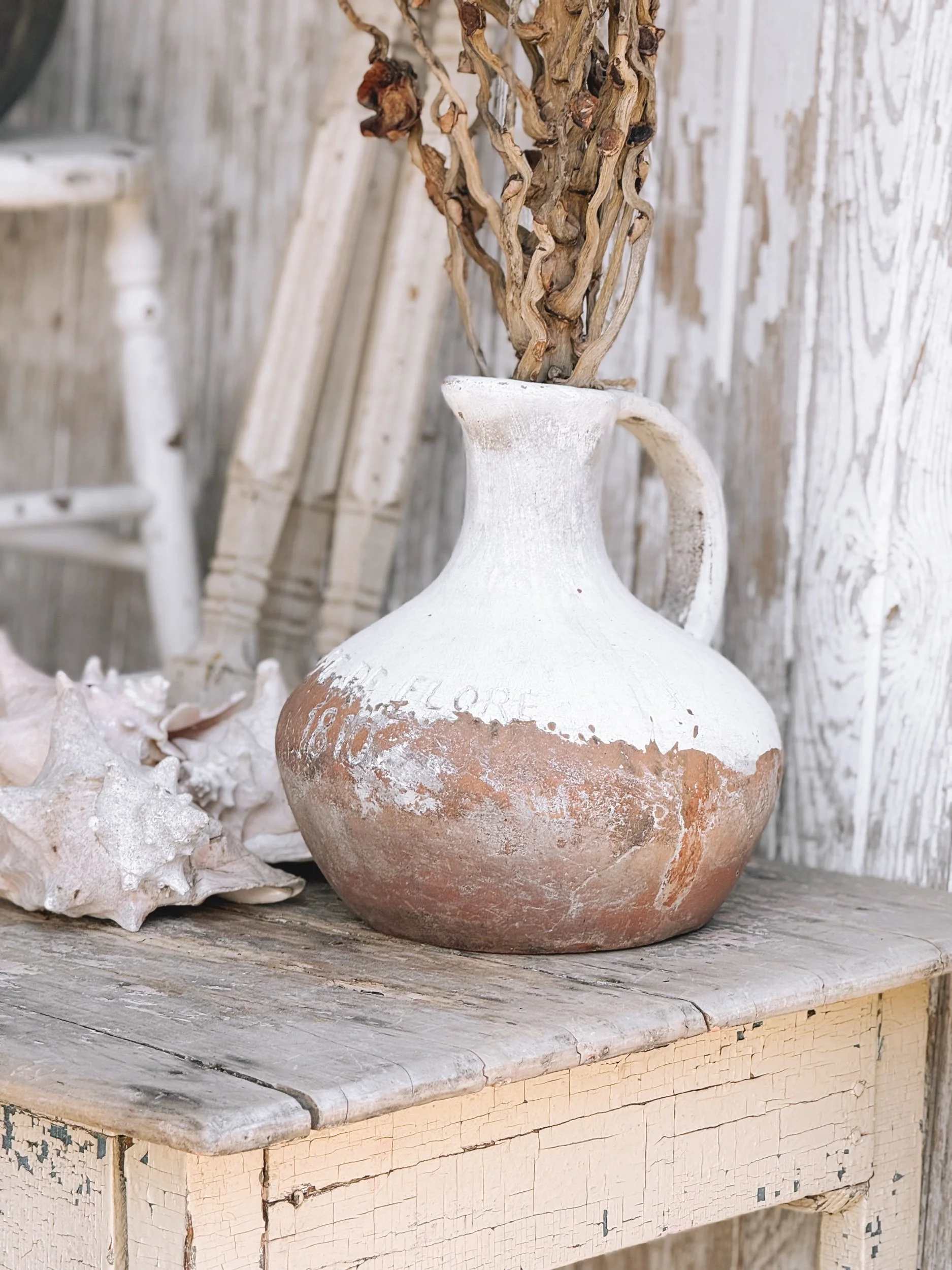 A beautiful vintage terracotta jug featuring an aged whitewashed finish over warm clay tones. The vessel is marked “White de Flor 1810”, giving it wonderful old-world European character.
