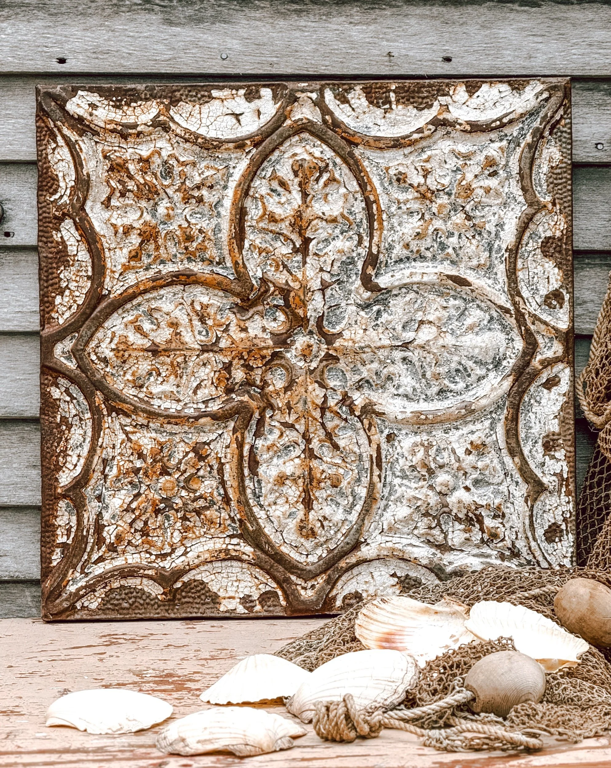 This architectural fragment carries layers of authentic patina — creamy crackle, oxidized rust tones, and beautifully aged texture that only time can create. The dimensional relief and intricate pattern give the piece depth and presence, making it a powerful focal point whether leaned on a mantel, styled on a console, or mounted on the wall.