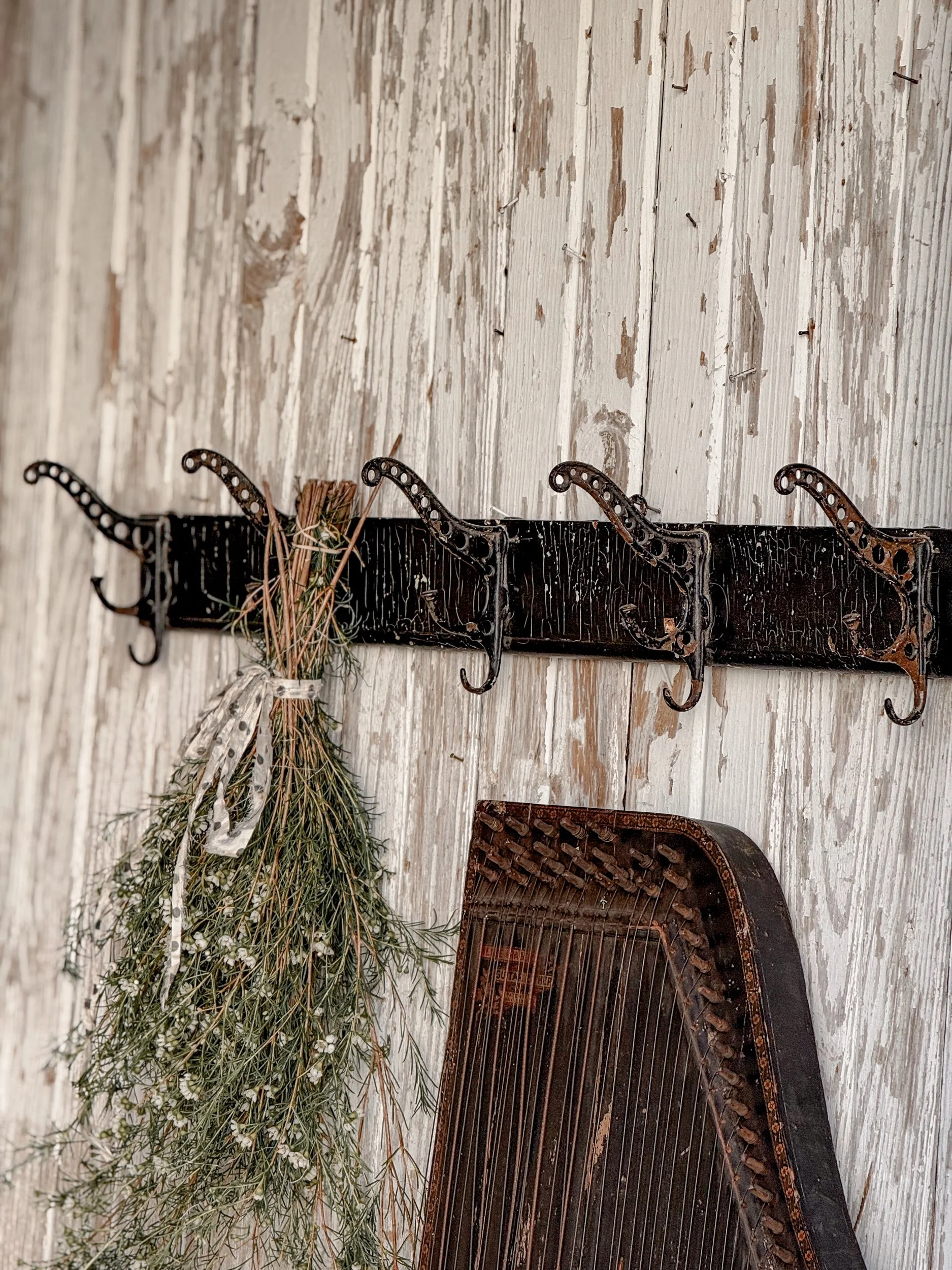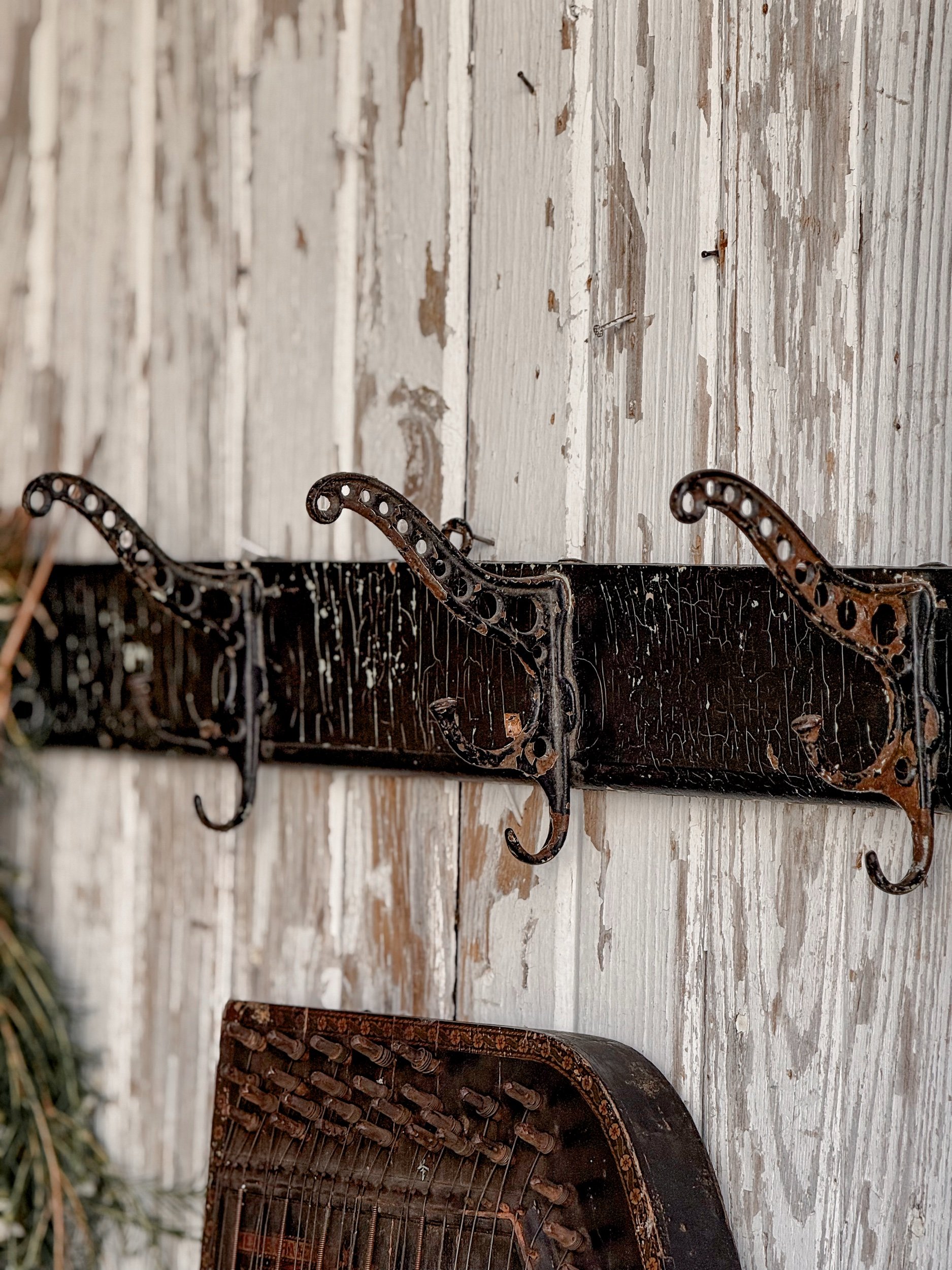A beautifully aged antique coat rack featuring ornate wrought iron hooks mounted to a dark wooden backboard. The curved hook design, with its delicate pierced detailing, adds a sense of movement and craftsmanship that feels both rustic and refined.