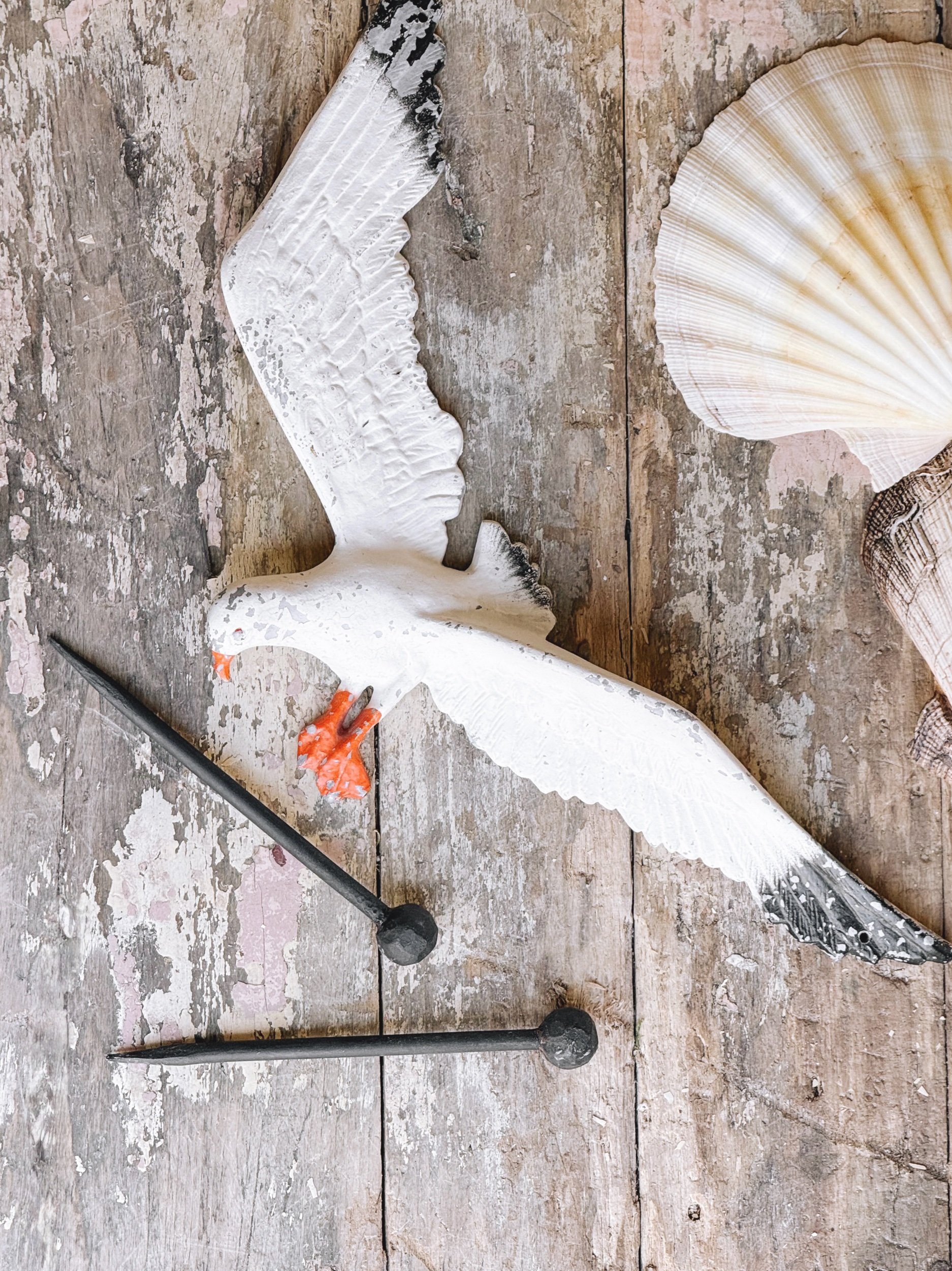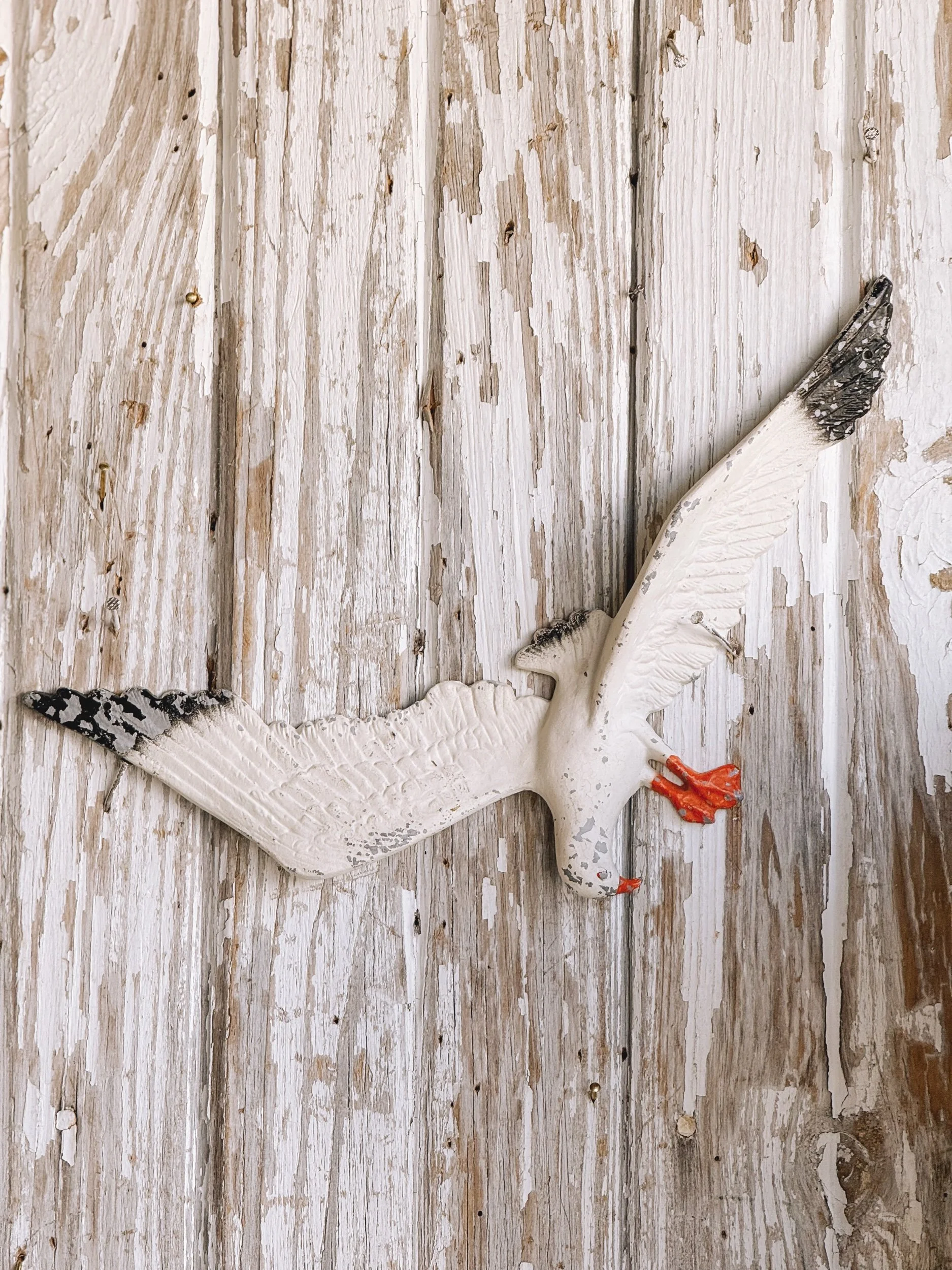 The seagull has a timeworn finish with subtle chipping and character throughout, giving it that authentic, seaside-found feel. The two iron hooks complement it perfectly—simple, sturdy, and full of rustic charm.