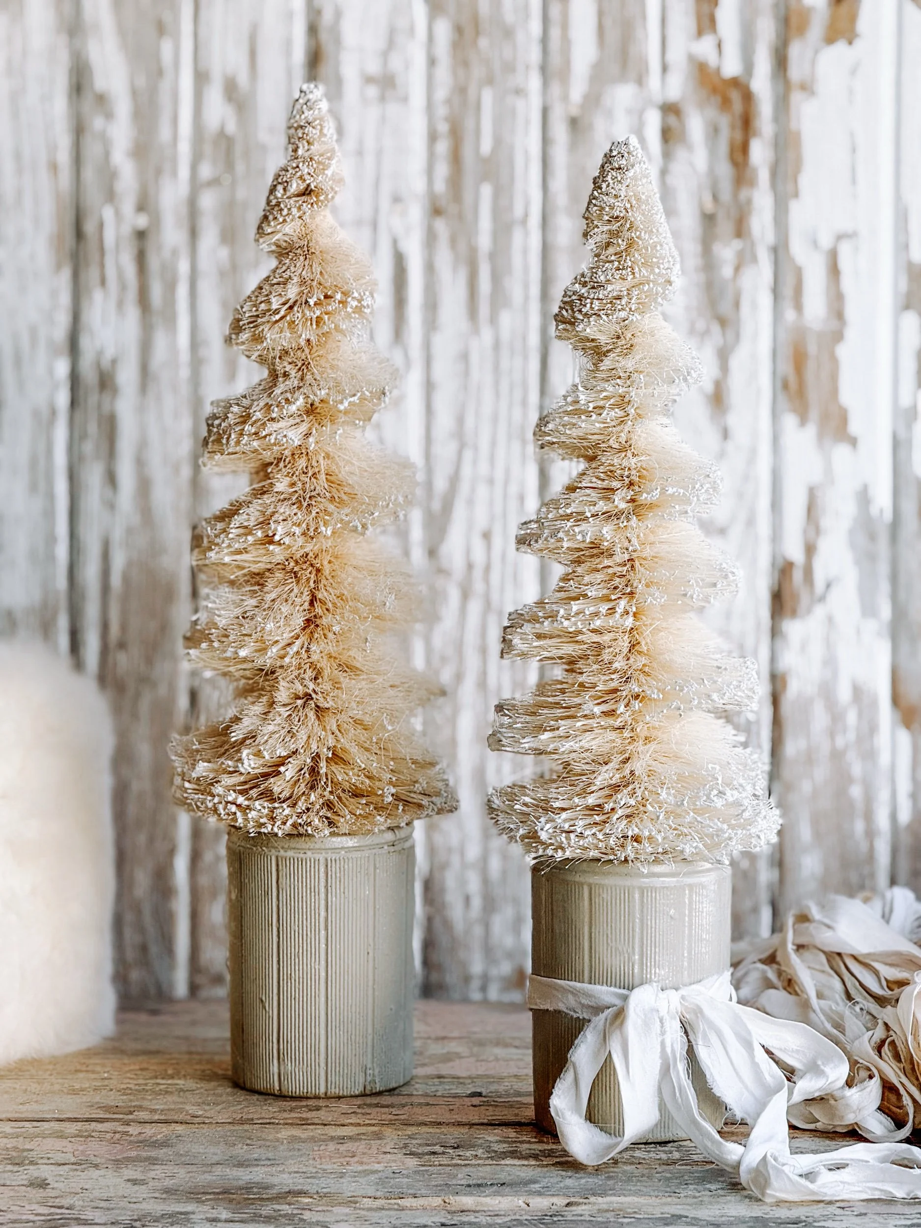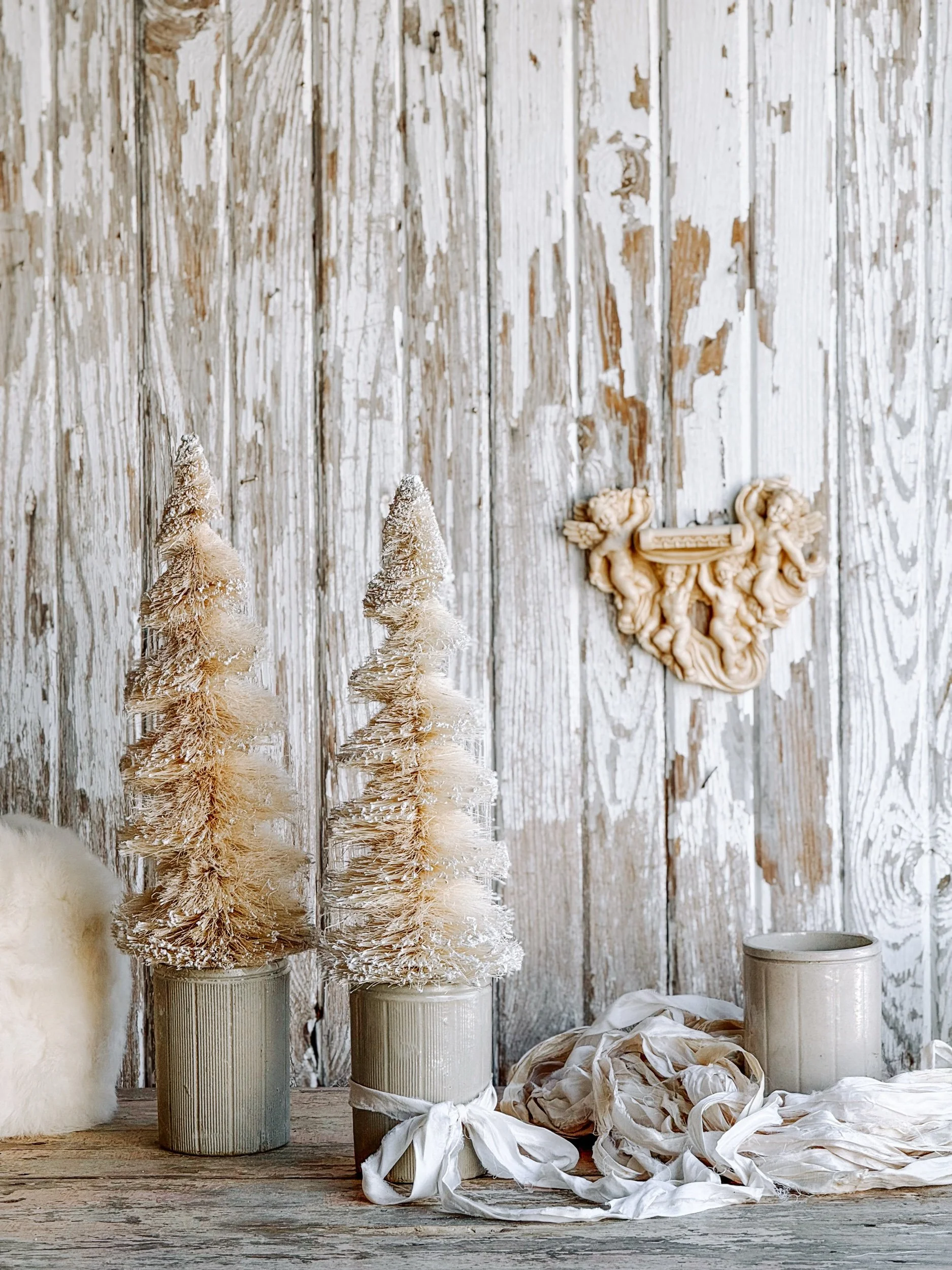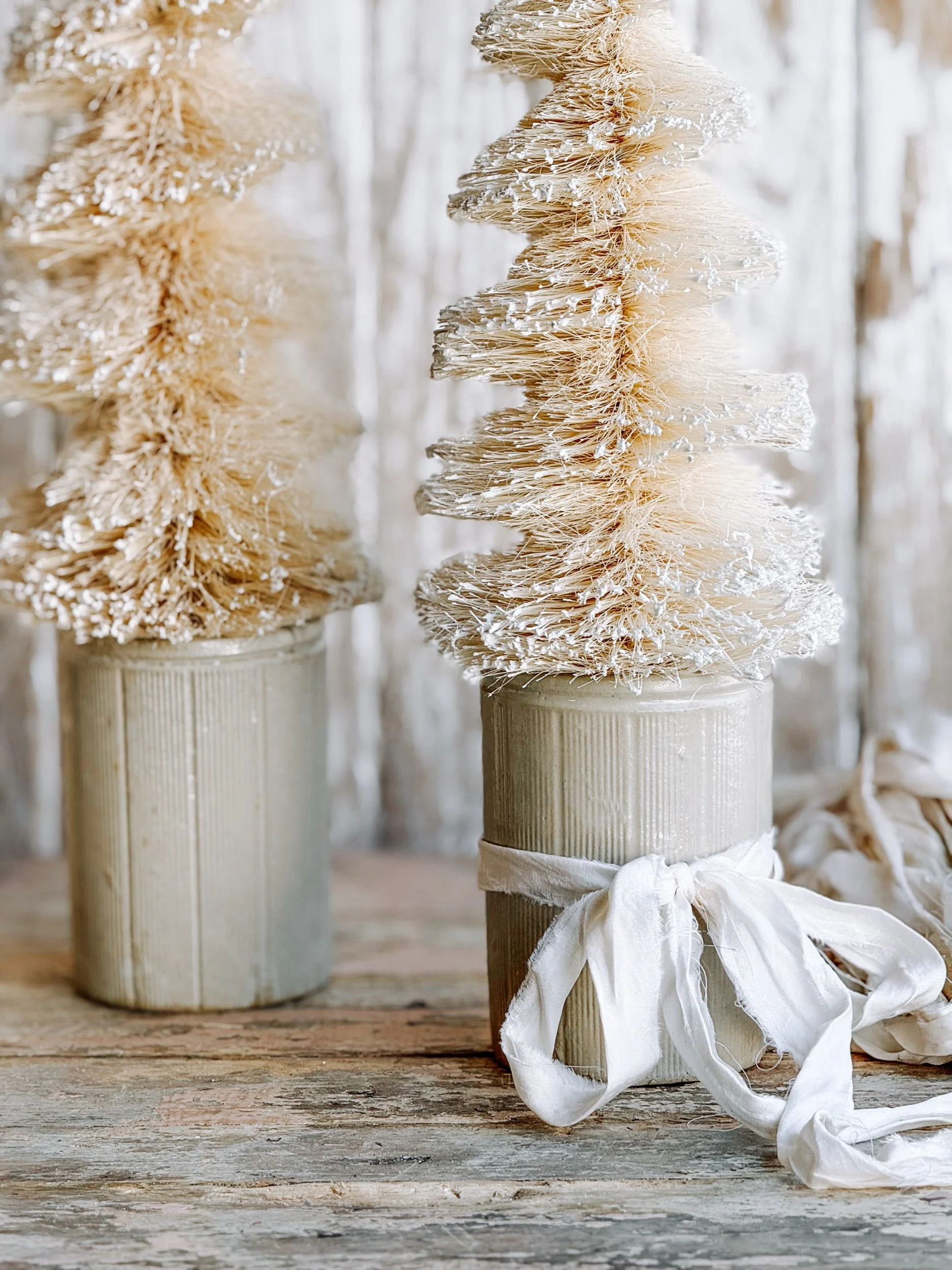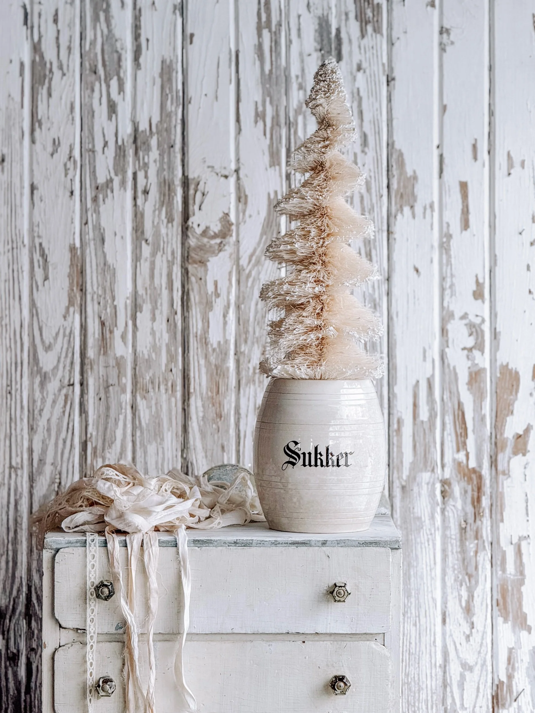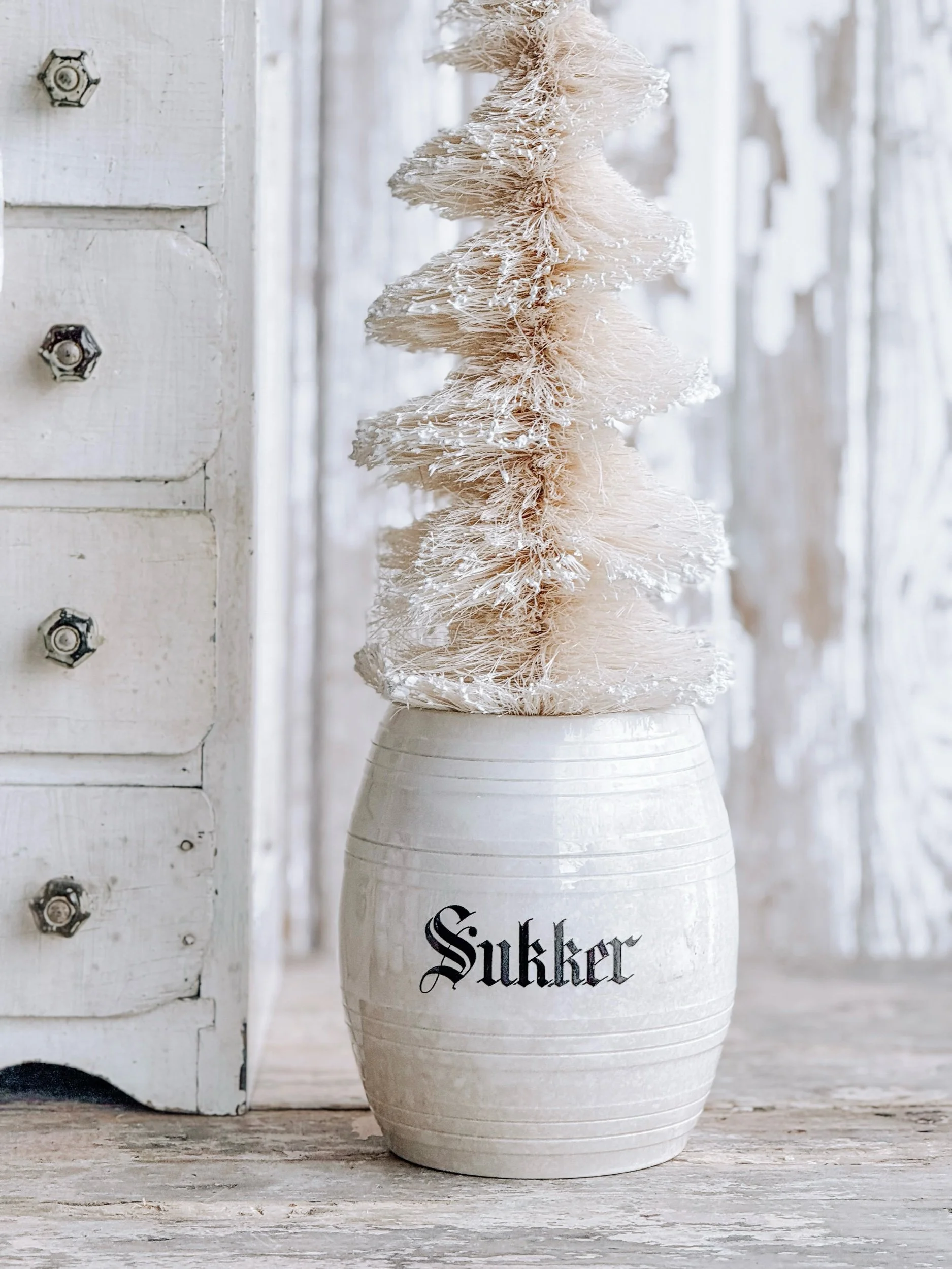 A softly aged antique European ironstone mailing pot styled with a creamy white winter tree and wrapped in recycled ribbon. The gentle, neutral tones create a timeless winter vignette that feels calm, collected, and quietly festive.