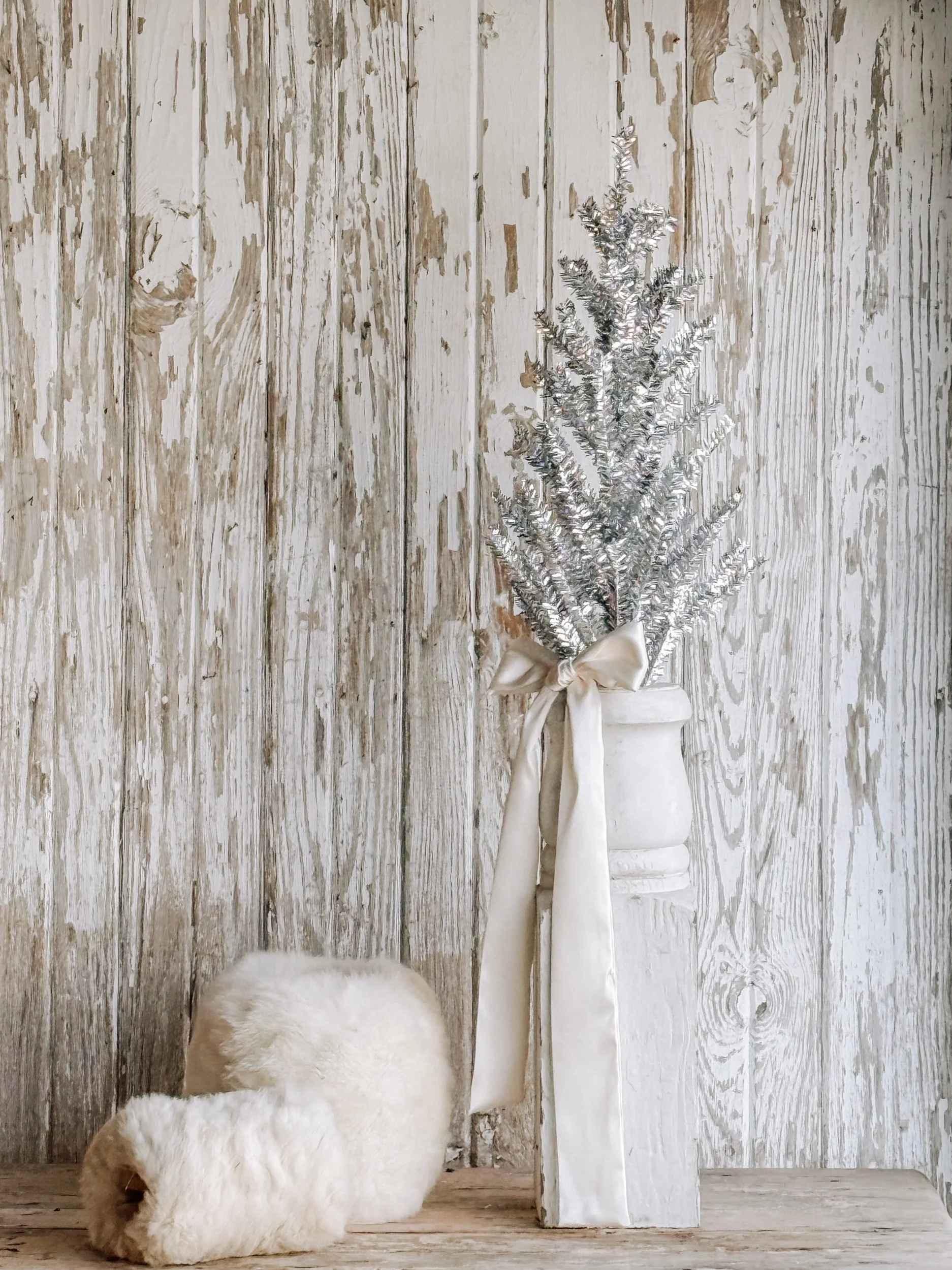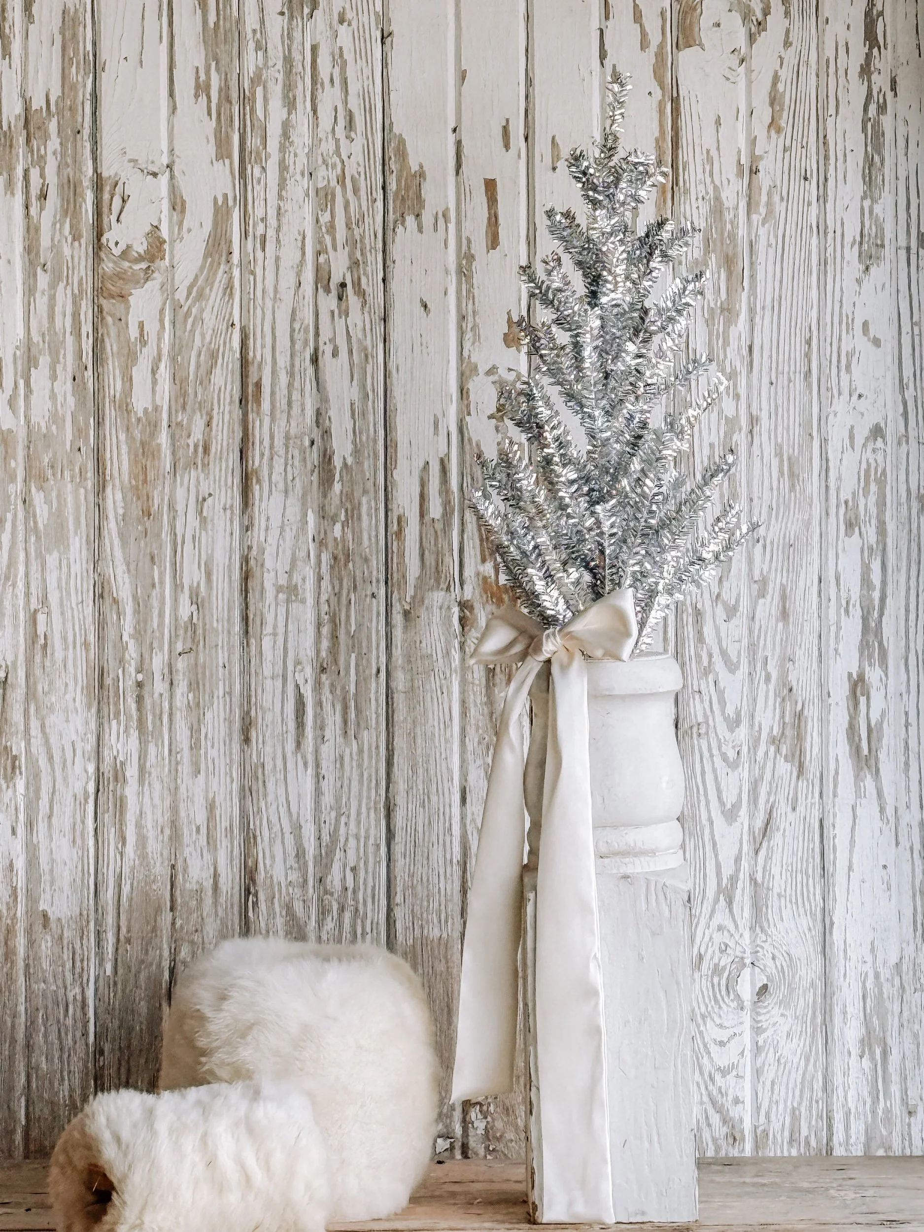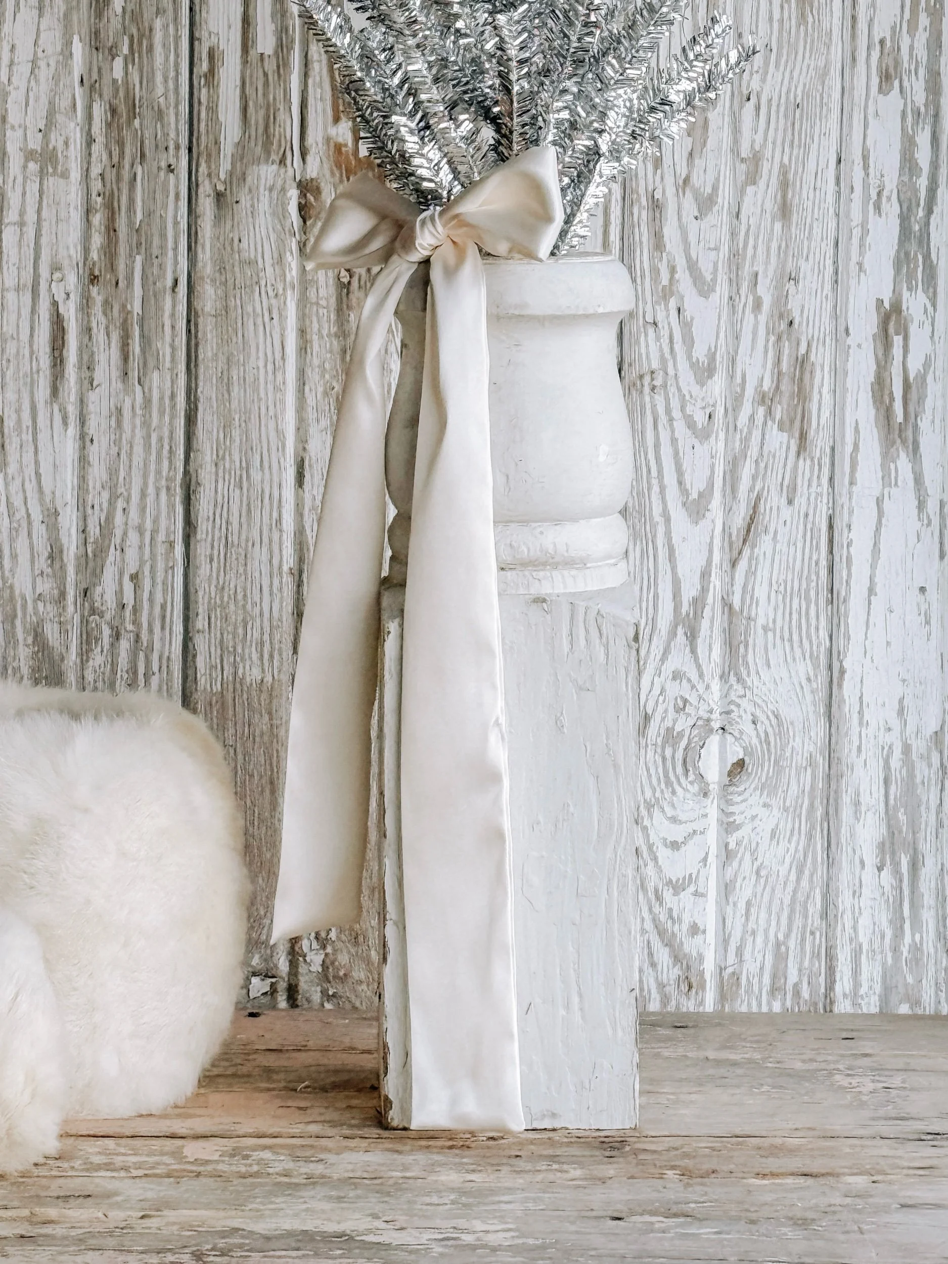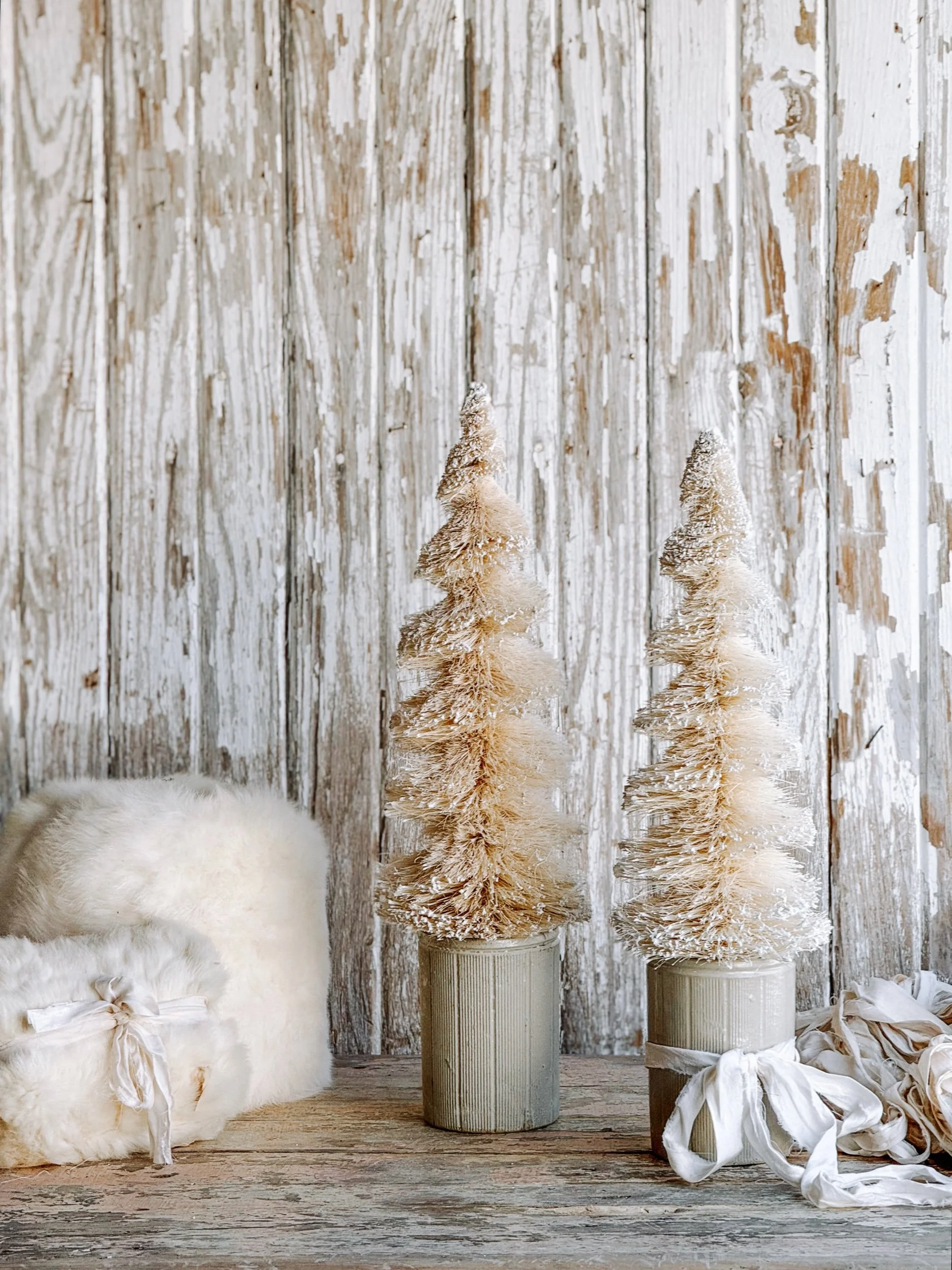 A softly aged antique European ironstone mailing pot styled with a creamy white winter tree and wrapped in recycled ribbon. The gentle, neutral tones create a timeless winter vignette that feels calm, collected, and quietly festive.