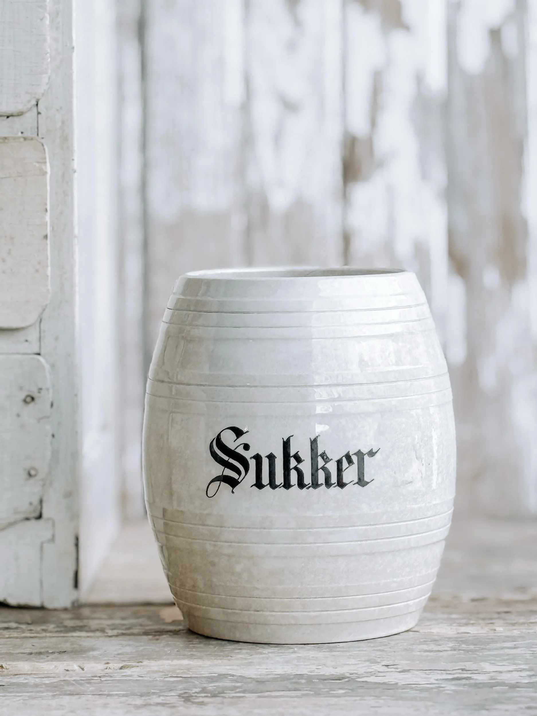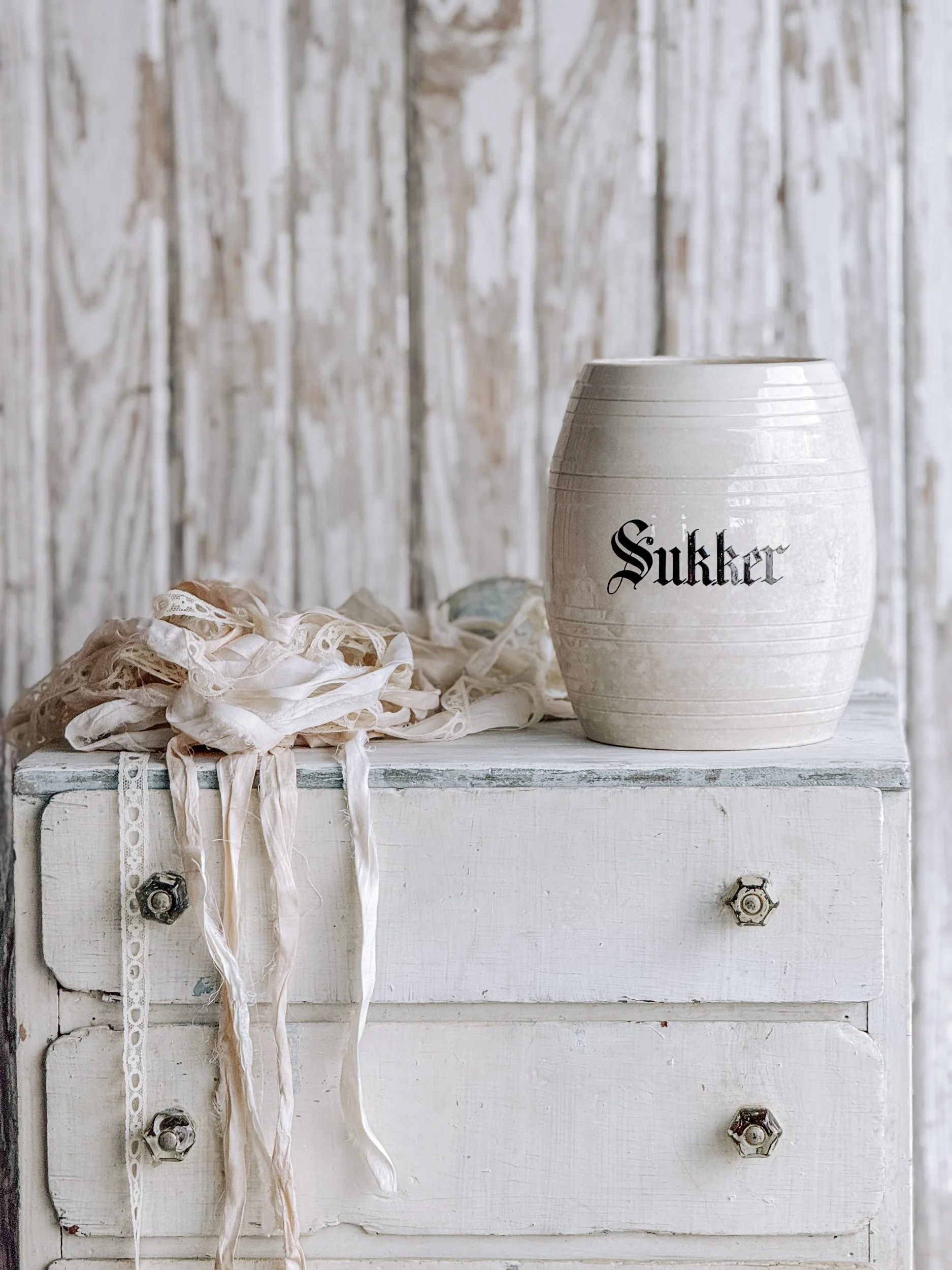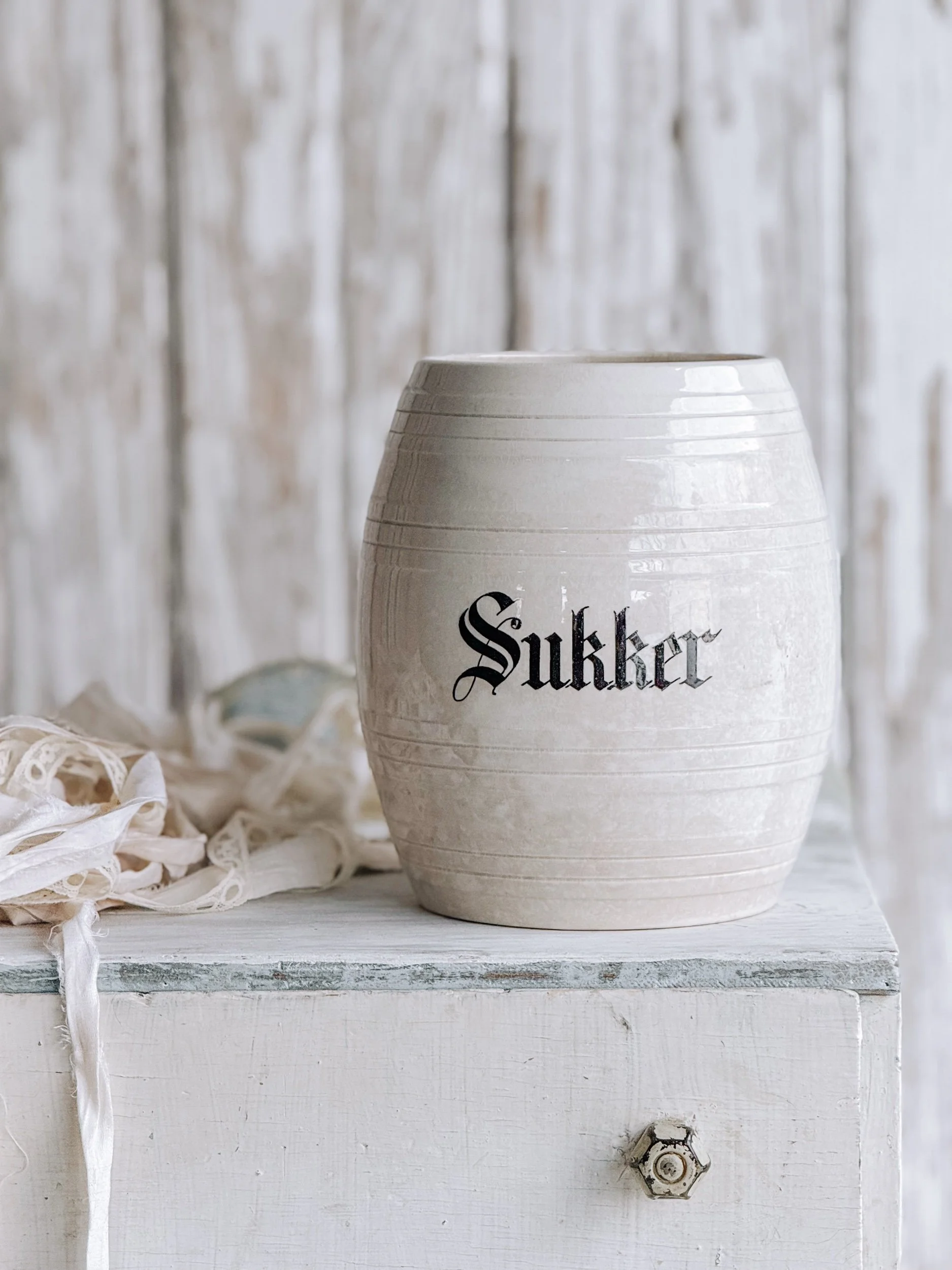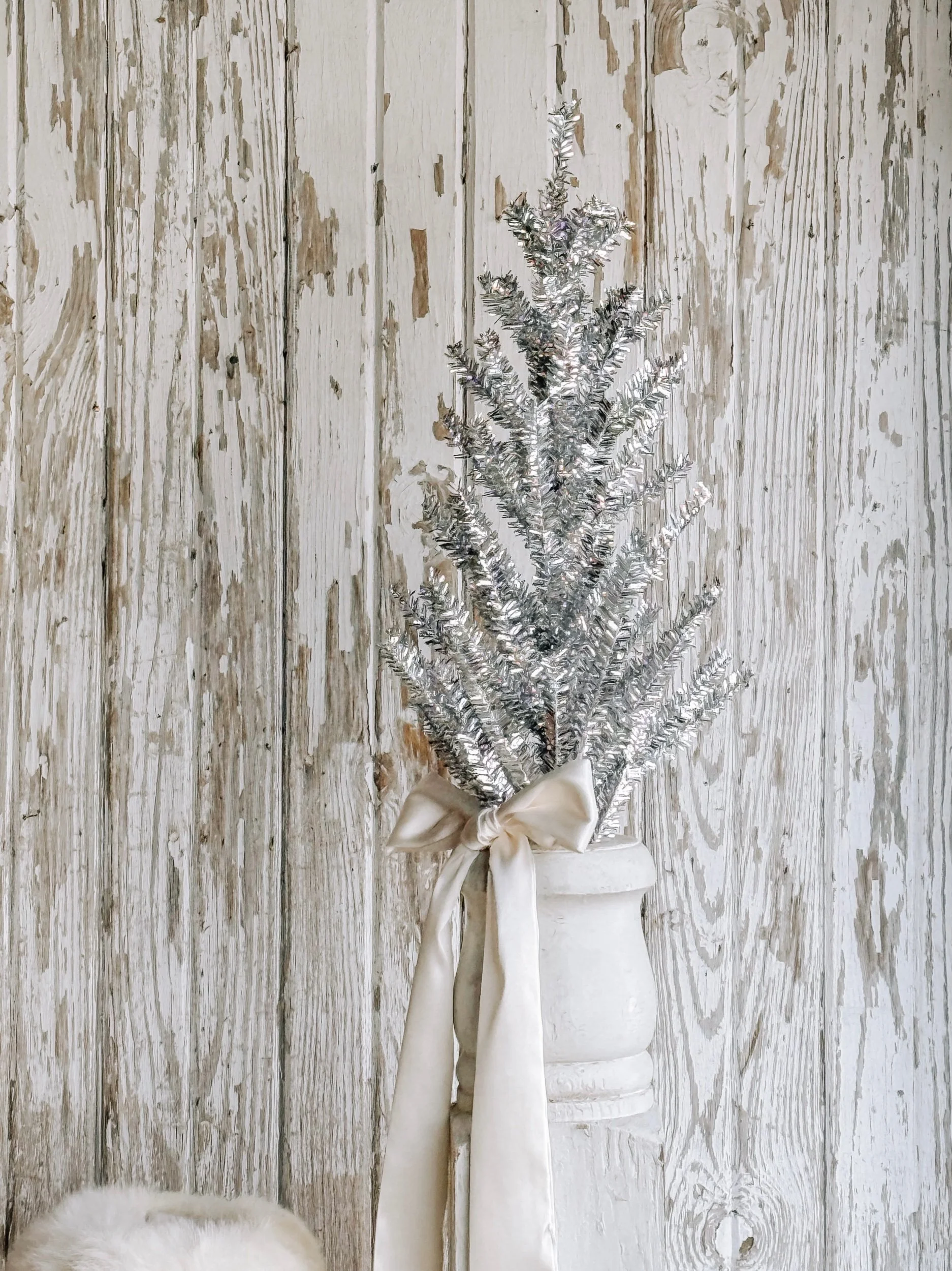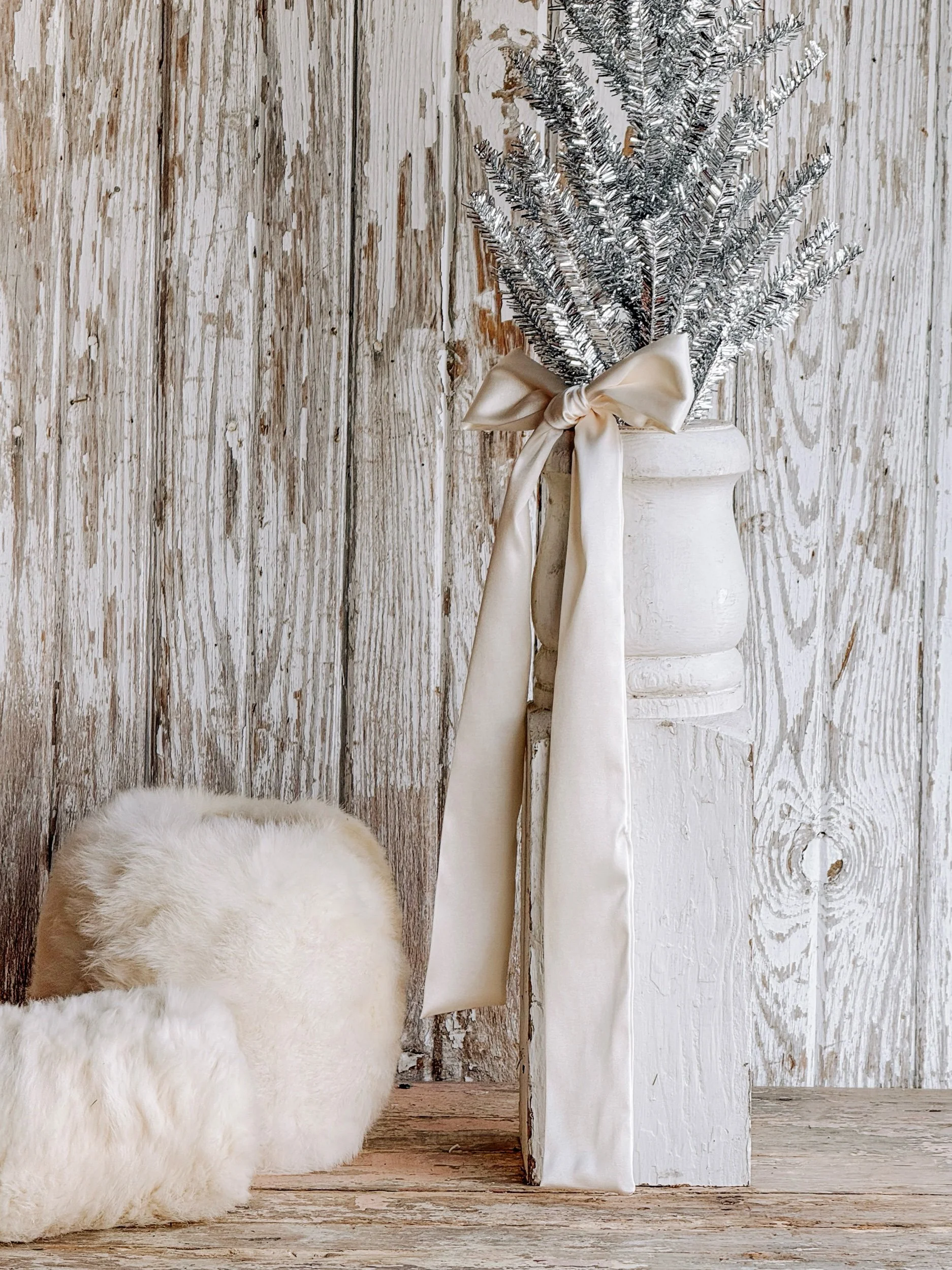 A softly aged antique European ironstone mailing pot styled with a creamy white winter tree and wrapped in recycled ribbon. The gentle, neutral tones create a timeless winter vignette that feels calm, collected, and quietly festive.