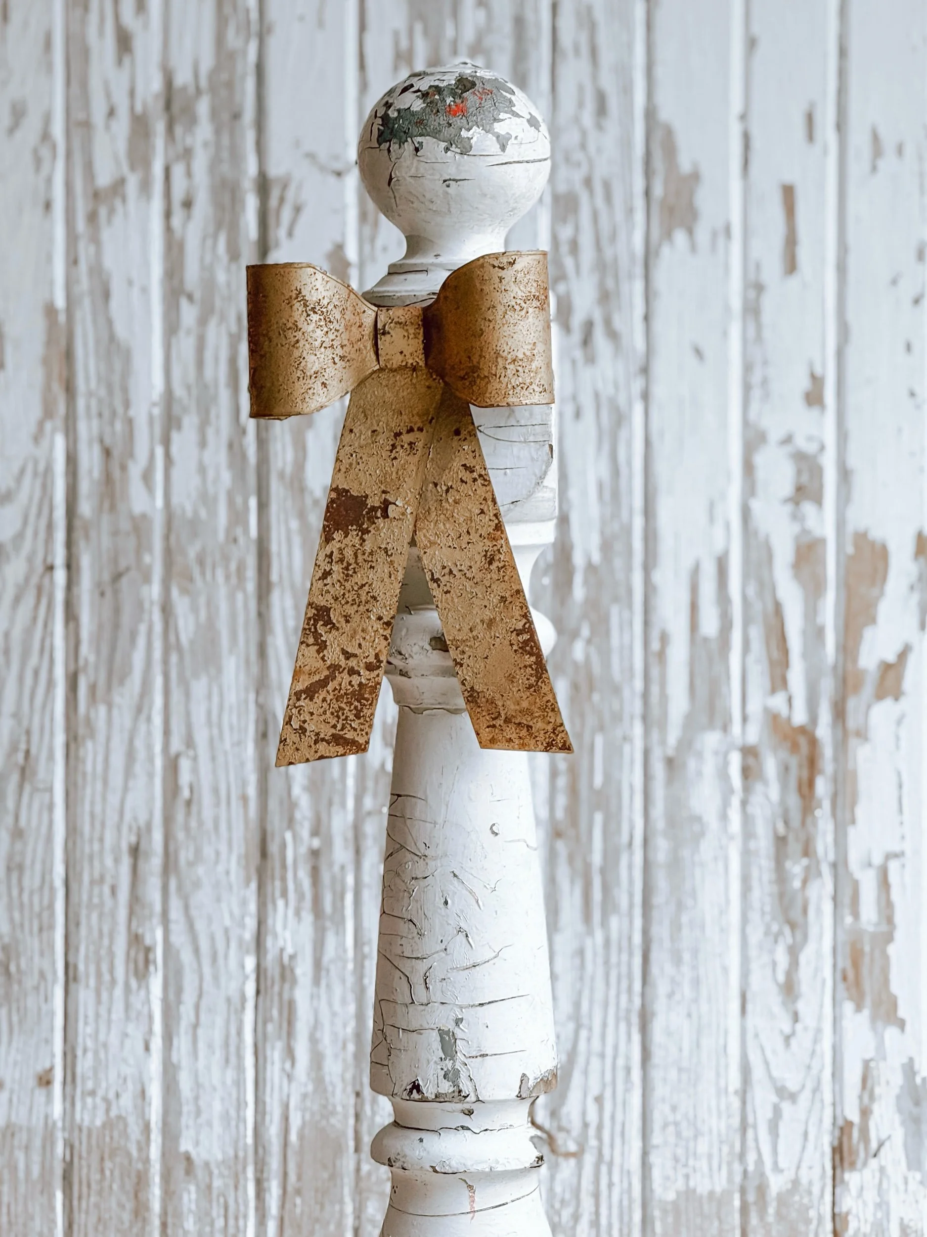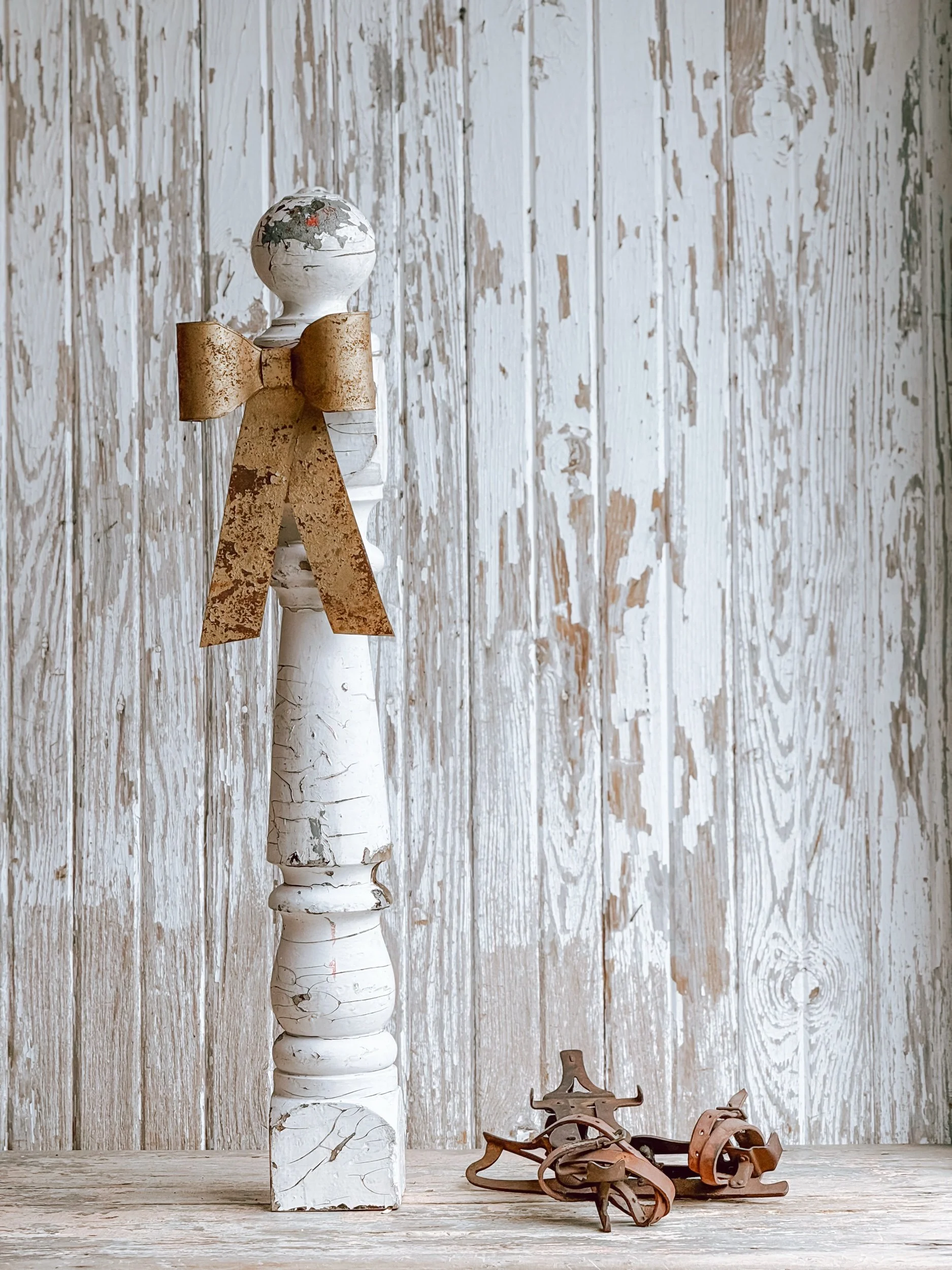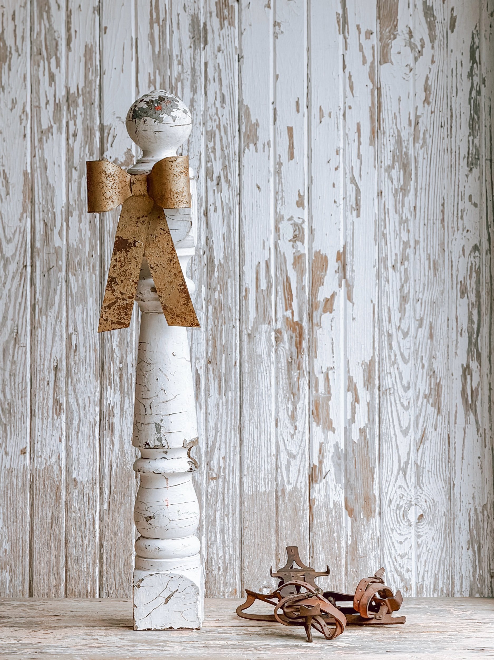 Finished with a weathered gold-toned metal bow, the post becomes a sculptural winter accent—elegant yet grounded. Its tall form makes it perfect for floor styling, entryway moments, holiday vignettes, or as a dramatic statement in a collected interior.