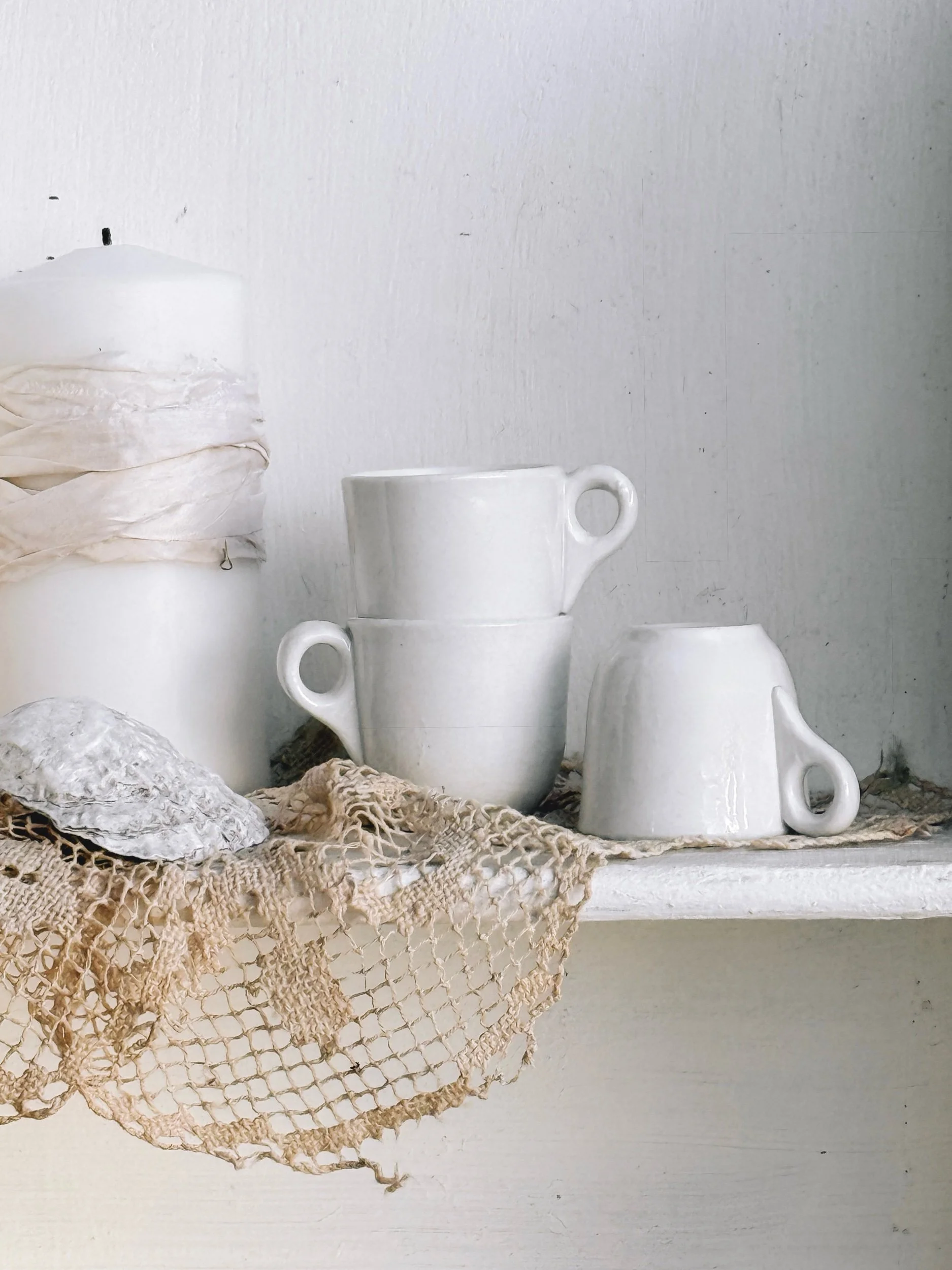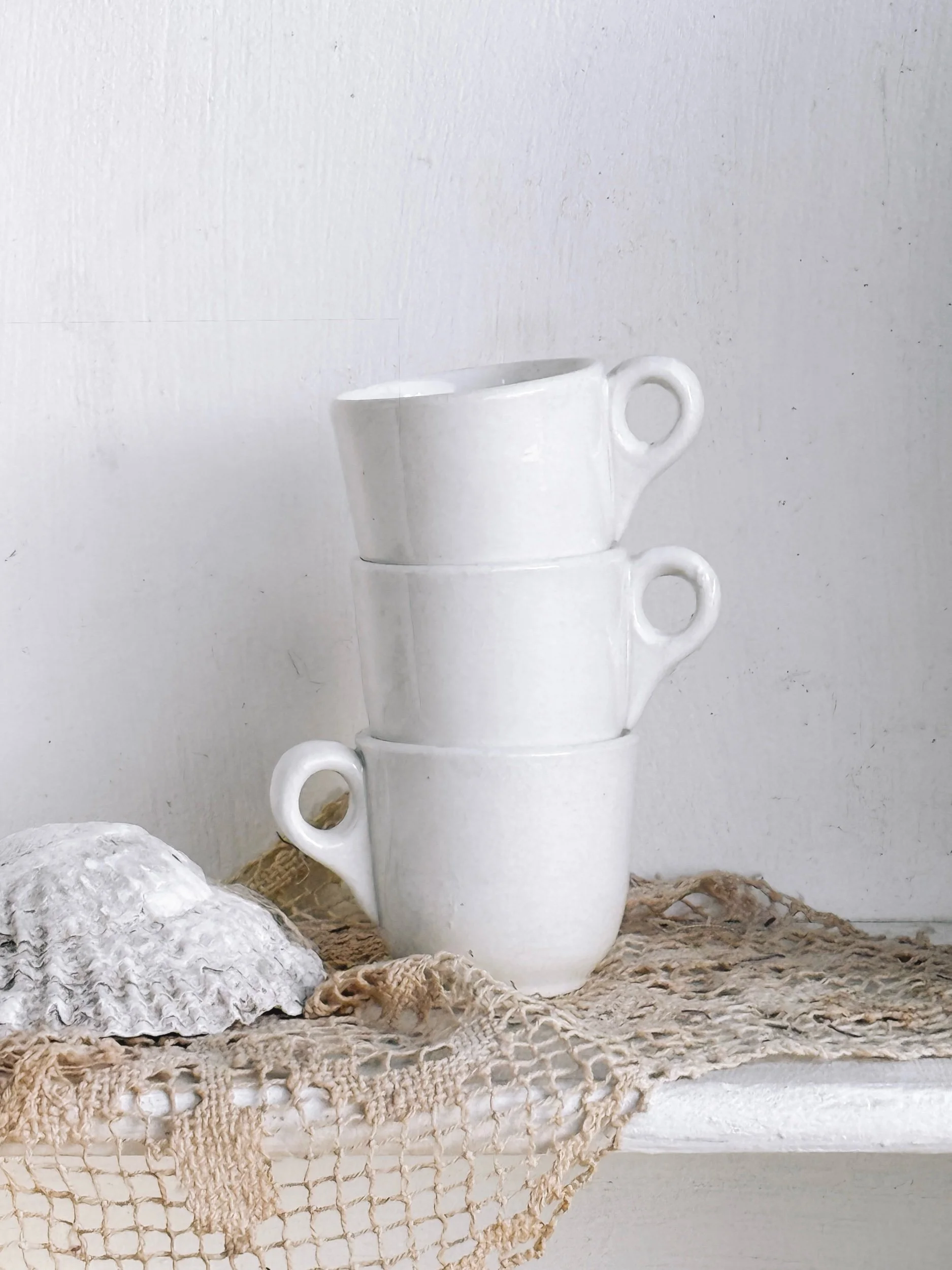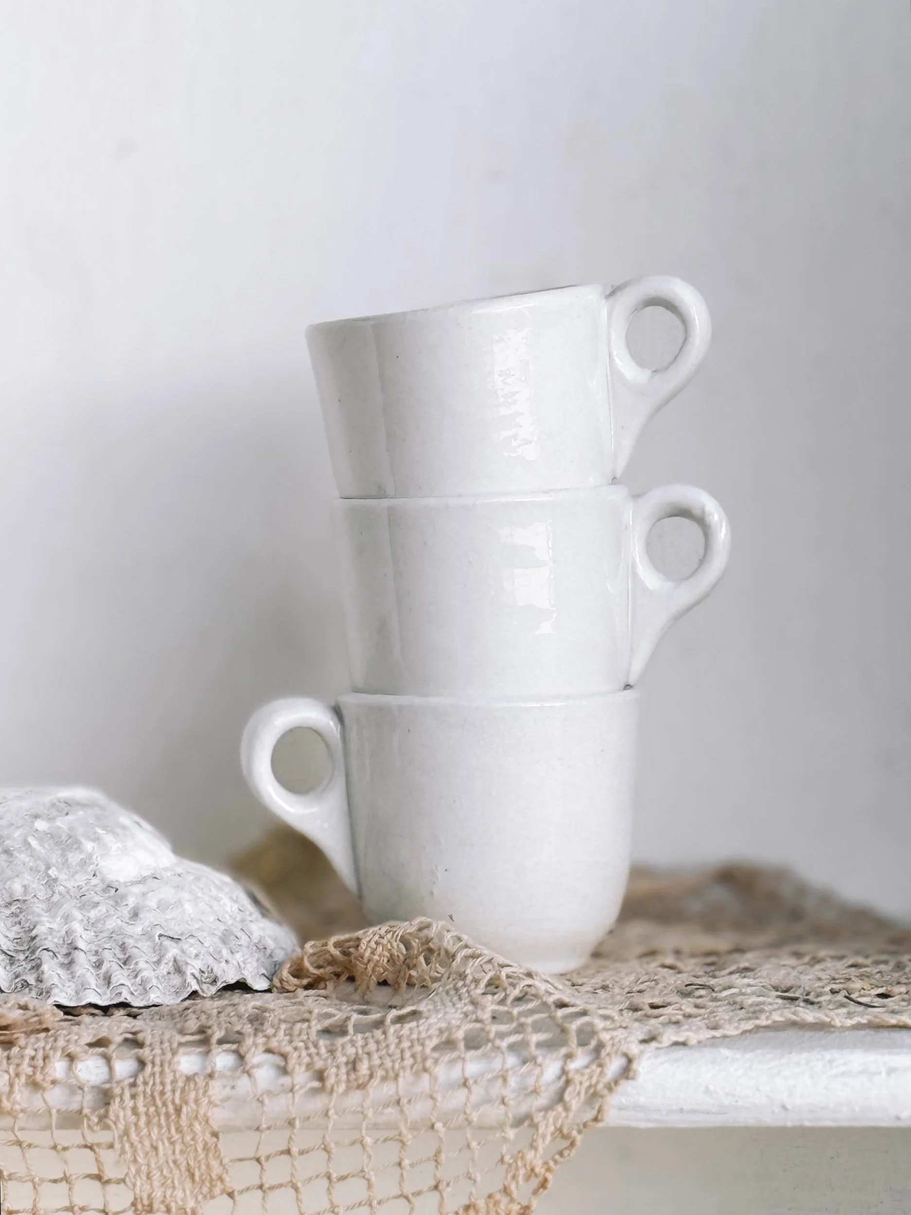 Traditionally used for warming spiced wine or spirits, these petite vessels carry a sense of old-world ritual and everyday beauty. Crafted in creamy ironstone, each cup shows a soft, timeworn patina with gentle variations that reflect their age and individuality.