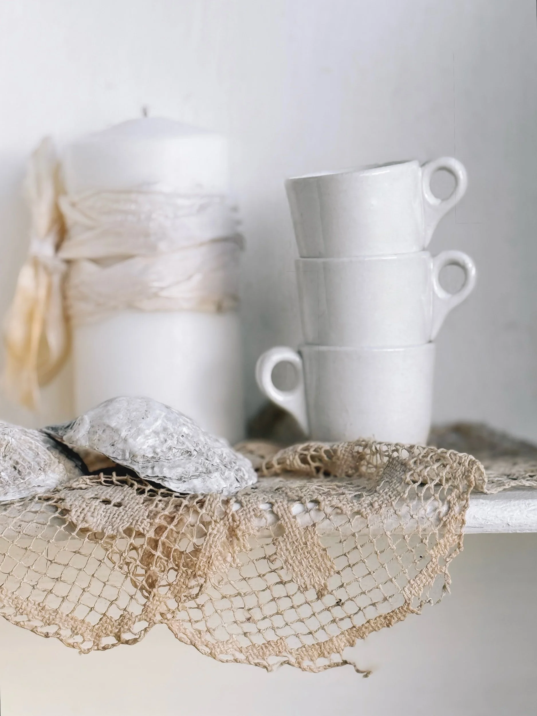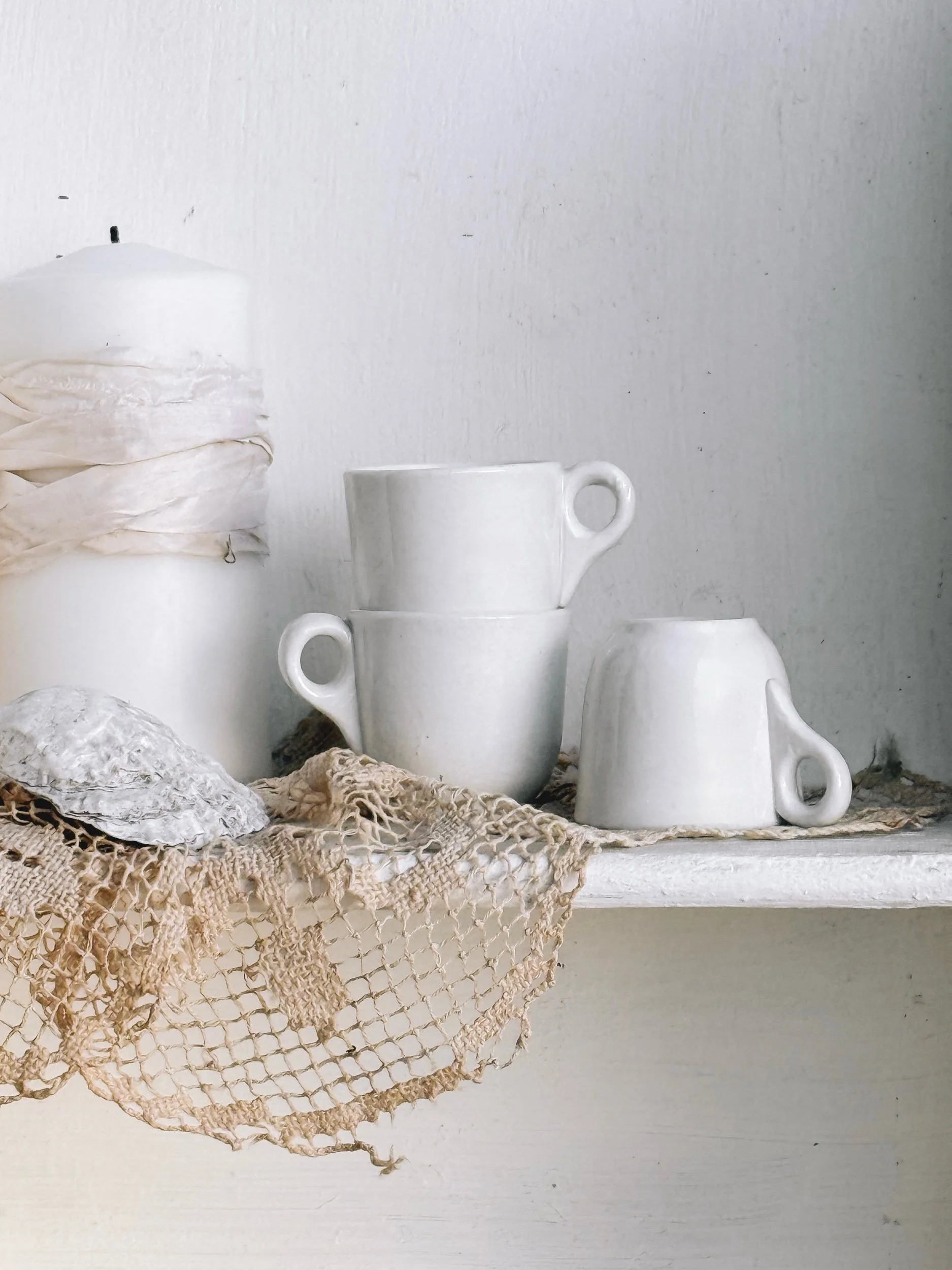 Lovely grouped on open shelving, layered beside linens and candlelight, or used as small vessels for herbs, blooms, or espresso. A beautiful way to add quiet character to a kitchen or gathered table.