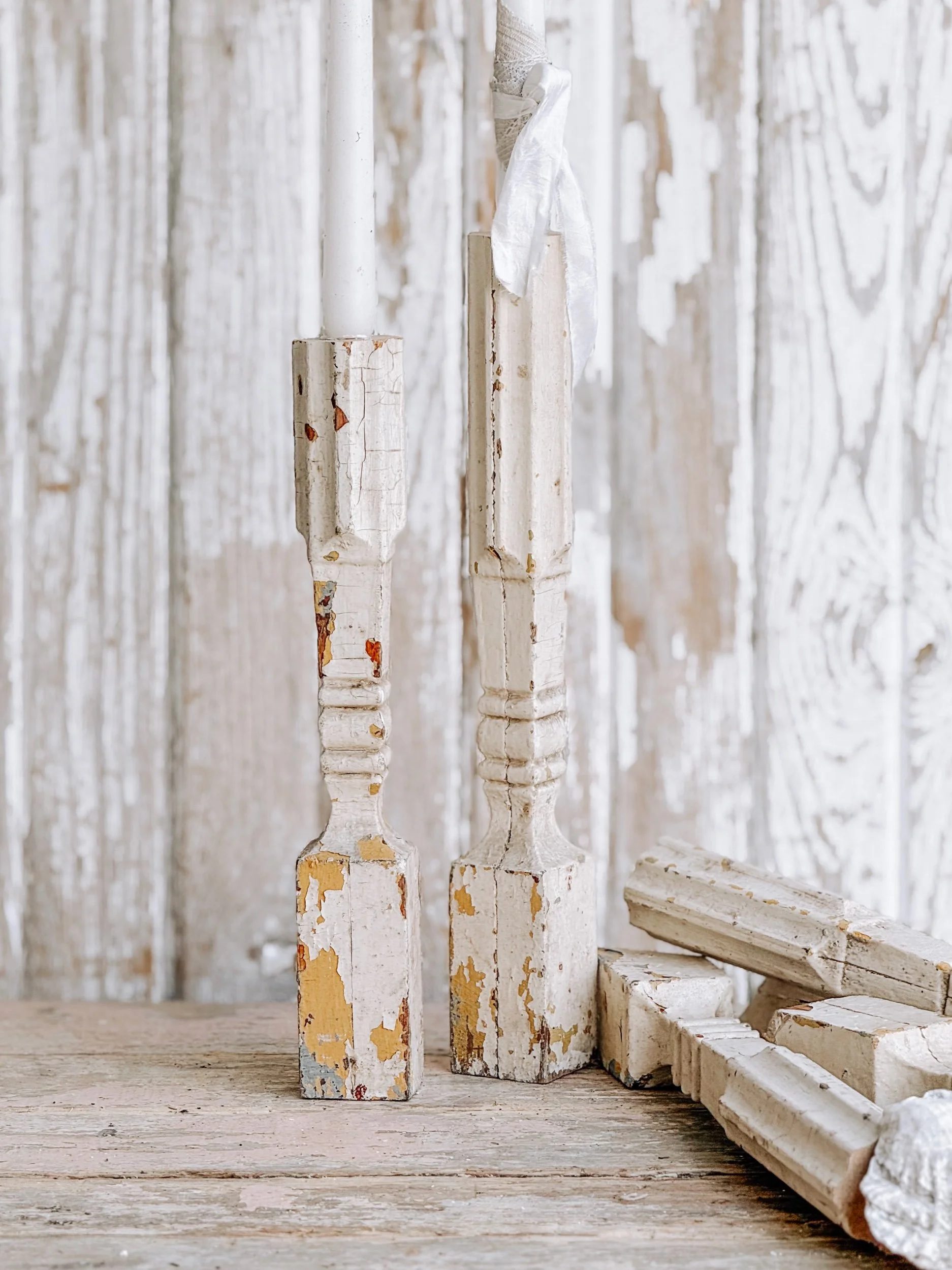 A beautiful pair of salvaged architectural fragments thoughtfully repurposed into candle holders. Each piece carries layers of aged creamy white paint with areas of natural chipping and worn wood beneath, giving them the unmistakable charm that only time can create.