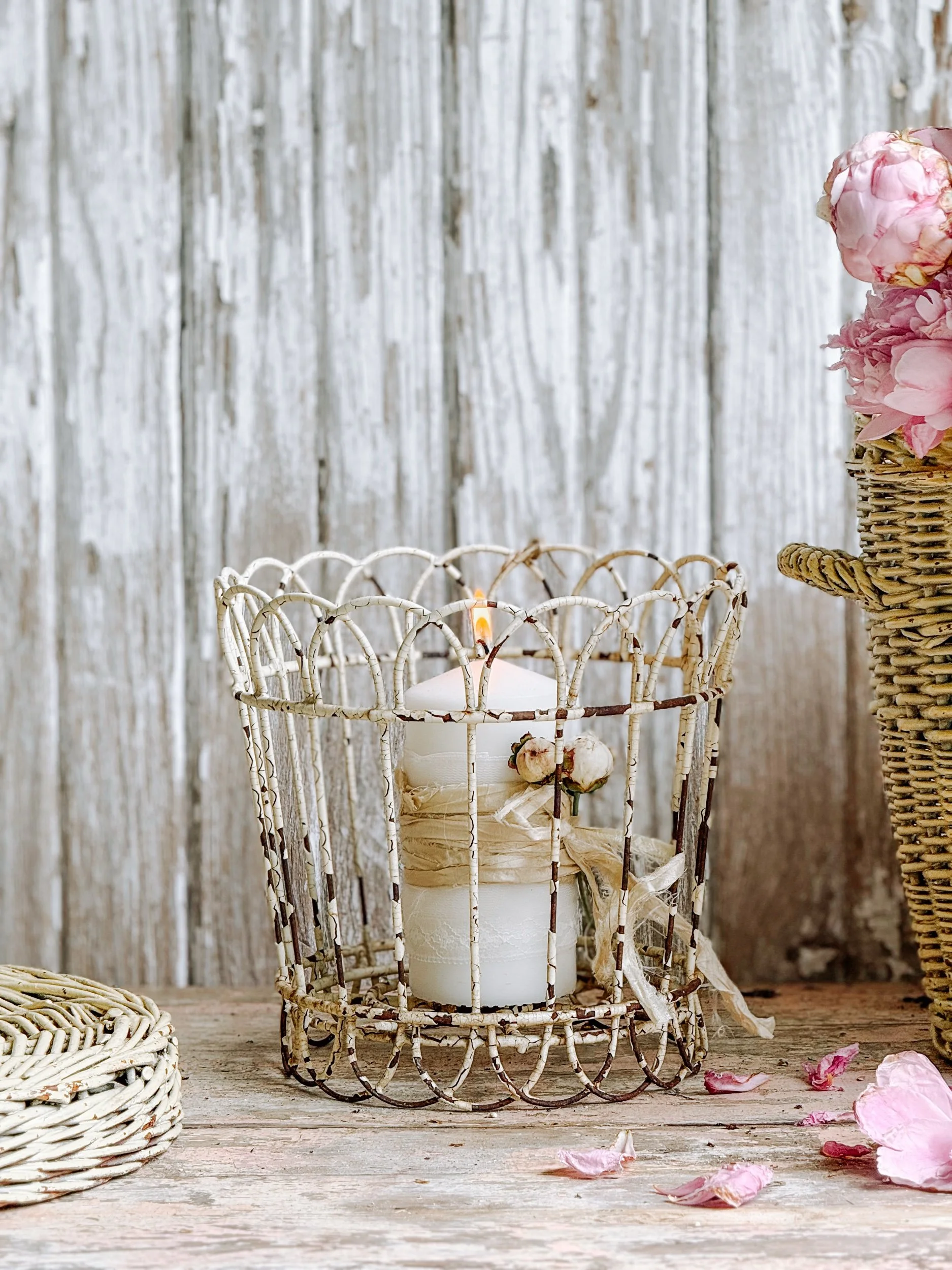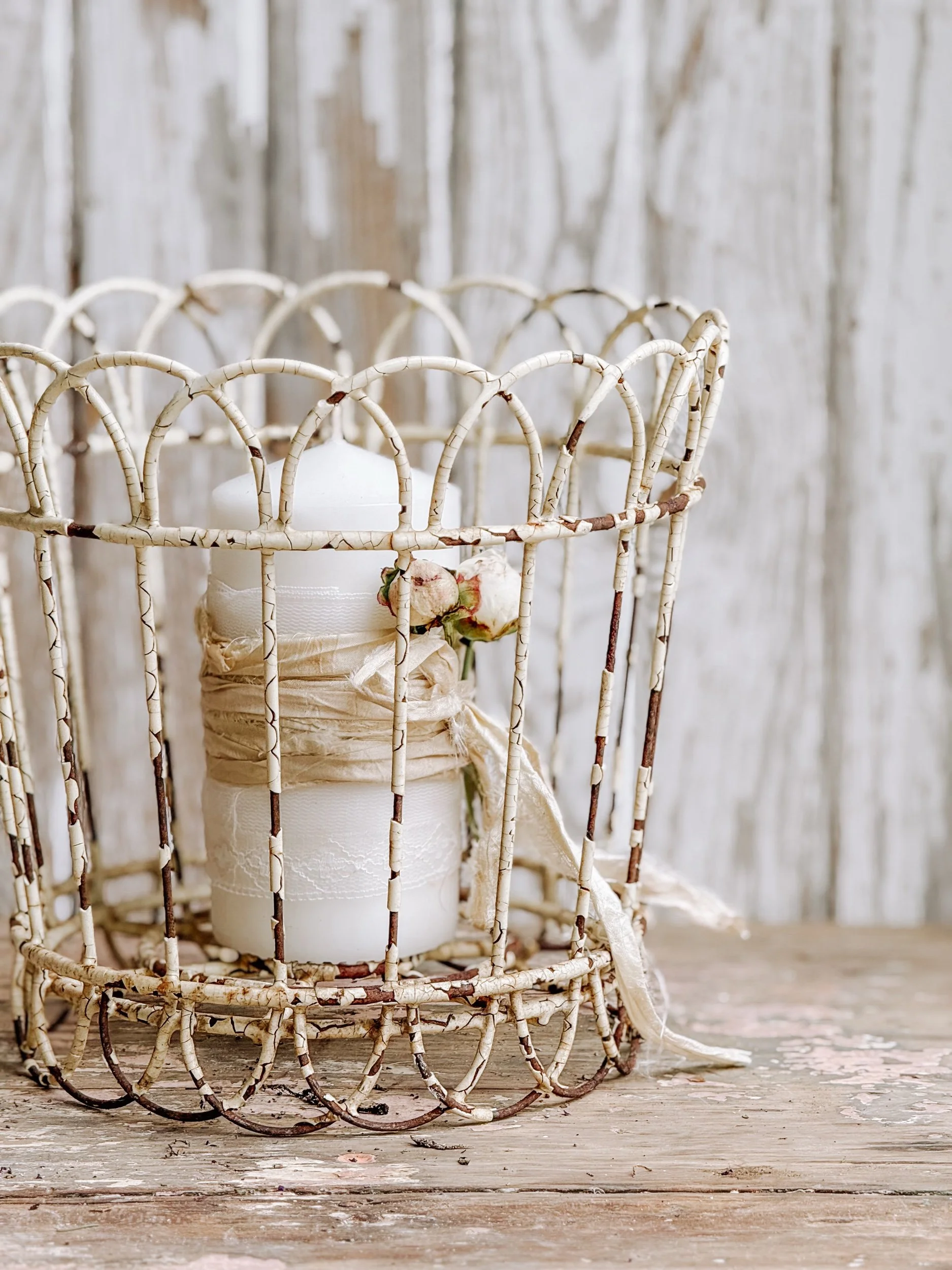 The chippy patina, subtle cracks, and warm undertones give it an old-world feel — perfect for adding texture and soul to winter tables, mantles, or collected holiday vignettes. Includes one white taper candle for immediate styling.