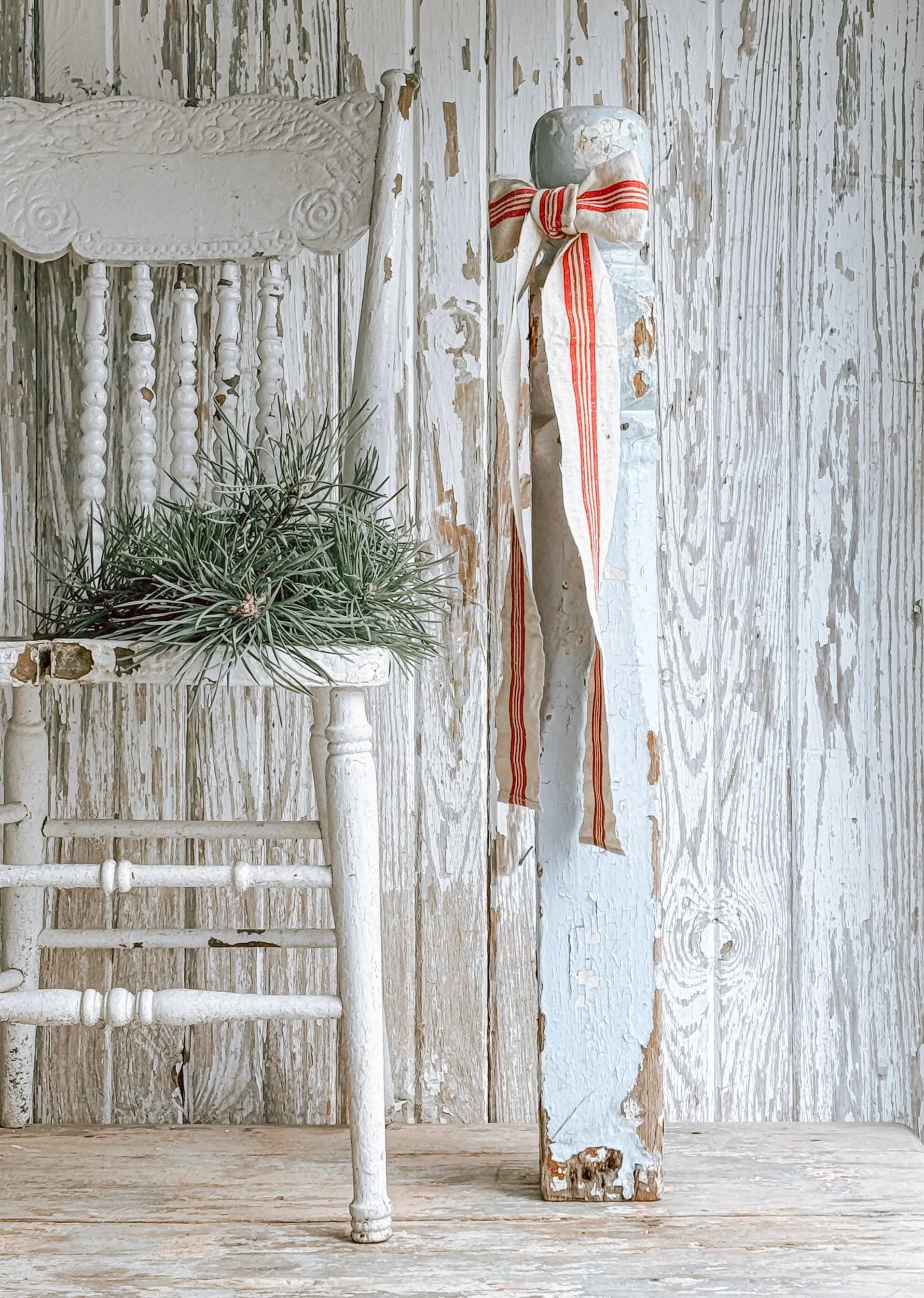 A stunning salvaged candelabra crafted from antique architectural fragments, full of weathered character and time-softened white paint. Each taper holder shows unique chippy patina and old-world charm, bringing warmth and rustic elegance to your winter styling. Finished with hand-dyed matte silk ribbon in an earthy olive tone for a quiet, collected touch.